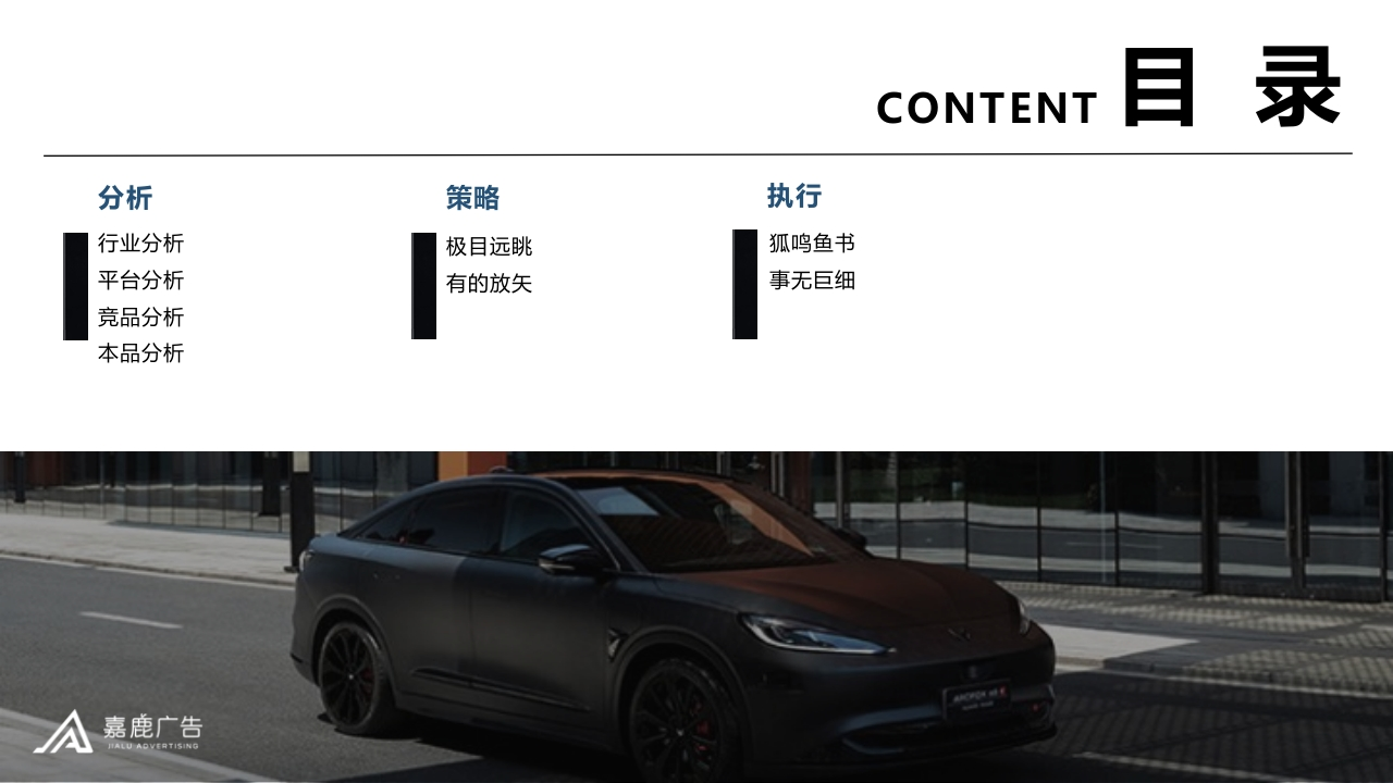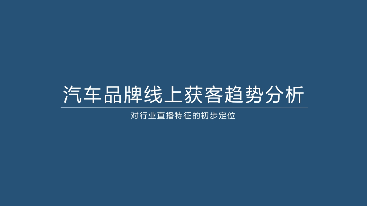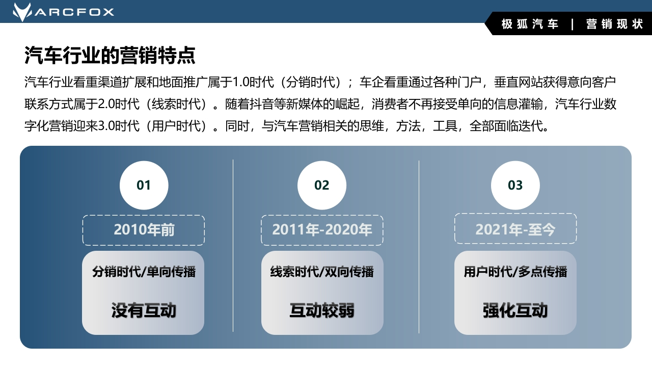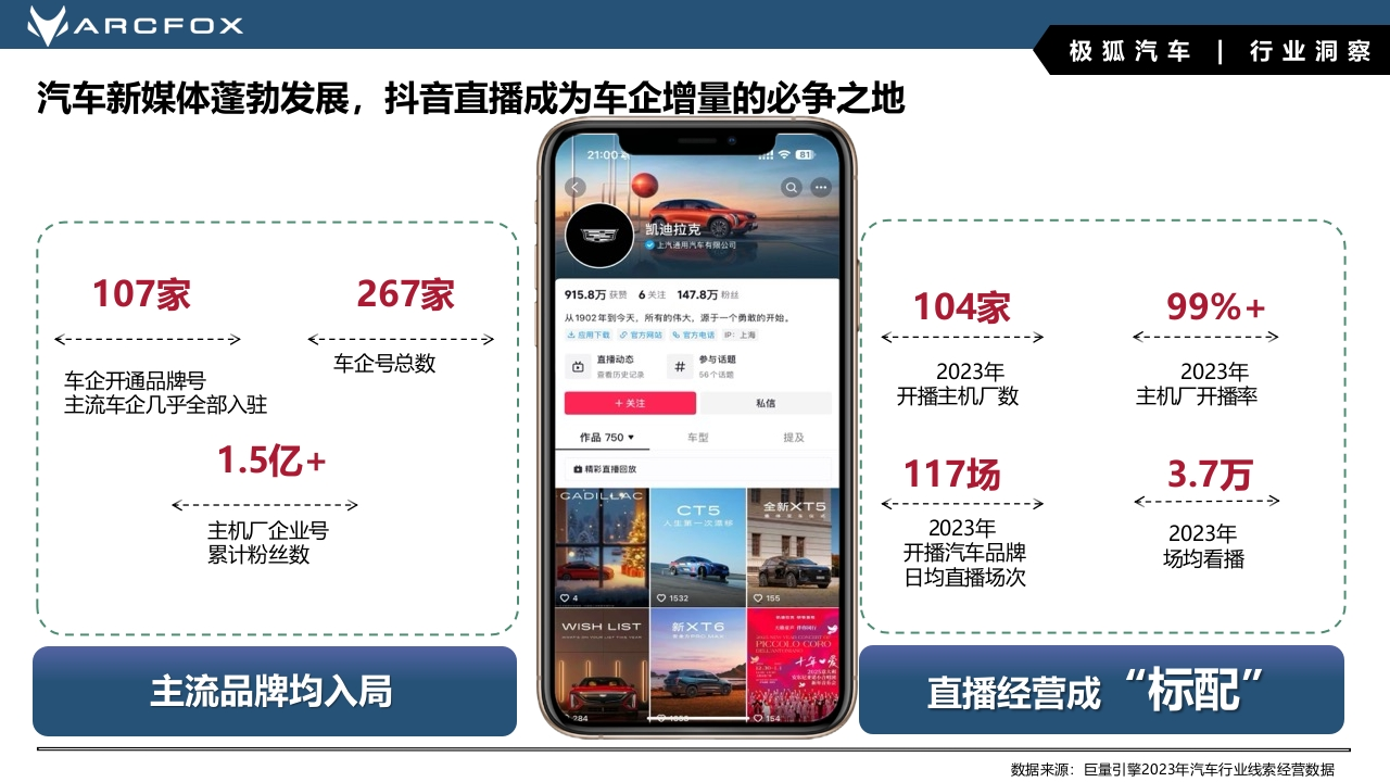 ARCFOX2025极狐品牌官方直播运营ARDFOX 8SCONTENT目录分析策略执行行业分析极目远跳狐鸣鱼书平台分析有的放矢事无巨细竞品分析本品分析嘉鹿广告分analyse i析行业分析·平台分析·竞品分析·本品分析汽车品牌线上获客趋势分析对行业直播特征的初步定位极狐汽车」营销现状汽车行业的营销特点汽车行业看重渠道扩展和地面推广属于1.0时代(分销时代);车企看重通过各种门户,垂直网站获得意向客户联系方式属于2.0时代(线索时代)。随着抖音等新媒体的崛起,消费者不再接受单向的信息灌输,汽车行业数字化营销迎来3.0时代(用户时代)。同时,与汽车营销相关的思维,方法,工具,全部面临迭代。0102032010年前2011年-2020年2021年-至今分销时代/单向传播线索时代/双向传播用户时代/多点传播没有互动互动较弱强化互动AOF▣X极狐汽车」行业洞察汽车新媒体蓬勃发展,抖音直播成为车企增量的必争之地8Q…凯迪拉克)沙上汽用车有烟公司107家267家915.8万获员6关注147.8万粉丝从1902年到今天,所有的伟大,源于一个勇散的开始。104家99%+志应用下数9营方网站马客方电话P:上海-->车企号总数直桶动态#参与话题车企开通品牌号章着历史记录50个话聊2023年2023年主流车企几乎全部入驻+关注私信开播主机厂数主机厂开播率作品750,车型提及1.5亿+精彩直放117场3.7万ADILLACCT5全新XT5主机厂企业号2023年2023年累计粉丝数开播汽车品牌场均看播日均直播场次21532155WISH LIST主流品牌均入局直播经营成“标配”数据来源:巨量引擎2023年汽车行业线索经营数据