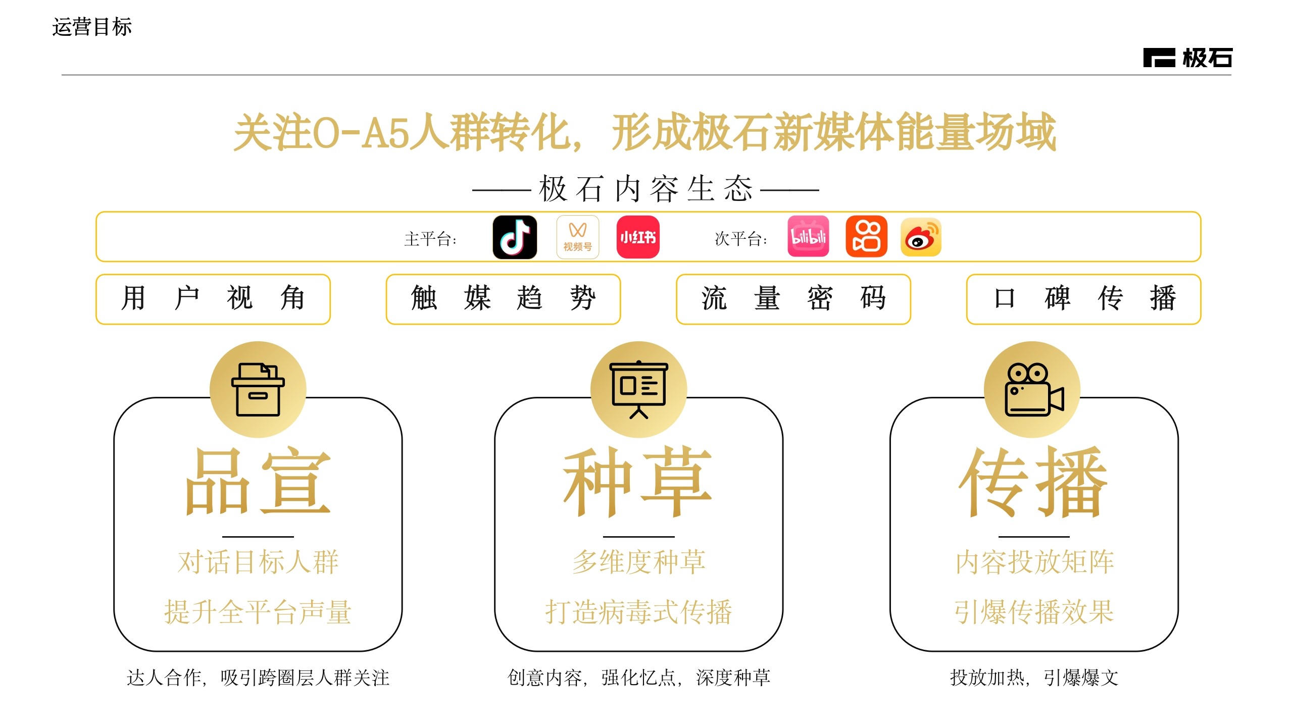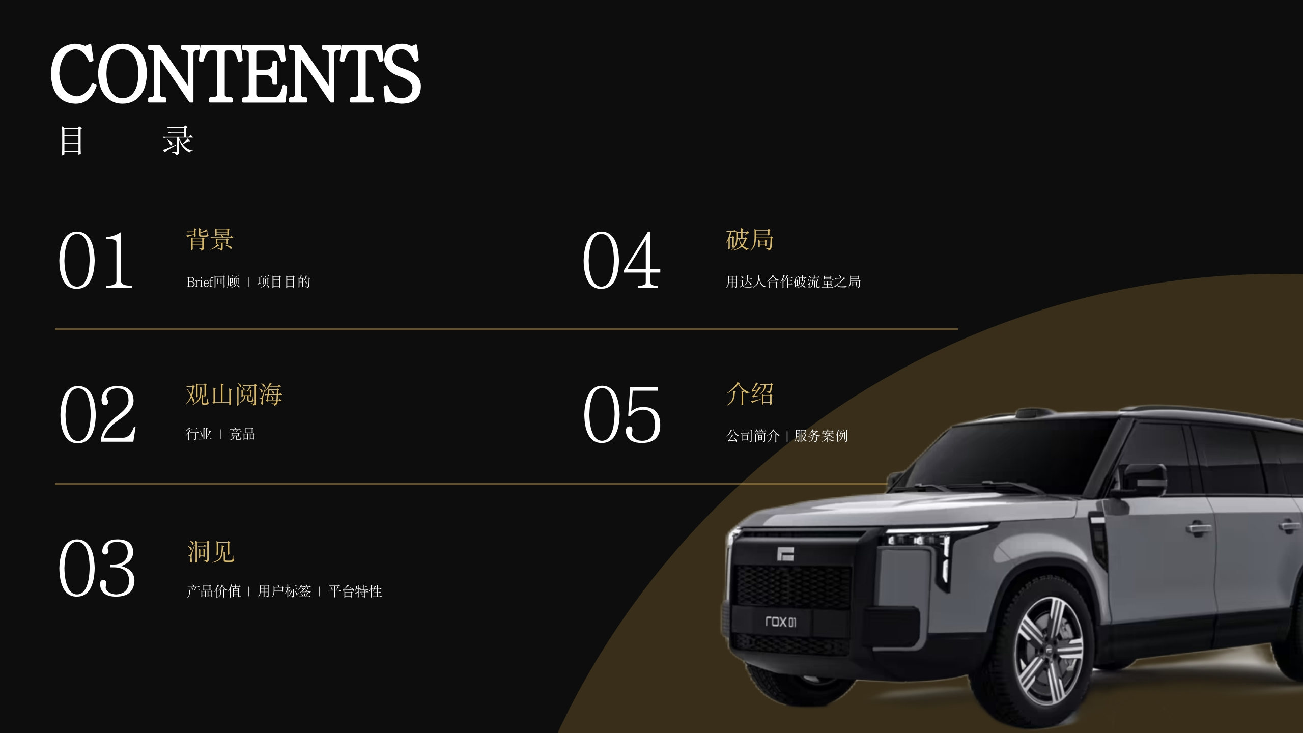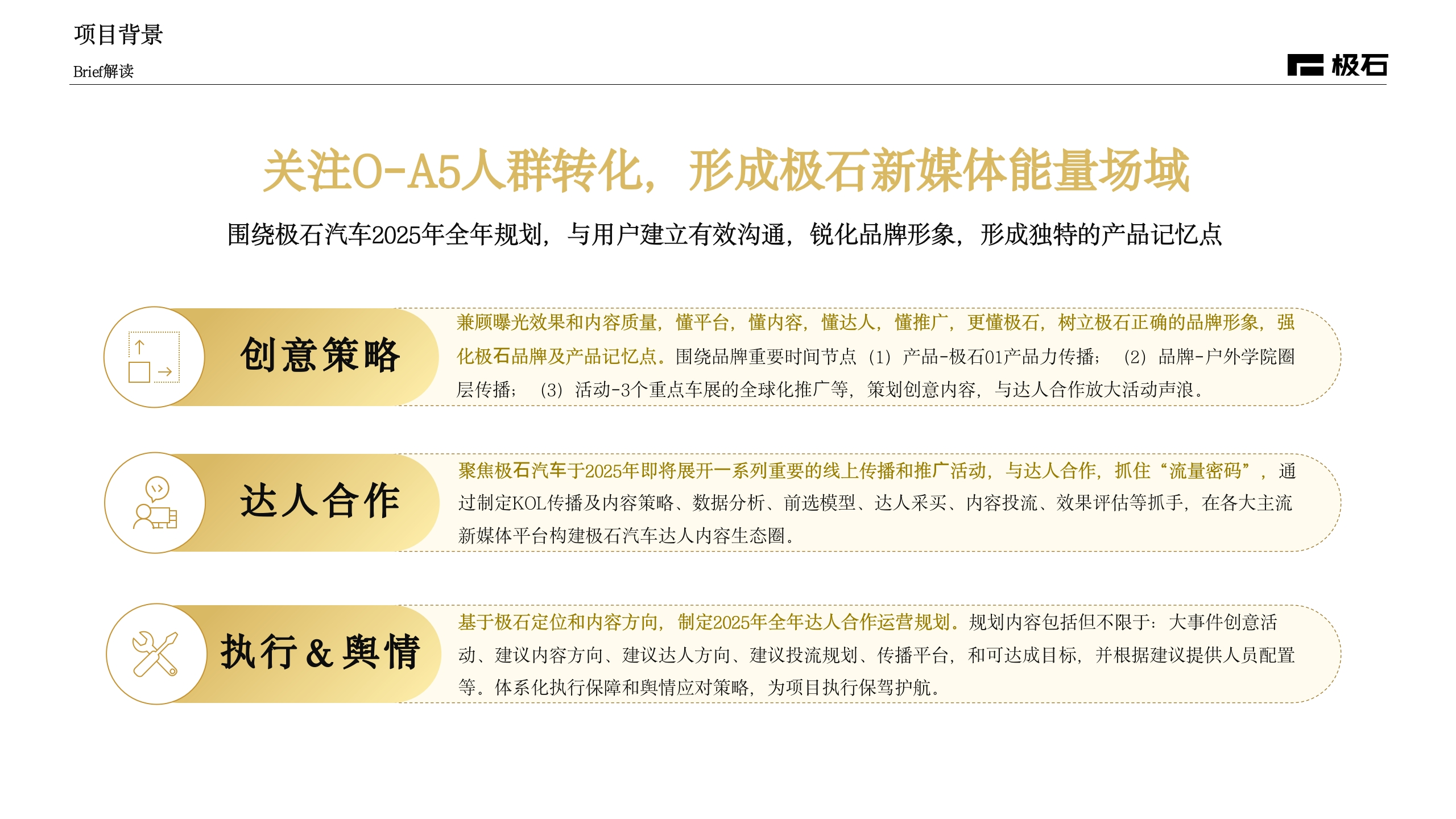 己极石极石汽车2025社交媒体达人合作传播VERSION带着家人去远行1.0CONTENTS目录01背景04破局Briefl回顾I项目目的用达人合作破流量之局02观山阅海介绍行业1竞品05公司简介!服务案例03洞见日产品价值!用户标签!平台特性roxo01ART背景B r ie f回顾L项目目的项目背景Brieff解读己极石关注O-A5人群转化,形成极石新媒体能量场域围绕极石汽车2025年全年规划,与用户建立有效沟通,锐化品牌形象,形成独特的产品记忆点兼顾曝光效果和内容质量,懂平台,懂内容,懂达人,懂推广,更懂极石,树立极石正确的品牌形象,强创意策略化极石品牌及产品记忆点。围绕品牌重要时间节点(1)产品-极石01产品力传播;(2)品牌-户外学院圈层传播;(3)活动-3个重点车展的全球化推广等,策划创意内容,与达人合作放大活动声浪。聚焦极石汽车于2025年即将展开一系列重要的线上传播和推广活动,与达人合作,抓住“流量密码”,通⊙达人合作过制定KOL传播及内容策略、数据分析、前选模型、达人采买、内容投流、效果评估等抓手,在各大主流新媒体平台构建极石汽车达人内容生态圈。基于极石定位和内容方向,制定2025年全年达人合作运营规划。规划内容包括但不限于:大事件创意活执行&奥情动、建议内容方向、建议达人方向、建议投流规划、传播平台,和可达成目标,并根据建议提供人员配置等。体系化执行保障和舆情应对策略,为项目执行保驾护航。运营目标己极石关注0-A5人群转化,形成极石新媒体能量场域极石内容生态主平台:小红书视频号次平台:O用户视角触媒趋势流量密码口碑传播合品宣种草传播对话目标人群多维度种草内容投放矩阵提升全平台声量打造病毒式传播引爆传播效果达人合作,吸引跨圈层人群关注创意内容,强化忆点,深度种草投放加热,引爆爆文0.2T观山阅海行业1竞品