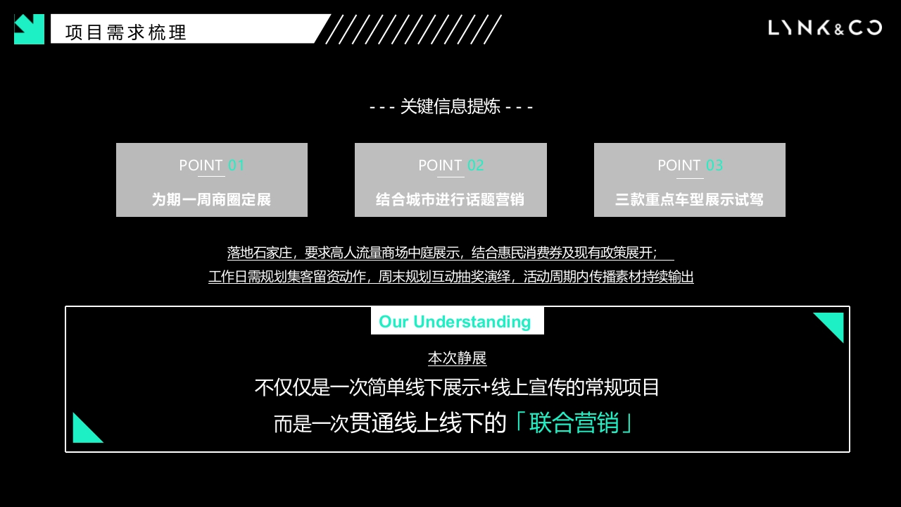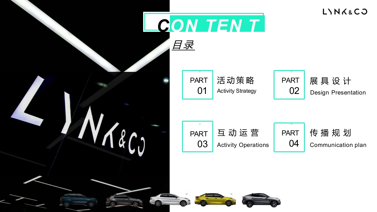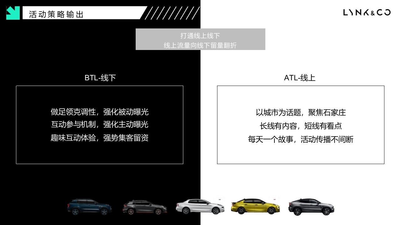LNX&COPersonal Open ConnectedLet's start领克汽车wc时全系商圈主题静展LYNK COChanging Mobility Forever留LNX&COCON TEN T目录PART活动策略PART展具设计01Activity Strategy02Design PresentationPART互动运营PART传播规划03Activity Operations04Communication planLNX&COONE活动策略从项目需求切入,确定核心目标,导出策略方向项目需求梳理LNX&CO--关键信息提炼-·POINT O1POINT 02POINT 03为期一周商圈定展结合城市进行话题营销三款重点车型展示试驾落地石家庄,要求高人流量商场中庭展示,结合惠民消费券及现有政策展开:工作日需规划集客留资动作,周末规划互动抽奖演绎,活动周期内传播素材持续输出Our Understanding本次静展不仅仅是一次简单线下展示+线上宣传的常规项目而是一次贯通线上线下的「联合营销」明确核心目标LNX&CO2017-2019年全年上险走势2020年1-5月上险走势250000=201720182019—占比14.00%12000012.00%20000010000010.00%800001500008.00%600001000006.00%400004.00%500002.00%2000000.00%01月2月3月4月5月6月7月8月9月10月11月12月1月2月3月4月5月6月下旬-8月进入汽车销售淡季,希望依托本次静展达成品牌调性宣传·产品提高曝光·收集潜客线索为订单转化夯实客户及口碑基础活动策略输出HHI八LNX&CO打通线上线下线上流量向线下留量翻折BTL线下ATL-线上做足领克调性,强化被动曝光以城市为话题,聚焦石家庄互动参与机制,强化主动曝光长线有内容,短线有看点趣味互动体验,强势集客留资每天一个故事,活动传播不间断