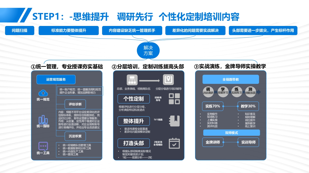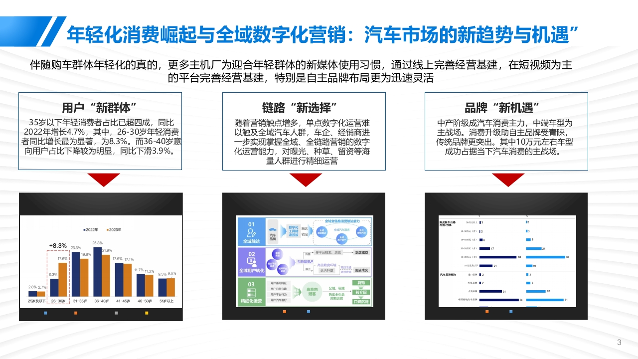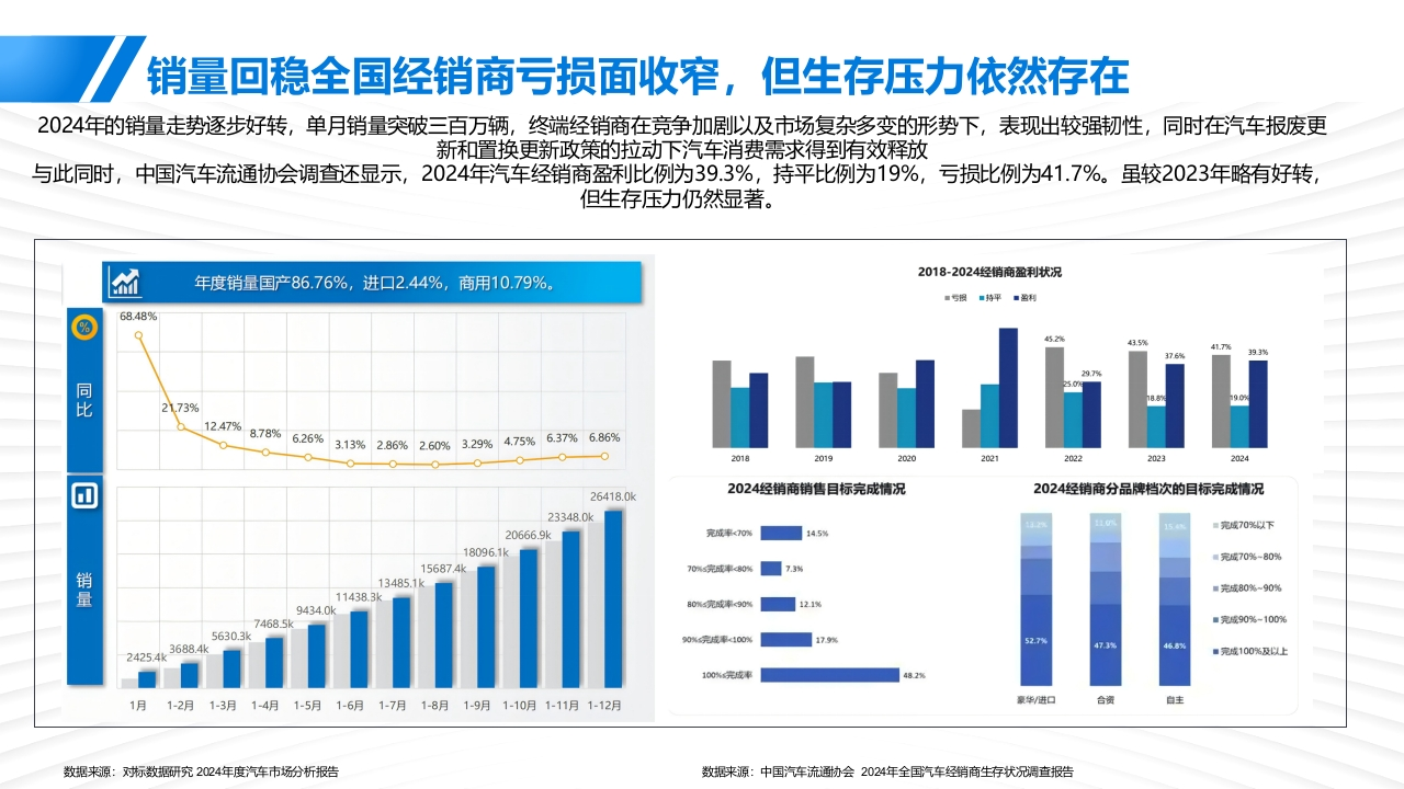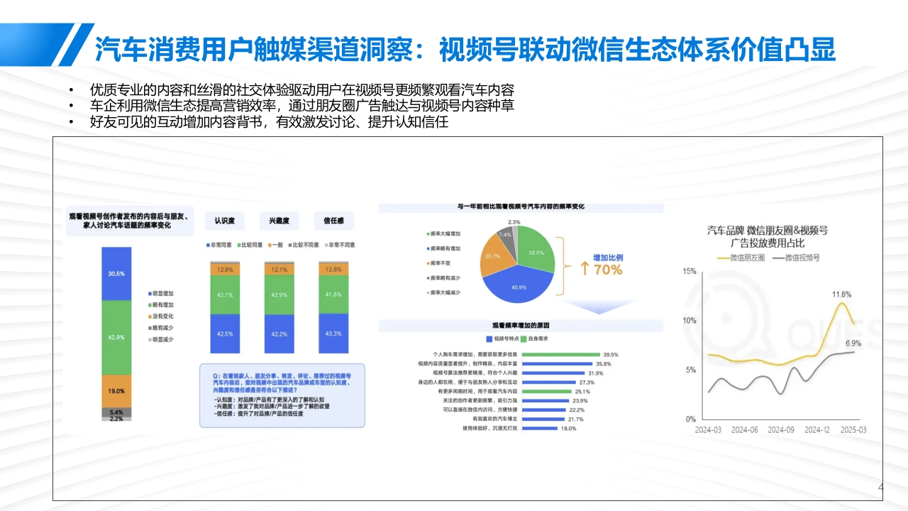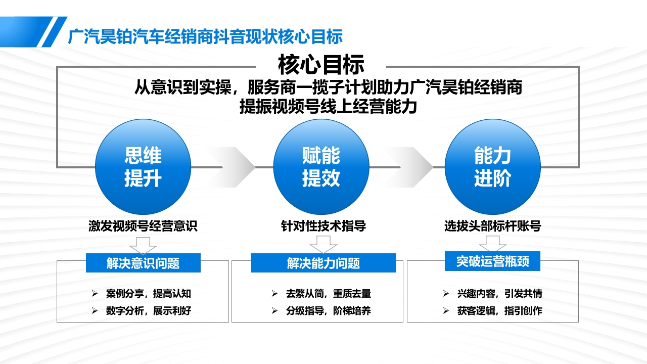 2025广汽铂昊经销商视频号运营方案2025.07销量回稳全国经销商亏损面收窄,但生存压力依然存在2024年的销量走势逐步好转,单月销量突破三百万辆,终端经销商在竞净加剧以及市场复杂多变的形势下,表现出较强韧性,同时在汽车报废更新和置换更新政策的拉动下汽车消费需求得到有效释放与此同时,中国汽车流通协会调查还显示,2024年汽车经销商盈利比例为39.3%,持平比例为19%,亏损比例为41.7%。虽较2023年略有好转,但生存压力仍然显著。2018-2024经销商盈利状况年度销量国产86.76%,进口2.44%,商用10.79%。■与损■持平■盈利68.48%昆2173%1247%878%626%313%286%260%329%475%637%686%bbd iHii●-00回26418.0k2024经销商销售目标完成情况2024经销商分品牌档次的目标完成情况23348.0k=完成70%以下20666.9k完成率<70%】14.5%18096.1k■完成70%-80%156874k70%s完成率80%73%13485.1k■完成80%~90%量11438.3k9434.0k0%完威率90%121%7468.5k■完成90%-100%5630.390%完成率d00%179%5272425.4k36884k47346■完域100%及以上100%完成率4821月1-2月1-3月1-4月1-5月1-6月1-7月1-8月1-9月1-10月1-11月1-12月蒙华/进口合自主数据来源:对标数据研究2024年度汽车市场分析报浩数据来源:中国汽车流卧协会2024年全国汽车经销商生存状况调查报浩年轻化消费崛起与全域数字化营销:汽车市场的新趋势与机遇”伴随购车群体年轻化的真的,更多主机厂为迎合年轻群体的新媒体使用习惯,通过线上完善经营基建,在短视频为主的平台完善经营基建,特别是自主品牌布局更为迅速灵活用户“新群体”链路“新选择”品牌“新机遇”35岁以下年轻消费者占比已超四成,同比随着营销触点增多,单点数字化运营难中产阶级成汽车消费主力,中端车型为2022年增长4.7%,其中,26-30岁年轻消费以触及全域汽车人群,车企、经销商进主战场。消费升级助自主品牌受青睐,者同比增长最为显著,为8.3%。而36-40岁意步实现掌握全域、全链路营销的数字传统品牌更突出。其中10万元左右车型向用户占比下降较为明显,同比下滑3.9%。化运营能力,对曝光、种草、留资等海成功占据当下汽车消费的主战场。量人群进行精细运营01是5性格物上口■2022年■2023年8金垃触达■250+8.3%卷w211订■24.902176176%171引号蓝烫P1.37.5%96全域用户转化03g进口是第看2■3用广基世料复购外酒显情128%2.703用户行第风惠公域.题域P平行为介超25w及以下L26-30_31-35岁35-40岁41-45岁46-50岁51岁以上3汽车消费用户触媒渠道洞察:视频号联动微信生态体系价值凸显优质专业的内容和丝滑的社交体验驱动用户在视频号更频繁观看汽车内容车企利用微信生态提高营销效率,通过朋友圈广告触达与视频号内容种草好友可见的互动增加内容背书,有效激发讨论、提升认知信任与一年丽相比观看视频号汽车内客的限率变化观看视频号创作者发布的内容后与朋友、家人讨论汽车话题的领率变化认识度兴趣度信任感2.3%▣频率大恒增地汽车品牌微信朋友圈&视频号■非第同意■比较同意·一般■比较不同意■非常不司娘。聚率略有增如广告投放费用占比增加比例一微信阴友圈一微信视频号■顿率不变1289%2.1%12.8%30.5%70%15%·装率野有减少40.9■明显增加42.1%429%41.6%率大幅减少11.8%■略有增加■没有变化■略有减少观看颜率增加的原因10%429%425%42.2%4339%■明显减少■规领号特点■自身黄球个人购车周求增加,需要获取更家依息■395%视内容显著资升,制作精良。内容丰■35.8%视领号真法粗草更精准,符合个人兴则■319%5%器身边的人在用,便于与用友人分和互动273%19.0%有更家闲服时同,用于风看汽车内容25.1%盟:提7品关注的创作香更新领聚,吸引力强239%可以直罐在微信内透同,方便快县■22.2%信任感:惯升了对品牌/产品的信任度有我高欢的汽车棒主21.7%0%使用体验好,沉漫无打就18.0%2024-032024-062024-092024-122025-03广汽昊铂汽车经销商抖音现状核心目标核心目标从意识到实操,服务商一揽子计划助力广汽吴铂经销商提振视频号线上经营能力思赋能能力提升提效进阶激发视频号经营意识针对性技术指导选拔头部标杆账号解决意识问题解决能力问题突破运营瓶颈>案例份享,提高认知去繁从简,重质去量兴趣内容,引发洪情>数字分析,展示利好>分级指导,阶梯培养>获客逻辑,指引创作STEP1:-思维提升调研先行个性化定制培训内容问题扫描标准能力要整体提升内容建设缺乏统一管理抓手差异化的问题需要实战解决头部需要进一步拔尖,产生标杆作用解决方案①统一管理,专业授课夯实基础②分层培训,定制训练拔高头部③实战演练,金牌导师实操教学运营规范服务全链路带教统一账户规范:统一直蹈流程和规范总部、业务条线、经销商队伍分层分级进行培创辅导调学练提升企业形象,塔加品牌影响力方谈调研技能学习战练习统一规范个性定制评估诊断根据评估进行分层分级实练70%教学30%分析典型特征正和改进点内容:根不同平台设定差异化的评提供综操作知识普及品对比分析、账号运营建议等服务;规呗则理解作用:从定量、定性两个维度对企业整体提升1V1陪跑上播实操岗位提升统一指标账马进行全面诊断,对企业现有账号实时纠错案教学进行准确评估,并给出专业改进建议评固线上复训双师模式沉淀积累打造头部2轮进场金牌讲师实训导师经销商队伍管理工具全程助统数报表和分析工具统一工具统内容生产工具根据头部经销商实际情况统提效工县制定关键改进计划:1轮一观察
