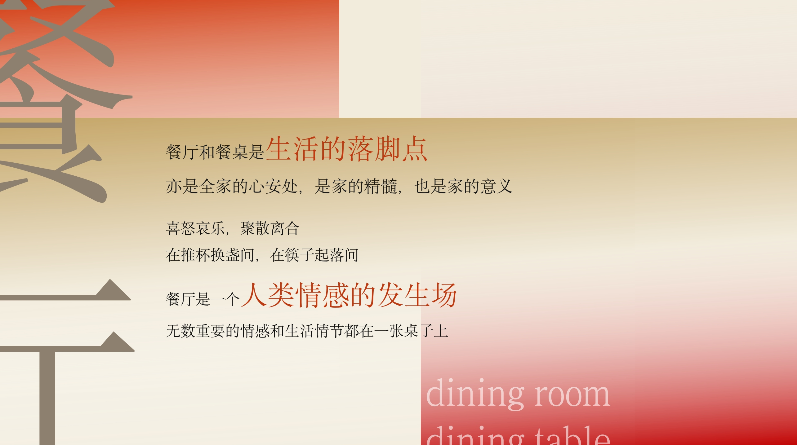 餐厅有范生活有FUN品牌餐厅生活show2.0KUKAPressConference中国人的“吃”,就是中国人的生活张饭桌,就暗喻着各种生活哲学中国人的餐桌自古以来都是主流思潮、社会文化的反映大到宴席的规格,小到座位排布、餐具的规制是一种文化形态,更是家文化的缩影餐厅和餐桌是生活的落脚点亦是全家的心安处,是家的精髓,也是家的意义喜怒哀乐,聚散离合在推杯换盏间,在筷子起落间餐厅是一个人类情感的发生场无数重要的情感和生活情节都在一张桌子上dining room顾家如何讲一个餐KUKA HOME家大厦以“家”为原点打造向往的生活有范趣味性记忆点FUN沉浸感认同感