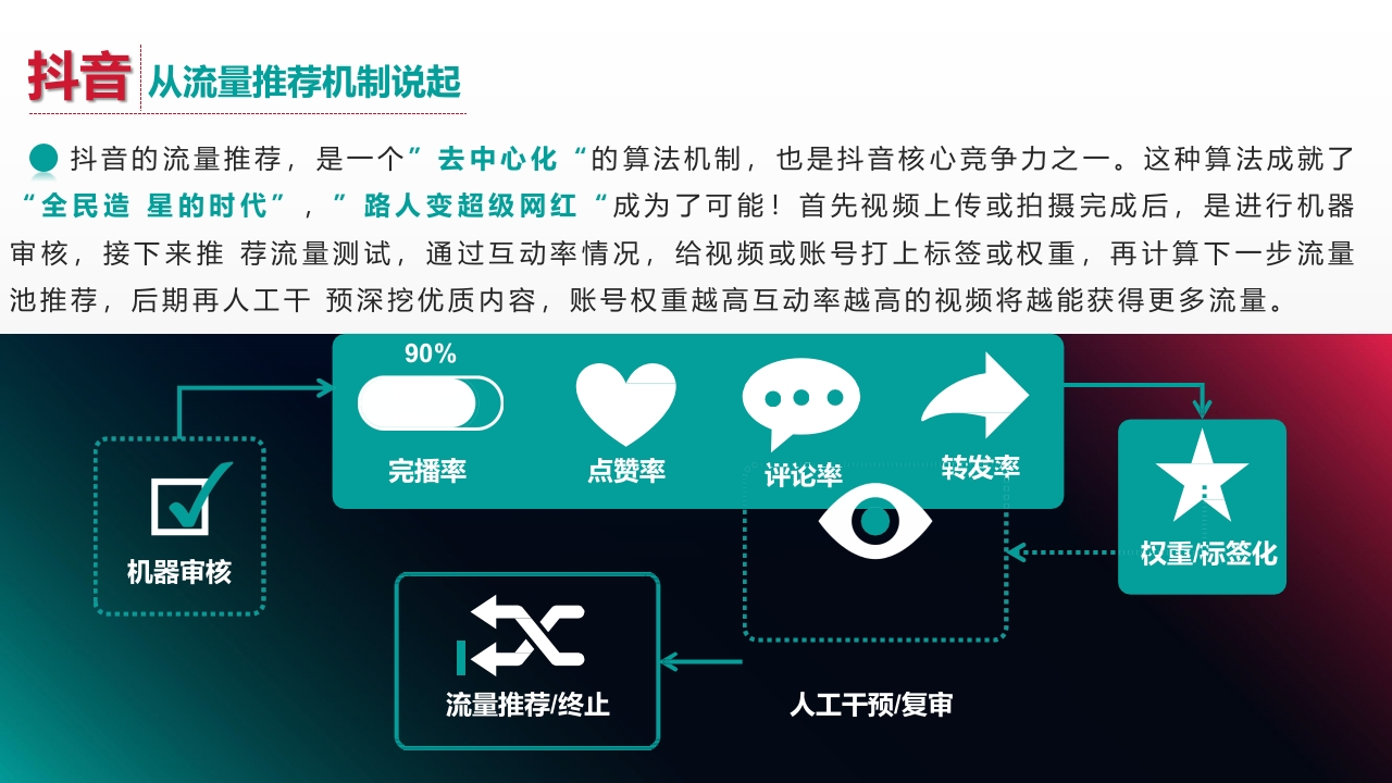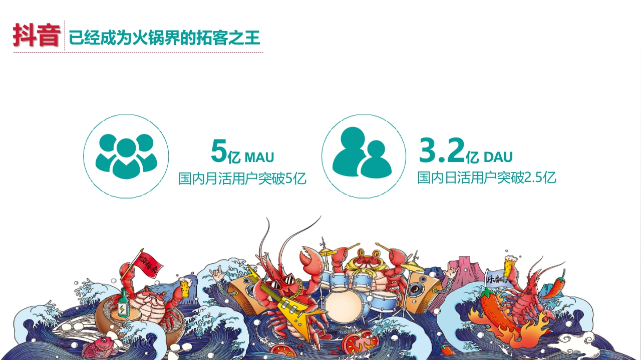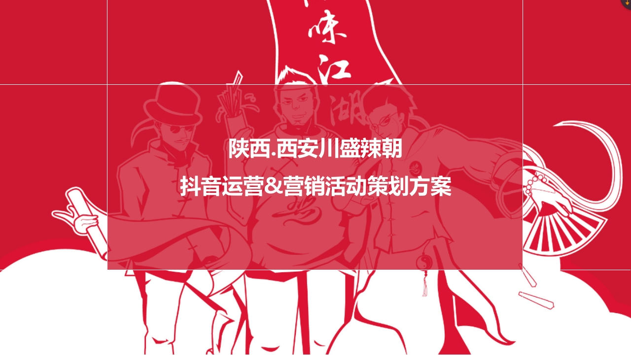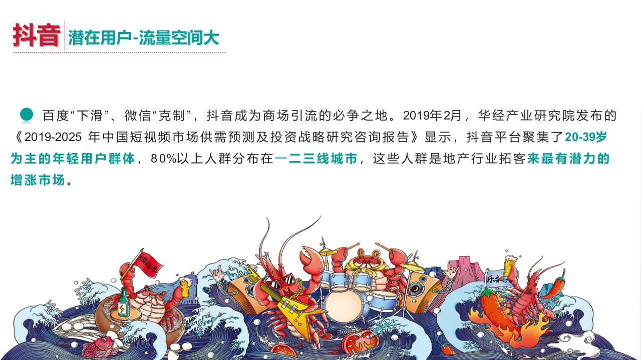 凌陕西.西安川川盛辣朝抖音运营&营销活动策划方案抖音已经成为火锅界的拓客之王5 MAU3.2亿DAU国内月活用户突破5亿国内日活用户突破2.5亿n抖音潜在用户-流量空间大●百度“下滑”、微信“克制”,抖音成为商场引流的必争之地。2019年2月,华经产业研究院发布的《2019-2025年中国短视频市场供需预测及投资战略研究咨询报告》显示,抖音平台聚集了20-39岁为主的年轻用户群体,80%以上人群分布在一二三线城市,这些人群是地产行业拓客来最有潜力的增涨市场。抖音好内容好互动火起来什么样的火锅类内容能快速火起来?抖音从流量推荐机制说起●抖音的流量推荐,是一个”去中心化“的算法机制,也是抖音核心竞争力之一。这种算法成就了“全民造星的时代”,”路人变超级网红“成为了可能!首先视频上传或拍摄完成后,是进行机器审核,接下来推荐流量测试,通过互动率情况,给视频或账号打上标签或权重,再计算下一步流量池推荐,后期再人工干预深挖优质内容,账号权重越高互动率越高的视频将越能获得更多流量。90%完播率点赞率评论率转发率■■■■■■■■■机器审核权重标签化流量推荐/终止人工干预/复审抖音用户/消费者喜好什么的内容●抖音的内容,是由PGC+UGC共同生产,以“短、快、新”的视频GET用户兴趣点,激发互动、引发病毒式传播和流量推荐。以下我们梳理了抖音平台做火的五招内容,为火锅类内容运营做参考。颜值诱惑剧情反转轻松搞笑4现场教学/展示形式创新