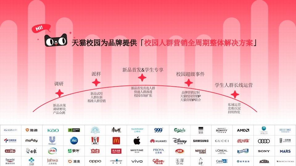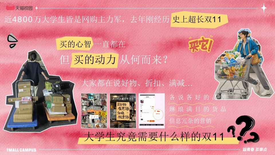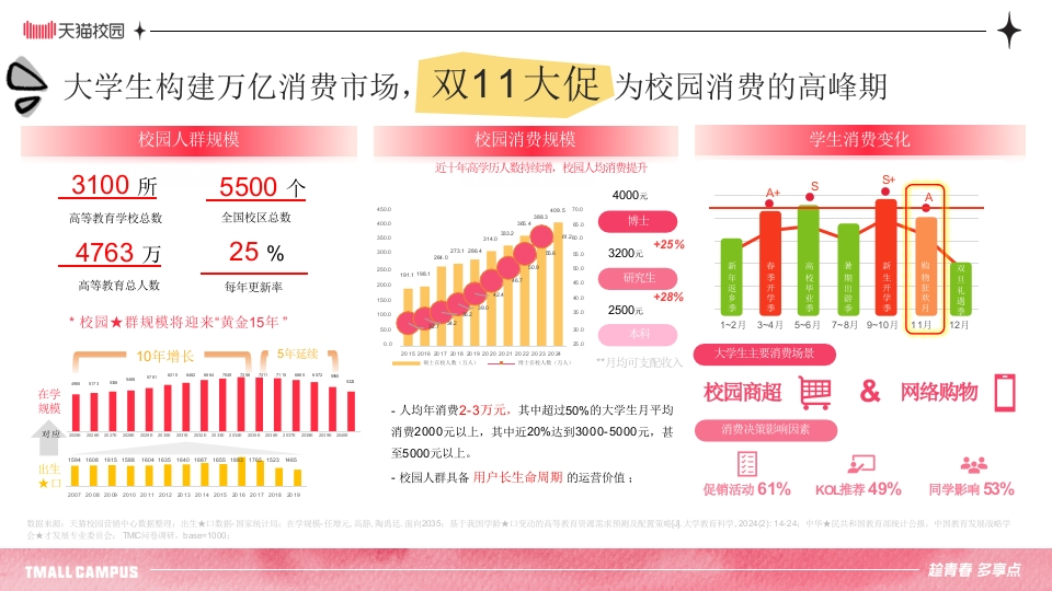 帅天猫校园大学生抓”大鹅”红包~心大学生双11值得买天猫校园2025双11大促营销企划天猫校园全域营销中心全国最大的高校全场景生态体系&校园人群营销联盟体系7000+2100万1700万线下合作学校校区数量渗透服务在校学生认证大学生人数线上学生人群运营阵地线下高校全场景服务业态园子里一周⑨天猫校园会员店828隆红花数发发不停TMALL CAMPUS天猫校园MALL来每行校园外卖的网巴年阳图有学有过事等学市球划身肉事品牌联营共享出行66666元现CD学生会员共享饮水共享打印校园咖啡天猫校园APP淘手淘学生频道共享洗浴吹风HI!天猫校园为品牌提供「校园人群营销全周期整体解决方案」新品首发&学生专享派样++校园超级事件调研学生人群长线运营新品首发首选人群新品试用快速人群透品牌营销定制人群附拉新校园市场张天猫校园营销P精准人群营销天猫营销P联合新品决策私域运营调研孵化忠粉沉淀产品众测持线热度可i.ALVA7雅迪KaO皇网盖傅999Grbeiy三利孕本AMD军定子产宁水moodyG圆mHUAWEISAMSUNGGUCCI可族OD①-浮师药知安白家(伊利9禁牛的鉴大MISTINEPROYA珀莱耀卫碗NESCAFELOREALSONYMARSEucerinJahwa。滴滴oppovivo上再家化9含丢泽神Cerava0量秀雷管ACANA线5 INCEUTICA1TMALL CAMPUShepping Fbad天猫校园双11活动Tmall Gapis啡天猫校园十大学生构建万亿消费市场,双11大促为校园消费的高峰期校园人群规模校园消费规模学生消费变化近十年高学历人数村续增,校园人均消费提升3100所5500个4000元4200高等教有学校总数全国校区总数400博士3nn4763万25%30o0+25%03200元200101.11研究生新年高等教育总人数每年更新率+28%开学季2500元·校园★群规模将迎来“黄金15年”12月34月5-6月7-8月9-10月11月2本科0010年增长5年延续2015016m17m1指m1900021020为04大学生主要消费场量编上在校人黄(万人:一十校人人“月均可支配收入在学校园商超&网络购物规模。人均年消费2-3万元,其中超过50%的大学生月平均消费2000元以上,其中近20%达到3000-5000元,甚清费决策景响因素至5000元以上。★口·校园人群具备用户长生命周期的运营价值:20m2000m01020112012m13014015m160170102m19促销活动61%KOL推荐49%同学影响53%数据米忍:天指悦因营骑中心数据整班:出生★口数据国家筑计局:在学规任增元高静,测马廷,面向235:基于我学龄★口变动的高等我有宽潭需求预测及配置策略人学我有刊学,20242上1424,中华★民共和四我有部说计公报,中国我育发展成略学公★才发服专业委员公:C问卷调研,ba=1000:TMALL CAMPUS趋青春多享点天猫校园+近4800万大学生皆是网购主力军,去年刚经历史上超长双11买的心智一直都在采它但买的动力从何而来?大家都在说好物、折扣、满减.」各说各好的迈贝的物有思路琳琅满目的货品托绝被套路信息冗杂的营销大学生究竟需要什么样的双112TMALL CAMPUS趋青春多享点