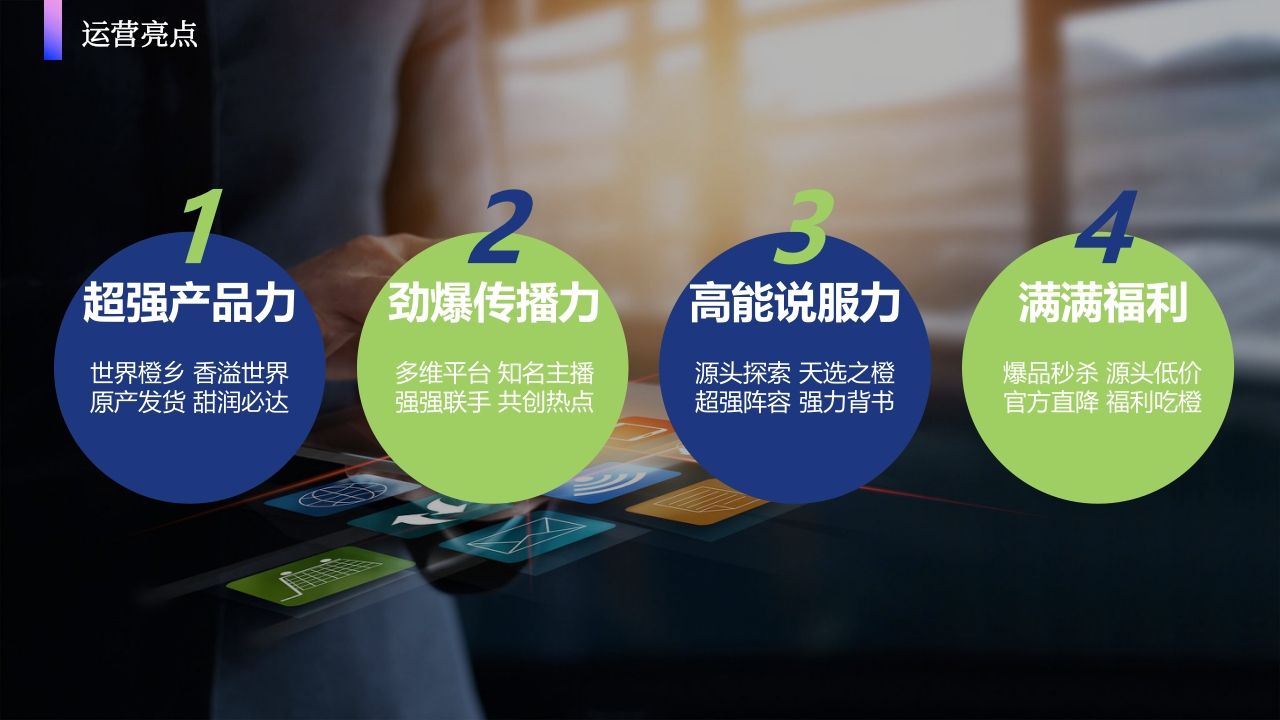 JULY七月中国赣州2024赣南脐橙节直播间运营策划方案Live broadcast room operation planningheme中国赣州。●●●01P A R T 0 1运营规刘Operational planning运营亮点2超强产品力劲爆传播力高能说服力满满福利世界橙乡香溢世界多维平台知名主播源头探索天选之橙爆品秒杀源头低价原产发货甜润必达强强联手共创热点超强阵容强力背书官方直降福利吃橙运营目标建设线上赣南脐橙传播销售终端完善的运营规划精准的用户触点海量的引流渠道建设赣南脐橙直播“人、货、场”赣南脐橙直播间“人、货、场”通过人货场三大基础的完善设立,打造全新赣南脐橙直播间。Shop®®人一直播团队搭建货直播选品场—直播间场景搭建一个成熟的直播团队配置,大致如下:直播间场地:空间可控制在20-40m,不要出现隔主播+助理+助播+运营+拍摄剪辑+投流手+操根据直播主题、主播人设、粉丝喜好,供应链音差、回音大等情况盘手。状况,选取本次活动所需产品;主力选品与预直播间背景:以浅色纯色背景墙为主,不要用白色、容易反光,可选择灰色系背景墙。对于初始团队或新主播、品牌而言,在起步期,热/直播中推广需强相关。直播间灯光:灯光配置包括主灯、补光灯和辅助背可以先尝试最小规模的团队配置:主播1人+直播商品主要有四类:引流款、跑量款、利润景灯。运营1人,在抖音直播整体的运营难度比较低,款、福利款。直播间声音:可适当使用背景音乐,但不能太大。定程度上入局的成本更低直播设备:最核心的设备是手机、网络、支架、补光灯。运营传播规划链接头部媒体平台、官方媒体、自媒体矩阵、垂类媒体、门户网站等,直播运营期间进行全渠道曝光,引导流量注入,为转化提供量变基础。目的为保证直播运营活动得到高爆发曝光与流量注入,在直播前中期以图文、直播短视频为产品提前种草,提升主推产品的转化率。形式PGCUGC短视频长图文渠道淘●●0京东搜狐腾讯新闻NEWS.QQ.com網易新闻头系条今日头条上海你关心的才是头条闻宁度州a病9人民网people.cn