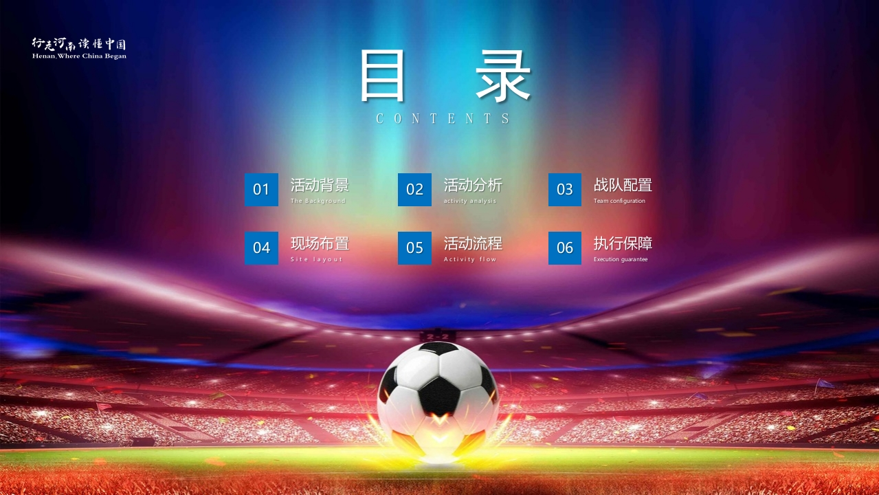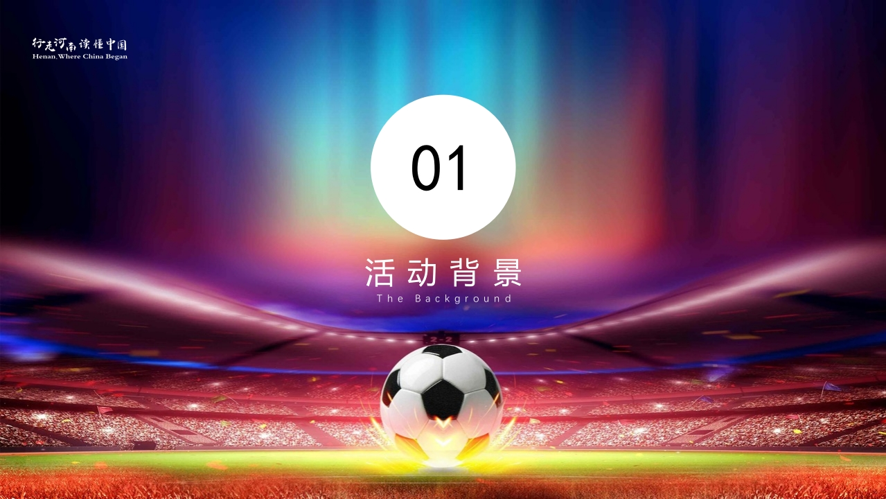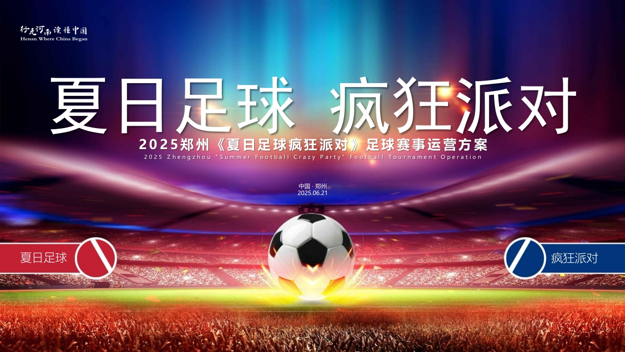 行洗河南读懂中国Henan.Where China Began夏日足球疯狂派对2025郑州《夏日足球疯狂派对》足球赛事运营方案2025 Zhengzhou "Summer Football Crazy Party"Football Tournament operation中国·郑州2025.06.21夏日足球疯狂派对行走河南读懂中国Henan.Where China Began目录CONTE NT S01活动背景02活动分析03战队配置The Backgroundactivity analysisTeam configuration04现场布置05活动流程06执行保障Site layoutActivity flowExecution guarantee行走河南读懂中国Henan.Where China Began01活动背景The B ac k g r o u n d打造中部地区重要中心城市一个包含”体育+生态+科技+人文+经济+影响力”的国际大都市城市营销”升级流量变成城市的增量我们的城市流量在哪里?