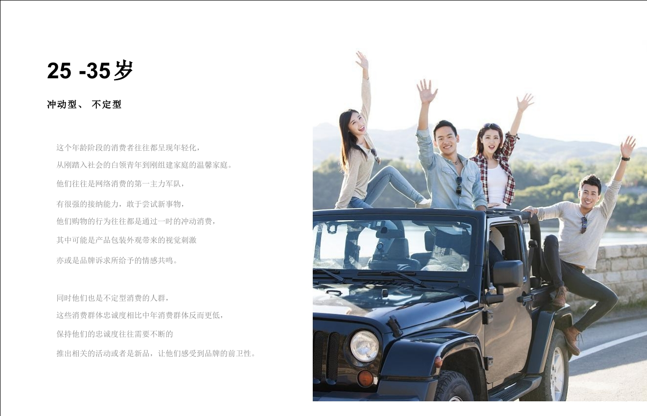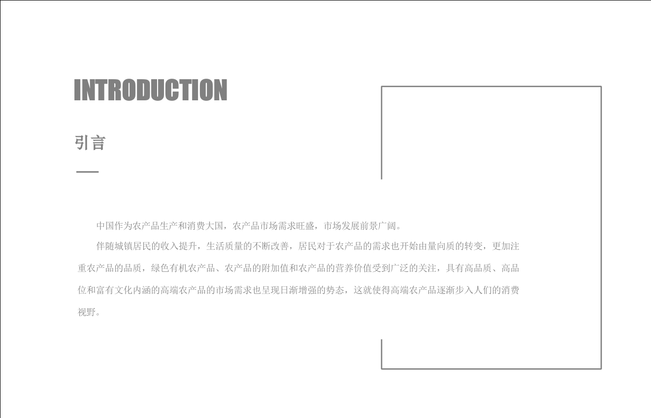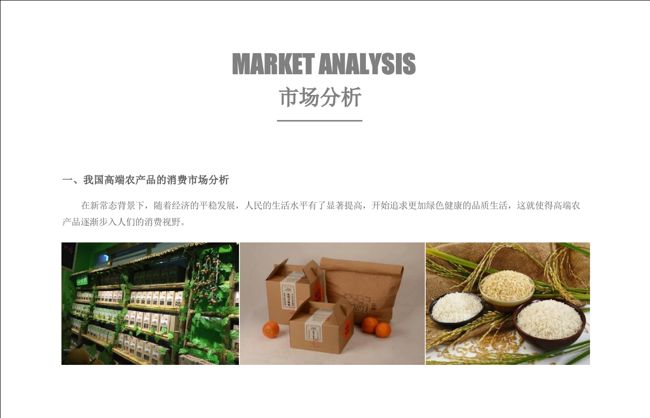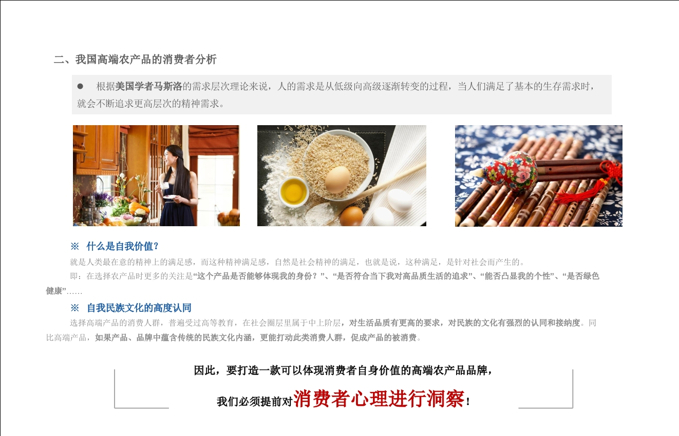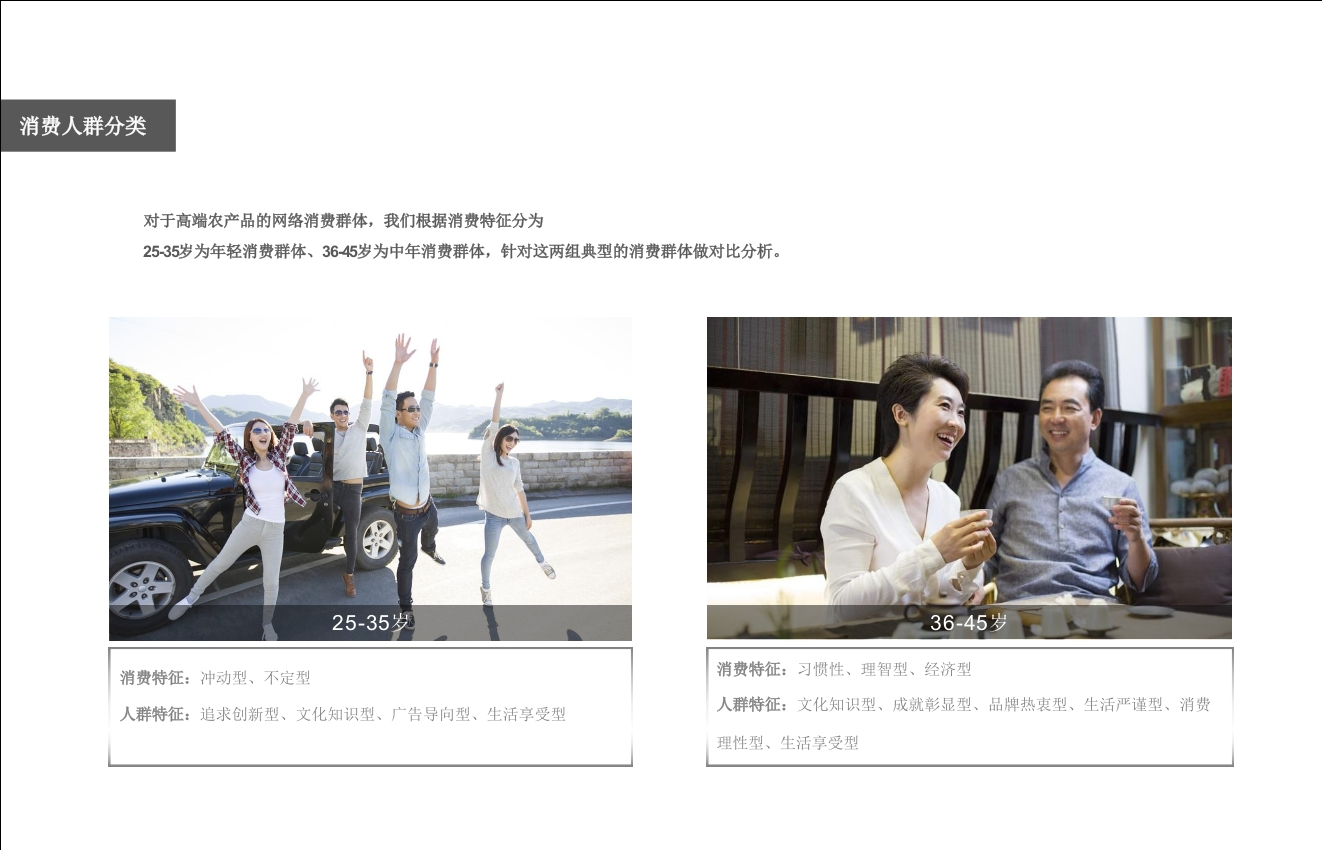 心之米xinmi.net品牌整合全案传播方3INTRODUCT ON引言中国作为农产品生产和消费大国,农产品市场需求旺盛,市场发展前景广阔。伴随城镇居民的收入提升,生活质量的不断改善,居民对于农产品的需求也开始由量向质的转变,更加注重农产品的品质,绿色有机农产品、农产品的附加值和农产品的营养价值受到广泛的关注,具有高品质、高品位和富有文化内涵的高端农产品的市场需求也呈现日渐增强的势态,这就使得高端农产品逐渐步入人们的消费视野。MARKET ANALYSIS市场分析一、我国高端农产品的消费市场分析在新常态背景下,随着经济的平稳发展,人民的生活水平有了显著提高,开始追求更加绿色健康的品质生活,这就使得高端农产品逐渐步入人们的消费视野。二、我国高端农产品的消费者分析根据美国学者马斯洛的需求层次理论来说,人的需求是从低级向高级逐渐转变的过程,当人们满足了基本的生存需求时就会不断追求更高层次的精神需求※什么是自我价值?就是人类最在意的精神上的满足感,而这种精神满足感,自然是社会精神的满足,也就是说,这种满足,是针对社会而产生的。即:在选择农产品时更多的关注是“这个产品是否能够体现我的身份?”、“是否符合当下我对高品质生活的追求”、“能否凸显我的个性”、“是否绿色健康”※自我民族文化的高度认同选择高端产品的消费人群,普遍受过高等教育,在社会圈层里属于中上阶层,对生活品质有更高的要求,对民族的文化有强烈的认同和接纳度。同比高端产品,如果产品、品牌中蕴含传统的民族文化内涵,更能打动此类消费人群,促成产品的被消费。因此,要打造一款可以体现消费者自身价值的高端农产品品牌,我们必须提前对消费者心理进行洞察!消费人群分类对于高端农产品的网络消费群体,我们根据消费特征分为2535岁为年轻消费群体、36-45岁为中年消费群体,针对这两组典型的消费群体做对比分析。25-35岁线36-45岁消费特征:冲动型、不定型消费特征:习惯性、理智型、经济型人群特征:追求创新型、文化知识型、广告导向型、生活享受型人群特征:文化知识型、成就彰显型、品牌热衷型、生活严谨型、消费理性型、生活享受型2535岁冲动型、不定型这个年龄阶段的消费者往往都呈现年轻化,从刚踏入社会的白领青年到刚组建家庭的温馨家庭。他们往往是网络消费的第一主力军队,有很强的接纳能力,敢于尝试新事物,他们购物的行为往往都是通过一时的冲动消费,其中可能是产品包装外观带来的视觉刺激亦或是品牌诉求所给予的情感共鸣。同时他们也是不定型消费的人群,这些消费群体忠诚度相比中年消费群体反而更低,保持他们的忠诚度往往需要不断的推出相关的活动或者是新品,让他们感受到品牌的前卫性。