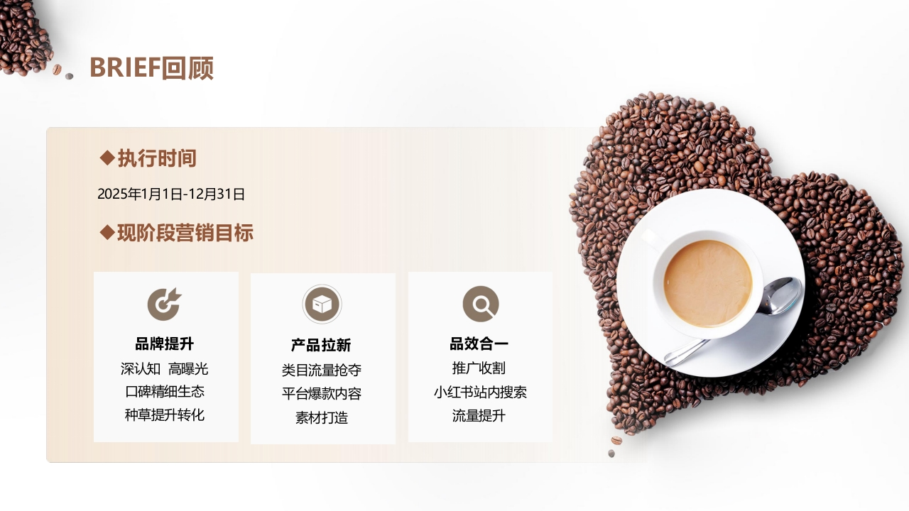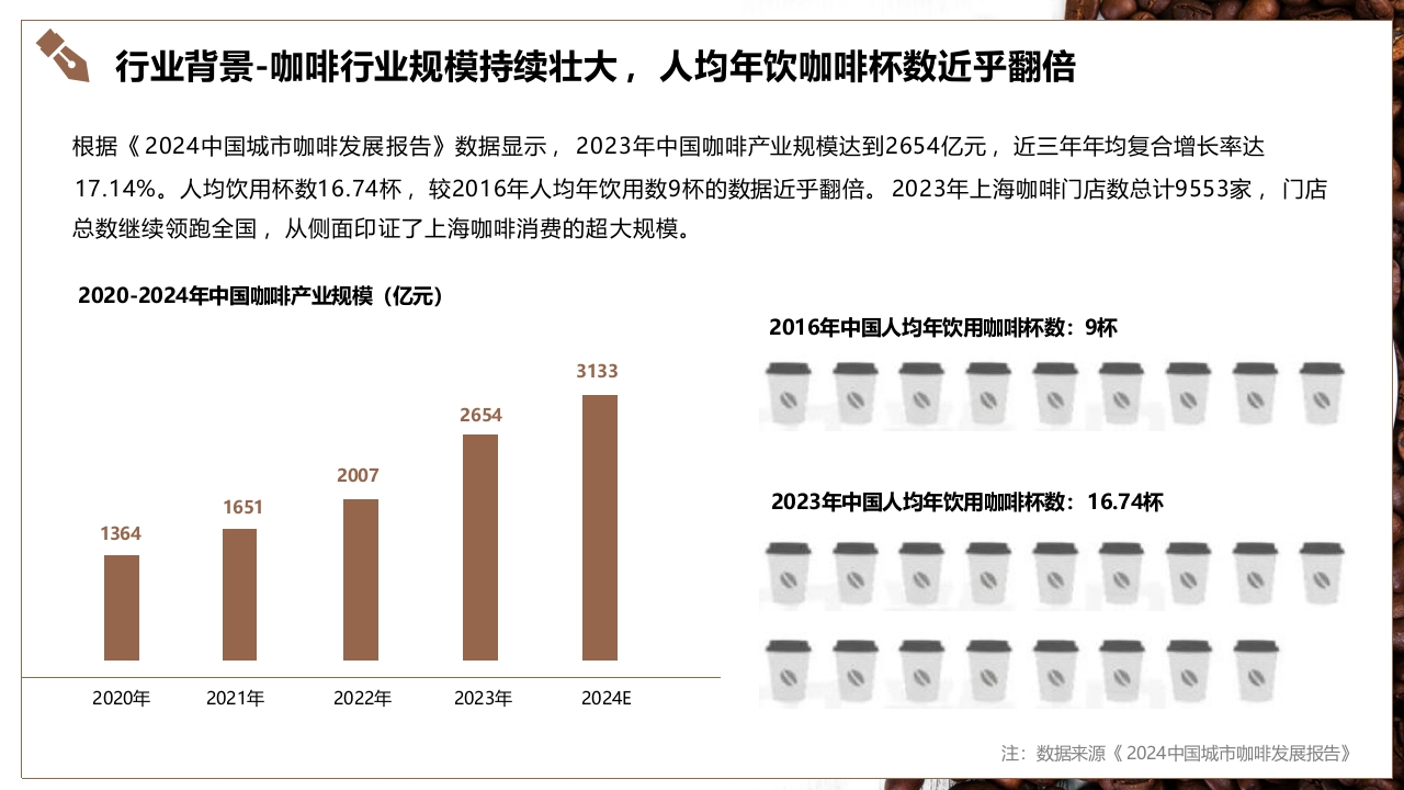 洲池■IDIISAANCI山池之间咖啡香伴生活行一山池咖啡2025年小红书平台营销推广方案■■■■■D。BRIEF回顾◆执行时间2025年1月1日-12月31日◆现阶段营销目标品牌提升产品拉新品效合一深认知高曝光类目流量抢夺推广收割口碑精细生态平台爆款内容小红书站内搜索种草提升转化素材打造流量提升目录CONTENTS01分析&洞察02思考&策略03传播&推广04资源&合作PAFO DNE分析&洞察行业背景-咖啡行业规模持续壮大,人均年饮咖啡杯数近乎翻倍根据《2024中国城市咖啡发展报告》数据显示,2023年中国咖啡产业规模达到2654亿元,近三年年均复合增长率达17.14%。人均饮用杯数16.74杯,较2016年人均年饮用数9杯的数据近乎翻倍。2023年上海咖啡门店数总计9553家,门店总数继续领跑全国,从侧面印证了上海咖啡消费的超大规模。2020-2024年中国咖啡产y业规模(亿元)2016年中国人均年饮用咖啡杯数:9杯31332654200716512023年中国人均年饮用咖啡杯数:16.74杯13642020年2021年2022年2023年2024E注:数据来源《2024中国城市咖啡发展报浩》行业背景-线上消费热情高涨,众多品牌入场促进咖啡市场繁荣发展根据2024上半年抖音咖啡品类的销售数据,销售额较去年同期相比增长了110%,且呈现出逐年递增的趋势。同时,从市场供给的角度来看,带货品牌和带货商品数量分别增长了142.9%和380.3%,大批品牌嗅到市场红利,有效促进咖啡品类线上市场的进一步扩张。2024上半年咖啡品类在抖音关键数据的同比增幅情况2022-2024年咖啡品类在抖音的销售月趋势●2022年●2023年●2024年销售额带货商品↑110.0%↑380.3%销量带货小店↑30.1%↑337.1%销售均价带货品牌aiibu↑61.4%↑142.9%1月2月3月45月6月7月8明9月10月11月12月数据说明:分别选取2022-2024年商品销量大于0的商品数据