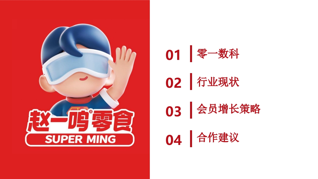 赵一鸣零食会员增长运营策略赵一鸸零管零一数科USER·AI·GROWTHSUPER MING赵一呜罗宜01|零一数科02行业现状会员增长策略赵一吗零食03SUPER MING04合作建议CONTENTS01|零一数科目录02行业现状03会员增长策略04合作建议零一数科专注微信生态全链路解决方E客六年来,零一数科跟随微信生态成长逐步覆盖全业务链条及触点,铸就“一体化”增长解决体系2022-至今未来将持续深耕微信生态,为更多品牌打造私域标杆性增长案例●2021视频号代运营服务案例荣登2019、2020微信公开课pro,深受官方成为企业微信官方服务商●认可2017、2018打造多个百万级爆款小程提供私域全链路代运营服务,与腾讯完成更多生态合作陆续签约屈臣氏、宝洁等头序,实现裂变能力产品化。持续创造11个百万级公众部企业TOP1服务商,鞋服行业标杆运号,粉丝体量超5000万+,创链接100+服务商,赋能500+品营服务商牌主,辐射50+媒体提供视频号直播代运营服务收4000万+公众号小程序企业微信00视频号零一数科专注微信生态赋能品牌用户经营助力业务增长私域GMW最高的运营服务商,坚持“用户价值”为依归100+亿2023财年品牌私域业绩为100亿+/年直接为品牌服务1亿+企微用户,1.5亿+私域粉丝私域GMV缔造者行业最高客户复购率、逐年合作金额增长率300%+北京1000+天使投资人:腾讯集团原高级副总裁吴宵光全职伙伴超1000人,来自腾讯、京东、联合利华、宝洁深耕FMCG、零售、鞋服、母婴、金融领域长沙核心项目团队成员2023年微信公开课获官方首肯TOP1视频号标杆「品牌代运营服务商」騰讯智慧零售「卓越代运营服务商」、「鞋服行业标杆运营商」旗下有行业媒体「运营深度精选」、「每日运营案例库」微信生态运多地协同交付保障营咨询服务商自2016年起持续为行业贡献大量专业运营知识,推动私域行业标准制定与人才发展1000+成员8大核心城市零一数科微信生态官方卓越合作伙伴连续两年微信公开课·公开表扬优秀服务商腾讯智慧零售企业微信官方卓越合作伙伴官方服务商772>)视频号腾讯集团官方服务商5<24联合创始人投资2023年36Kr·年度最具商业价值MCN腾讯课堂腾讯广告101计划荣誉顾问5<24美妆荣誉顾问772>)过山丘: