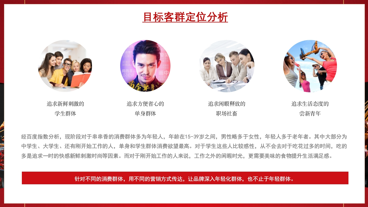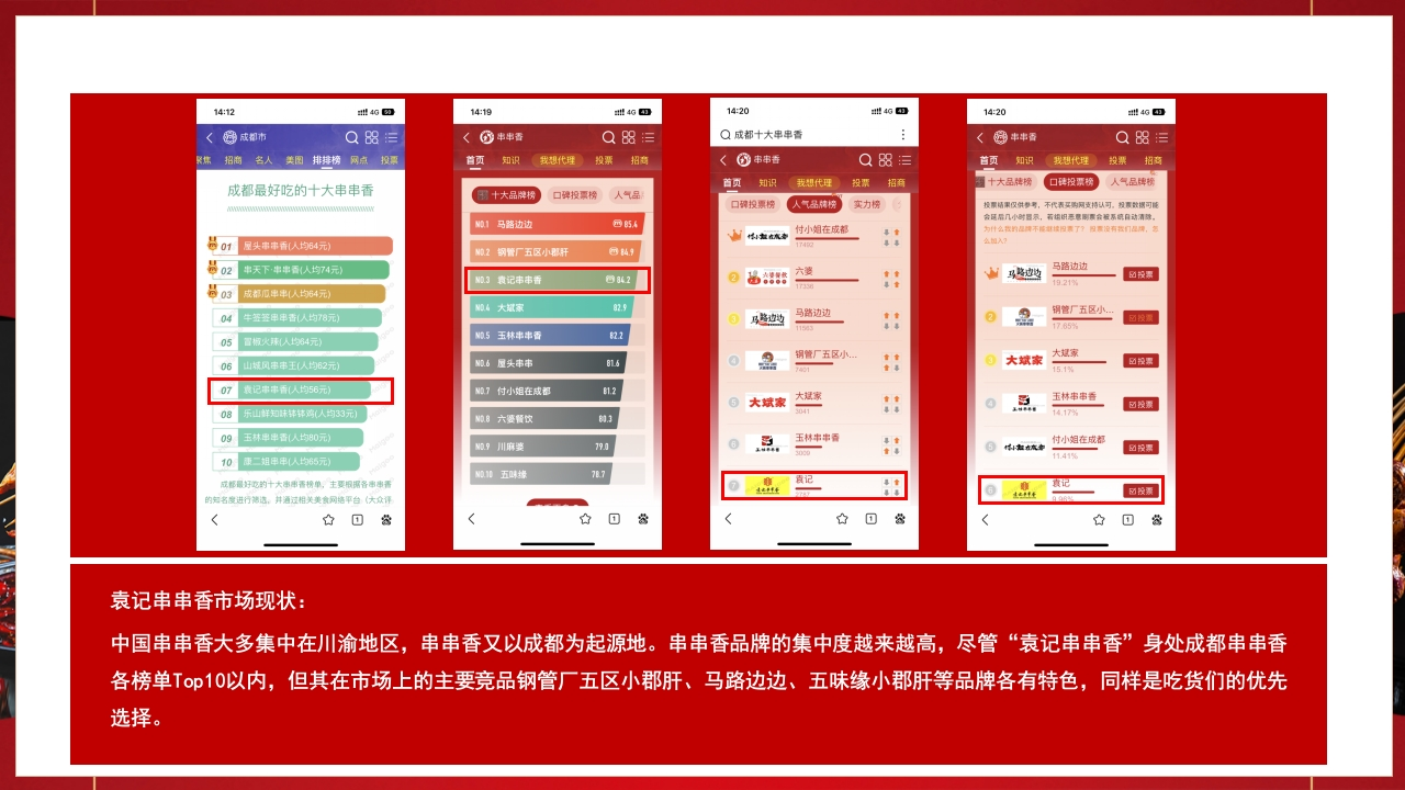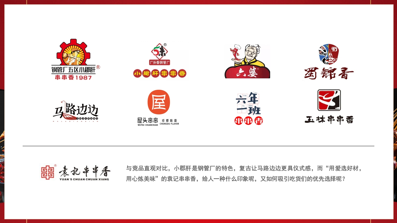 鑫【记忆味道】专属一座城的A附下60现状分析SPICY AND DELICIOUS道串串香的规模已成为烹饪火锅的第一大细分品类,仅成都、重庆两个城市,串串香门店数已繁多,超过万家。人制作的串串香都有所不同在二十世纪90年代中期的四川风味各异。所以人们往往又称它为”小火锅如今钢管厂五区小郡肝、马路边边、袁记串串香、五味缘小郡肝等因此四川串串香种类锅底和菜都很简单,发展到现在几乎是无所不涮。不同都。最初的串串香串串香最早出现串串香它实际上是火锅的另一种形式类似“麻辣烫品牌甚至将门店开到了海外。如今,加拿大、美国、韩国、澳大利亚、新加坡等国家,都有了串串的身影。人群属性?消费群体年龄分布■串串香■全网分布OTG引串串香以其简单、快捷、经济、营养的消费模式成为了大众化餐饮中的重要组TGI40%160成部分,受到了数以万计年轻人的青睐。30%120据百度指数分析,百度互联网上,80后、20%8090后的人群对“串串香”关键词吸引度更高,消费能力极强;而00后的偏好度10%40正持续走高,正成为下一代串串香市场≤1920~2930~394049≥50消费主力。百度指数搜索人群属性。TG为搜索人群意向14:124g四14:19删4g团142040D14204g田〈成初市Q8三〈⑤串串香Q8目Q成都十大串串香Q8目焦招商名人美图排排榜网点报票首页知识我想代理投票招商〈⑥份串串香Q8三首页知识我想代理投票招商成都最好吃的十大串串香首页知识我想代理投票招商通十大品牌榜口使投票榜人气品牌桥围十大品牌榜口躁报票榜人气品NWAAWNW3443444340W4400444口神投票榜人气品储榜实力榜提票结果仅件静男,不代表买购网支持认可,毅震数擦可能合日后几小时辰,若顷饵是限震合短系慕自动清隆。马路边边付小姐在成都总01园头串串香人均54元么入2钢管厂五区小回站9总02串天下串串香人均74元M加3袁记串串香2803递船六美悠边马路边边21%☑悦票成都瓜串人均4元)顺。大想家04牛签中香(人均8元3路边助马路边边管厂五区小1785%05板火人均84元)抛5玉林串串香2206山城风串串王(人均82元)6屋头串串8L60锡管厂五区小目大城家大短家回悦票15107数记串串香人均56元)般了付小姐在成都12目大城家大框8玉林串串音0☒发08乐山鲜知鸡(人均33元)14.17%驰8六要餐饮09玉林串串香人均80元)般9川麻装791五林书常露目体4志付小烟在成都团悦票10康二姐串串人均5元动1141%77立能服方的十大出串挥将单,丰琴相规各出串调真记的知名炭进行德选。并酒过相关美食网培平台(大众评☆回回☆回☆回袁记串串香市场现状:中国串串香大多集中在川渝地区,串串香又以成都为起源地。串串香品牌的集中度越来越高,尽管“袁记串串香”身处成都串串香各榜单T即10以内,但其在市场上的主要竞品钢管厂五区小郡肝、马路边边、五味缘小郡肝等品牌各有特色,同样是吃货们的优先选择。厂外香钢管厂钢管厂五区小郡肝®串串香1987小用肝串串香六婆强粥六年路边边班日0000000屋头串串感高串⊕重香玉林串串香NUTDU CHUANCHUAN串麦之辛串香与竞品直观对比,小郡肝是钢管厂的特色,复古让马路边边更具仪式感,而“用爱选好材,YUAN'SCHUAN CHUAN XIANG用心炼美味”的袁记串串香,给人一种什么印象呢,又如何吸引吃货们的优先选择呢?目标客群定位分析追求新鲜刺激的追求方便省心的追求闲暇释放的追求生活态度的学生群体单身群体职场社畜尝新青年经百度指数分析,现阶段对于串串香的消费群体多为年轻人,年龄在15-39岁之间,男性略多于女性,年轻人多于老年者。其中大部分为中学生、大学生、还有刚开始工作的人,单身和学生群体消费欲望最高。对于学生这些人比较感性,从不会去对于吃花过多的时间,吃的多是追求一时的快感新鲜刺激时尚等因素。而对于刚开始工作的人来说,工作之外的闲暇时光,更需要美味的食物提升生活满足感。针对不同的消费群体,用不同的营销方式传达,让品牌深入年轻化群体,也不止于年轻群体。
