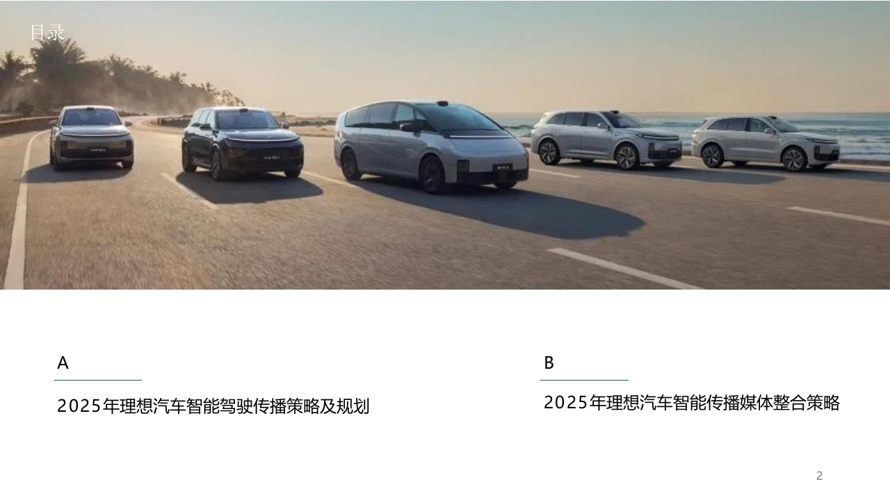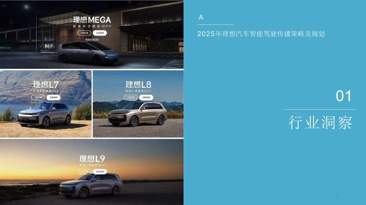【智能传播】理想汽车2025-2027年度公关传播方案1AB2025年理想汽车智能驾驶传播策略及规划2025年理想汽车智能传播媒体整合策略2理想MEGAA家座利技旗颗MPV(了新特)立虾定的2025年理想汽车智能驾驶传播策略及规划现重次布会回能理想L7理想L8家压去庄源飘Uy家狂六座奈华SUV了年立印定为01行业洞察理想L9家忘太忘核板SUy3智能驾驶成为车圈”兵家必争”之地2025年传统大厂集体上演「智驾平权」)长安汽车GEELY吉利控服北斗天枢2.0天神之眼干里浩瀚打响长安”全民智驾”的口开启比亚迪启动”智驾平权”战助力吉利抢夺智驾时代话语权略【天神之眼」整套技术解决方案GEELY安全高阶智能驾驶系统长安汽车北斗天极20计划天神之眼A天神之眼B天神之眼C每三元线【060的■可克《C00将三山店(0g0暨长安启源数智晚及Q07亮相品鉴主要塔安品牌·仰望主要塔载品牌·舞势比亚油主要塔载品牌·比亚道干里浩翰容w2月9日长安正式发布”北斗天枢2.0”2月10日比亚迪智能化战略发布会宣称官宣3月发布千里浩瀚智驾技术平台计划深蓝汽车全系车型标配智能驾驶系比亚迪全系车型搭载天神之眼高阶智驾主打“智驾平权+安全平权”统新势力是智驾的常胜将军新势力在智驾上仍一马当先A>×>(xlaomI HAD车位到车位小鹏汽车上车就能用城市智驾开城中国第乾崑ADS3.0智驾系统,可覆盖城区90%场景,2024年A天玑系统上线后,实现“每2天一次版小米智驾采用"VLM+端到端”技术架构,从有图无图都能开,联合赛力斯、极狐等车企打造本迭代,每2周一次体验升级”,70天内完成5传感器输入到决策输出均由深度神经网络完成,“技术输出+高端品牌”双驱动模次全量更新、35个版本迭代,远超行业平均月度减少了传统模块化设计的延迟,提升复杂场景应或季度更新节奏对能力智驾决赛圈有了新的趋势动向VLA正迈进下一代自动驾驶的核心战场不仅提升驾驶能力,更赋予车辆主动思考与适应环境的智能体属性通过统一模型替代传统感知-规划-执行的割裂架构,解决误差累积问题较初代端到端优点更突出已在全球范围内引发关注理想VLM+端到端方案接近VLA现阶段的端到端能推理未来7秒钟可能发生的情况。心。VLA推理能力能够长达几十秒VLA借助大语言模型的推理能力英国初创公司Wayves率先布局理想汽车在2024年已量产VM+端到端方案,被认能以人类可理解的方式解释动作逻辑Wayve的无图化思路与LA的实时感知能高度契合为是最接近A的玩家,其下一步突破几成定局复杂场景下的适应性更强6