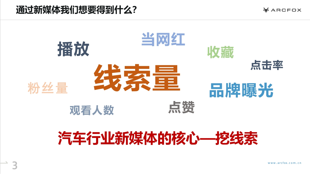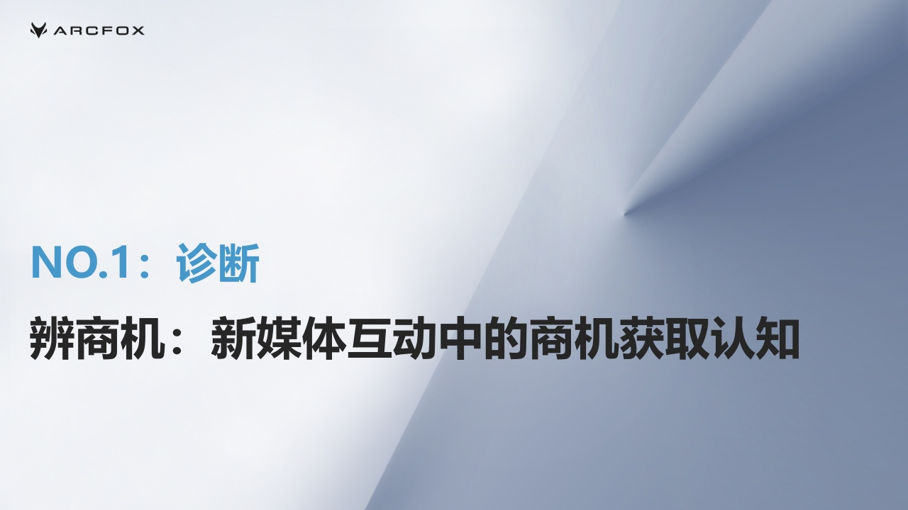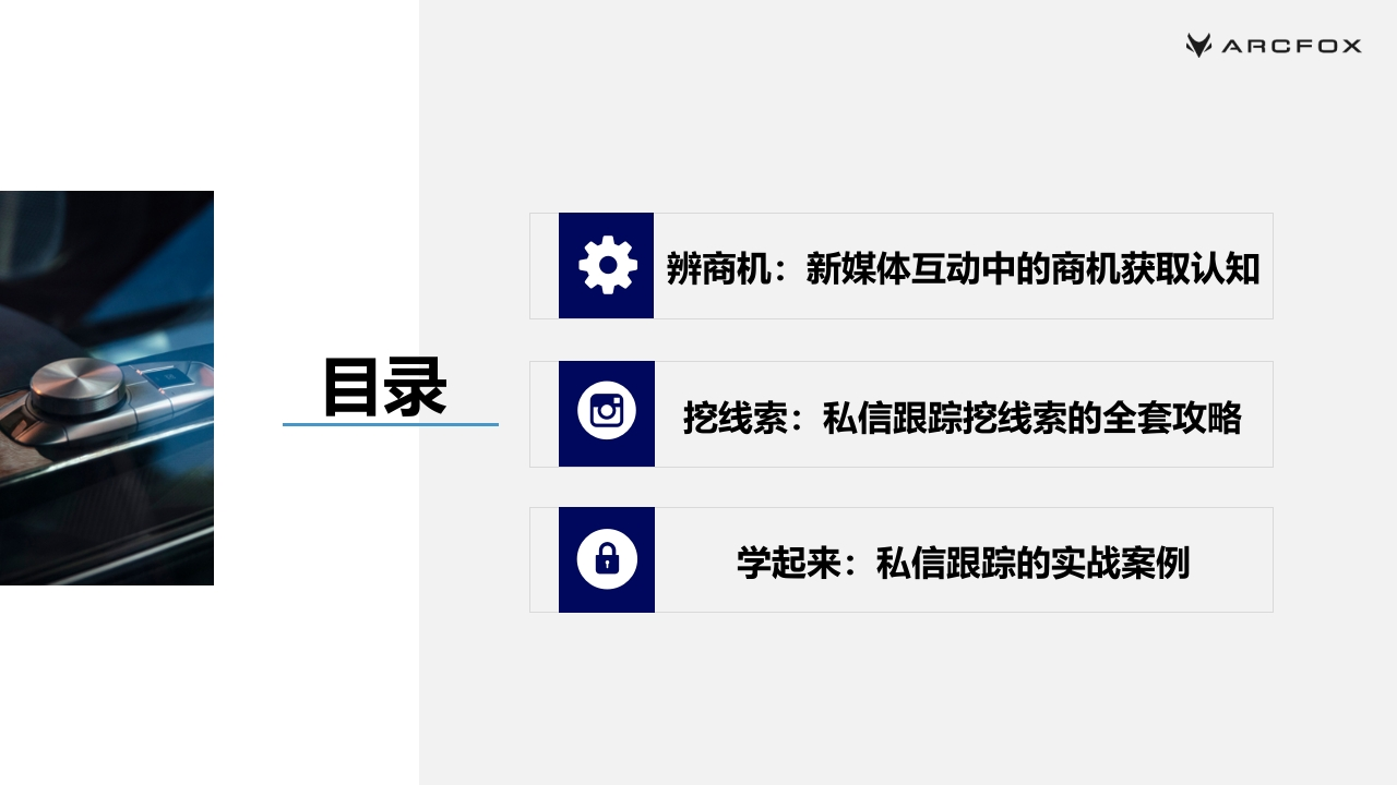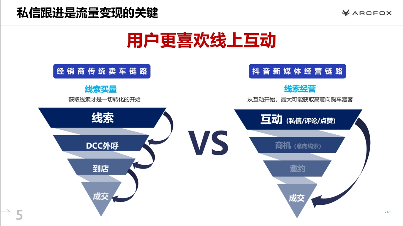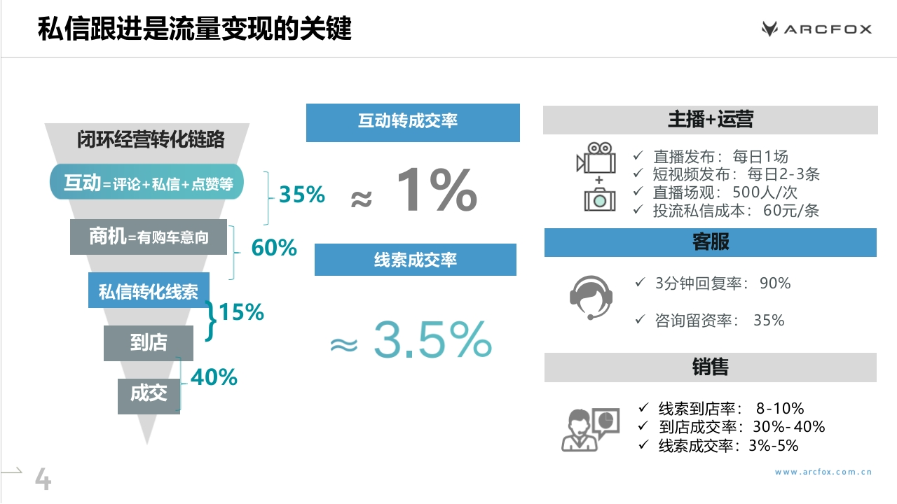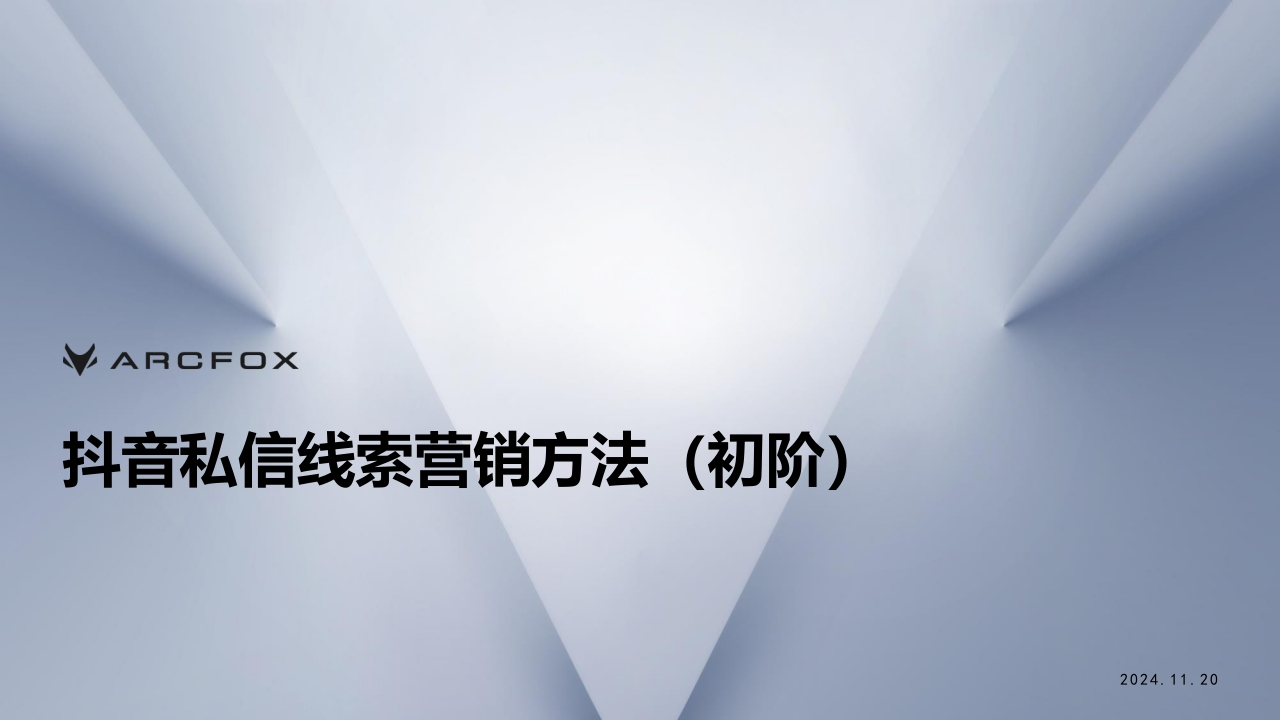 VARCFOX抖音私信线索营销方法(初阶)2024.11.20ARCF口X妆辨商机:新媒体互动中的商机获取认知目录挖线索:私信跟踪挖线索的全套攻略a学起来:私信跟踪的实战案例ARCF口XNO.1:诊断辨商机:新媒体互动中的商机获取认知通过新媒体我们想要得到什么?ARCF口X播放当网红收藏点击率粉丝量线索量品牌曝光观看人数点赞汽车行业新媒体的核心一挖线索3www.arcfox.com.cn私信跟进是流量变现的关键ARCF口X互动转成交率主播+运营闭环经营转化链路⊙⊙√直播发布:每日1场互动=评论+私信+点赞等35%1%+短视频发布:每日2-3条√直播场观:500人/次投流私信成本:60元/条商机=有购车意向60%客服线索成交率私信转化线索√3分钟回复率:90%15%√咨询留资率:35%到店≈3.5%40%销售成交线索到店率:8-10%到店成交率:30%-40%线索成交率:3%-5%4www.arcfox.com.cn私信跟进是流量变现的关键ARCF口X用户更喜欢线上互动经销商传统卖车链路抖音新媒体经营链路线索买量线索经营获取线索才是一切转化的开始从互动开始,最大可能获取高意向购车潜客线索互动(私信/评论/点赞)DCC外呼VS商机(意向线索)到店邀约成交成交5.cn