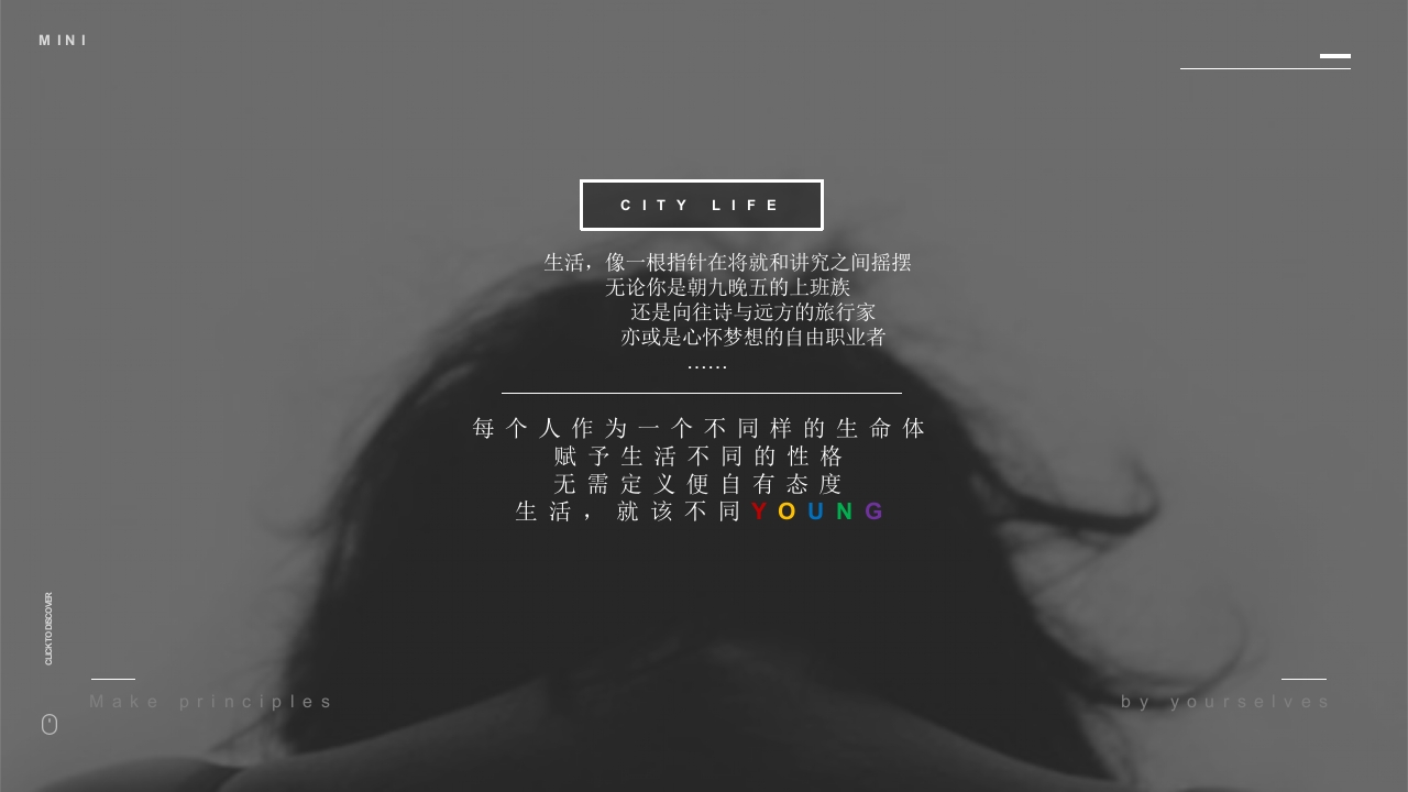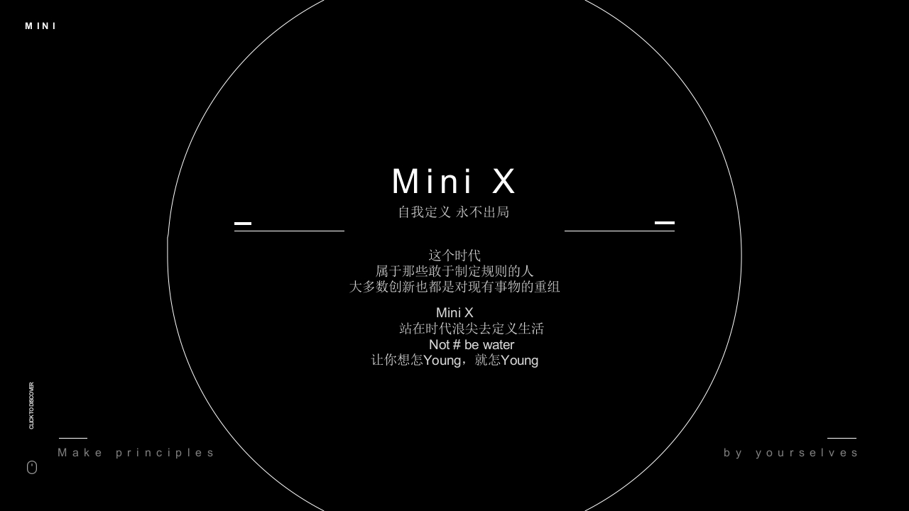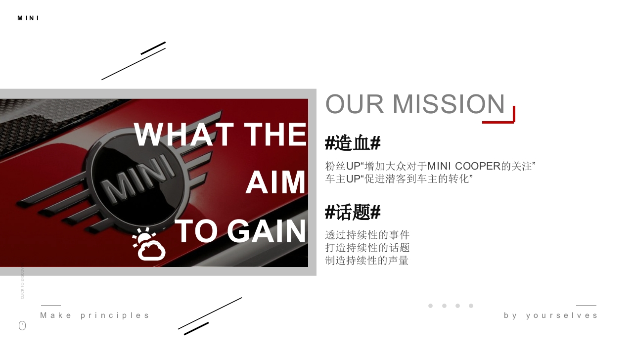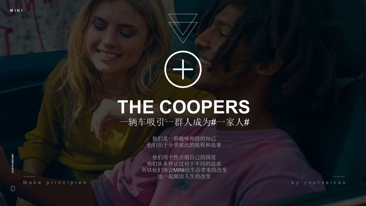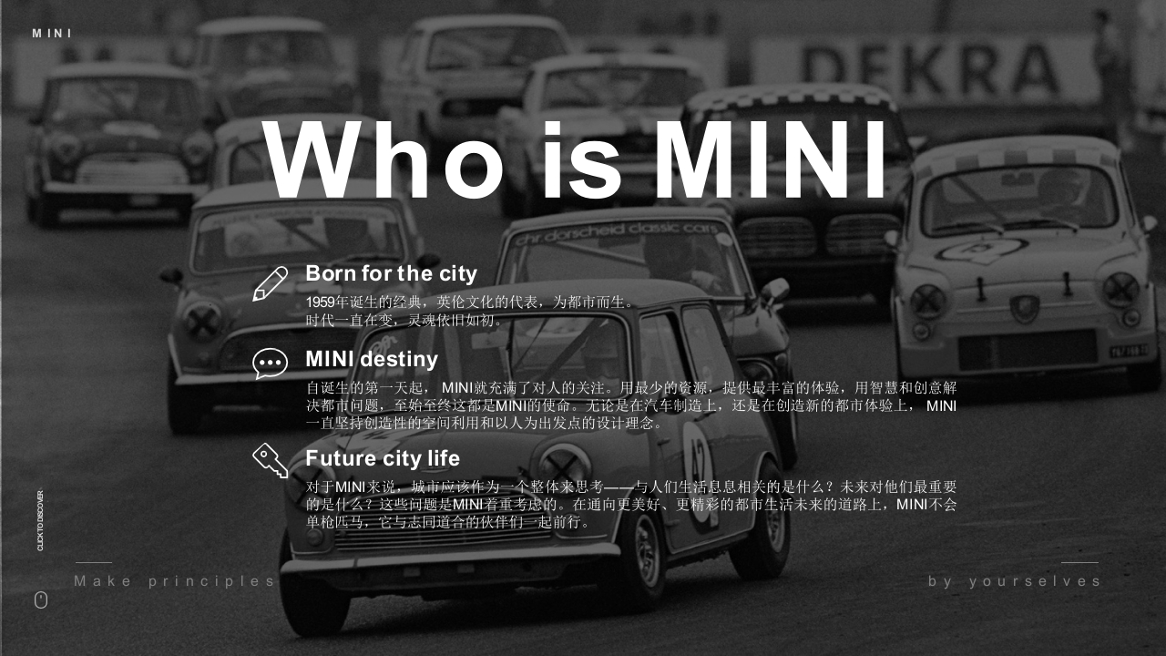 MINI年车有型生活才有型8L00336MINIOUR MISSIONIWHAT THE造血#N字粉丝UP“增加大众对于MINI COOPER的关注”AIM车主UP“促进潜客到车主的转化”若TO.GAIN#话题#透过持续性的事件打造持续性的话题制造持续性的声量M a k e prin c i p le sb y you rs e l v e sMINIDEKRAWho is MINIBorn for the city1959年诞生的经典,英伦文化的代表,为都市而生。时代一直在变,灵魂依旧如初。MINI destinyW国自诞生的第一天起,MN就充满了对人的关注。用最少的资源,提供最丰富的体验,用智慧和创意解决都市问题,至始至终这都是MN的使命。无论是在汽车制造上,还是在创造新的都市体验上,MN!直坚持创造性的空间利用和以人为出发点的设计理念。Future city life对于MN来说,城市应该作为二个整体来思考一一与人们生活息息相关的是什么?未来对他们最重要的是化么?这些问题是MN着重考虑的。在通向更美好、更精彩的都市生活未来的道路上,MIN不会单枪匹马,它与志同道合的伙伴伊三起前行。M a k epr i n c i p l e sb yy o u r s e l v e sMINITHE COOPERS辆车吸引一群人成为#一家人#他们是一群趣味相投的知己他们乐于分享彼此的旅程和故事BAOOSGOLXOnO他们用个性点缀自己的国度他们从未停止过对于不同的追求所以他们体会MN给生活带来的改变也一起做出人生的改变M ake p r i n c i p l esb y yo u rs e I v es⊙MINIC I T Y L I F E生活,像一根指针在将就和讲究之间摇摆无论你是朝九晚五的上班族还是向往诗与远方的旅行家亦或是心怀梦想的自由职业者每个人作为一个不同样的生命体赋予生活不同的性格无需定义便自有态度生活,就该不同YOUNGM ak e p ri n ci p l e sb yy o u rs e l v esMIN IMini X自我定义永不出局这个时代属于那些敢于制定规则的人大多数创新也都是对现有事物的重组Mini X站在时代浪尖去定义生活Not be water让你想怎Young,就怎YoungM a k e prin c i p l es⊙