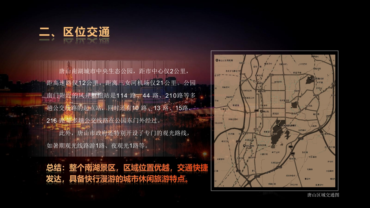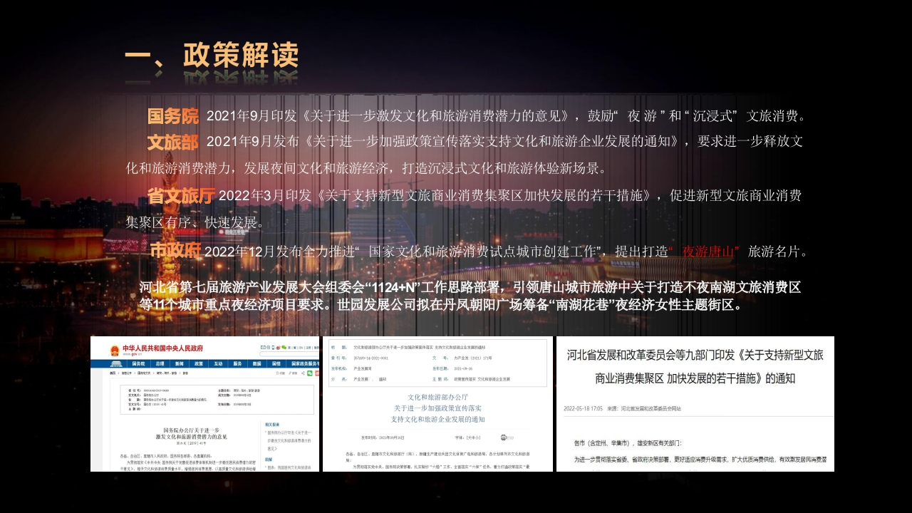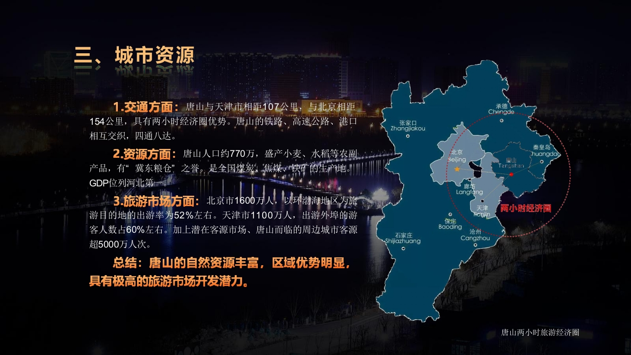 降潮花港实施藤北京中联花巷HH料香项目背景项目规划项目运营项目回报见@风@9②:花巷两01项目背塌·政策解读·城市资源·分析总结·区位交通·经济发展项目定位政策解读国务院2021年9月印发《关于进一步激发文化和旅游消费潜力的意见》,鼓励夜游”和“沉浸式”文旅消费。文旅部2021年9月发布《关于进一步加强政策宣传落实支持文化和旅游企业发展的通知》,要求进一步释放文化和旅游消费潜力,发展夜间文化和旅游经济,打造沉浸式文化和旅游体验新场景。省文旅厅2022年3月印发《关于支持新型文旅商业消费集聚区加快发展的若干措施》,促进新型文旅商业消费集聚区有序快速发展整市放疮2022年2月发布全力推进“国家文化和旅游消费试点城市创建工作,提出打造”夜游唐山”旅游名片。河北省第七届旅游产业发展大会组委会“1124+N工作思路部署,引领唐山城市旅游中关于打造不夜南湖文旅消费区等个城沛重点夜经济项目要求。世园发展公司拟在丹凤朝阳广场筹备“南湖花港”夜经济女性主题街区。鲁中华人民共和国中央人民政府回自口参年0例1进1量韩整发化未博遥等力公厅关于是一家如额离用得实生持次化加博得位业难真切文导力产坐湿13U11号河北省发展和改革委员会等九部门印发《关于支持新型文旅三国务度的明省发复五动服务风结国家政务服务商业消费集聚区加快发展的若干措施》的通知文化和旅游部办公厅东你关于进一步加强政策宣传落实2022-05-181705来潭:间北发元和改萃袋马会骨站支持文化和旅游企业发展的通知有国,2年%洞以日率韩,大申小灯白各市(含定州、辛集市),支新区有关都门:在。自配:文化发行》,程生产视超文光新r电.高推州皮为进一步贯彻落实省适、省改府决策部署,更好适破清费升级需末求,扩大优质清受供始,有效发居民清费潜二I区位交通山三女河机场小代相唐山南湖城市中央生态公园,距市中心仅2公里,正子明距高速路仪12公里,距离三女河机场仅21公里。公园南门附近的风井枢红站是114路,44路、210路等多趟公交线路的起点站,同时还有10路、13路15路216路等多趟公交线路在公园东门外经过。各且西此外,唐山市政府还特别开设了专门的观光路线,如暑期观光线路游1路、夜观光1路等。总结:整个南湖景区,区域位置优越,交通快捷发达,具备快行漫游的城市休闲旅游特点。付中沙龙子村等子唐山区域交通图三城市资源1.交通方面:唐山与天津市相距107公里,与北京相距154公里,具有两小时经济圈优势。唐山的铁路、高速公路、港口张家口Zhangjiakou相互交织,四通八达。秦皇岛2资源方面:唐山人口约770万,盛产小麦、水稻等农副huangda产品,有”冀东粮仓”之誉,:是全国煤炭焦煤钦阿附注产地。GDP位列河北第m。3旅游市场方面:北京市1600月人精海区燕Langi天津两小时经济园游目的地的出游率为52%左右。天津市1100万人,出游外埠的游保定客人数占60%左右。加上潜在客源市场、唐山而临的周边城市客源Baoding沧州·石家庄ShijiazhuangCangzhou超5000万人次。总结:唐山的自然资源丰富,区域优势明显具有极高的旅游市场开发潜力。唐山两小时旅游经济圈