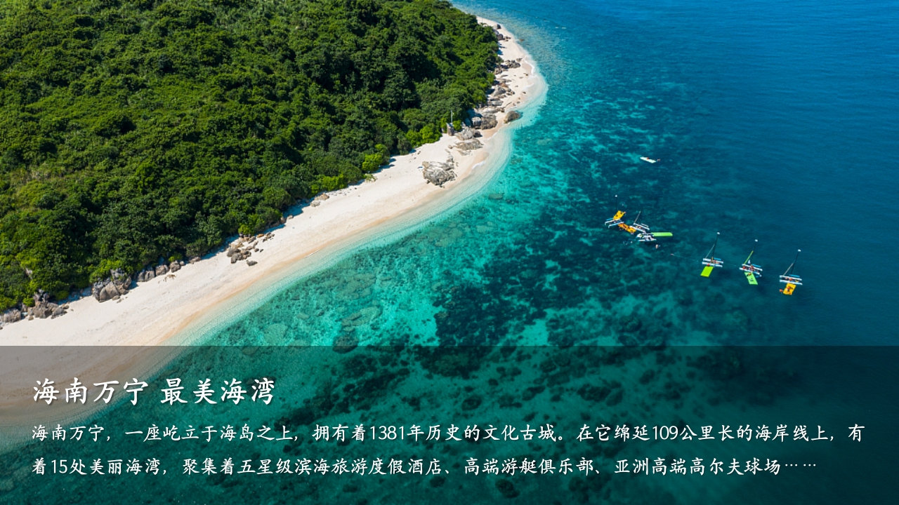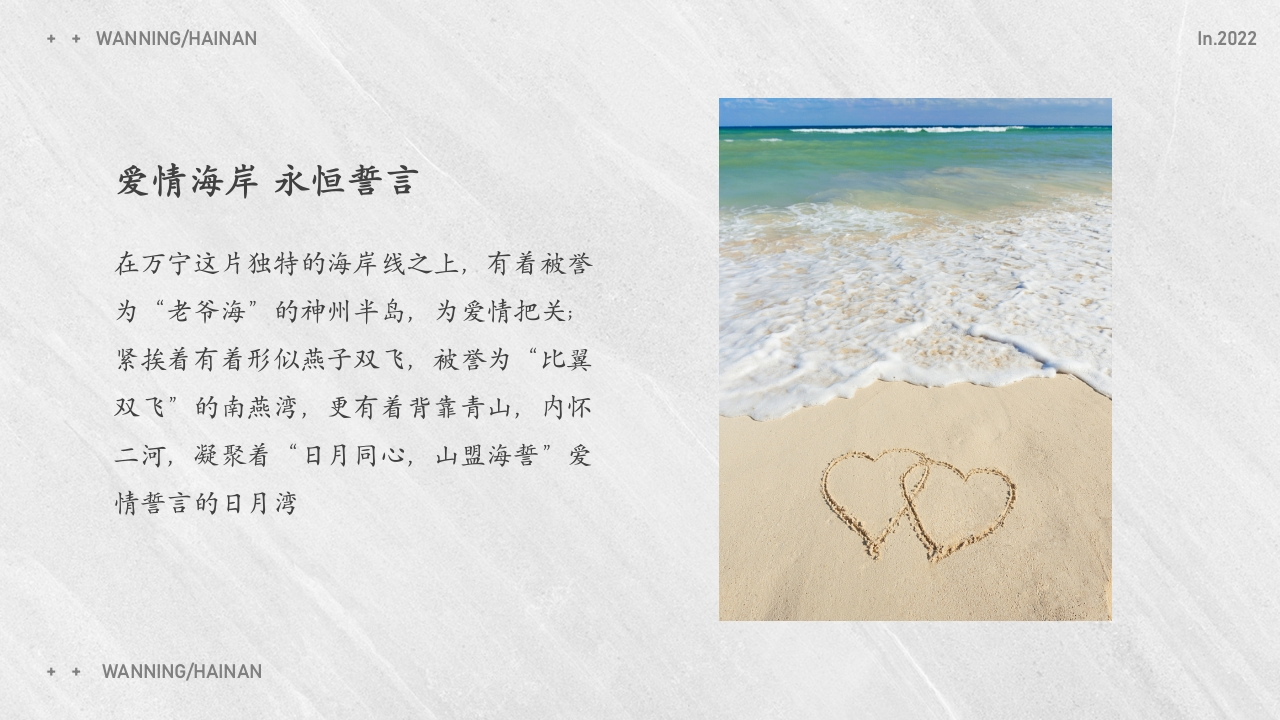 爱情海岸·一眼万绿海南万宁爱情海岸营销创意案汇报单位:海南省融媒体中心有些人,只是在人群中多看了一眼便再也无法忘记容颜有些人,只因为这一眼停留便是相知相守一辈子关于爱情,我们怀揣着多少年少勇敢多少回岁月廊桥的走走绊绊或许只是那一眼的悸动让我们说出口的山盟海誓懂得用一辈子来证明分年台海南万宁最美海湾海南万宁,一座屹立于海岛之上,拥有着1381年历史的文化古城。在它绵延109公里长的海岸线上,有着15处美丽海湾,聚集着五星级滨海旅游度假酒店、高端游艇俱乐部、亚洲高端高尔夫球场…ln.2022+WANNING/HAINAN0.0激情海岸冲浪胜地近年来,WSL、ISA两大世界冲浪权威组织的精品赛事齐聚万宁,让世界众多顶尖冲浪选手、无数岛内外游客领略到万宁激情海岸的动感与魅力,让万宁逐步走向国际化,成就另一番海上繁华天地+WANNING/HAINANln.2022爱情海岸永恒誓言在万宁这片独特的海岸线之上,有着被誉为“老爷海”的神州半岛,为爱情把关;紧挨着有着形似燕子双飞,被誉为“比翼双飞”的南燕湾,更有着背靠青山,内怀二河,凝聚着“日月同心,山盟海誓”爱情誓言的日月湾+WANNING/HAINANmme亚洲最大的天然游艇码头停留着爱情号的游艇,石梅湾静静诉说着所有的爱情元素,成为《非诚勿扰2》拍摄组开拍基地,成就海外、省内、本地三处情侣的爱情集结地这绵绵109公里海岸线,阳光明媚、沙滩洁白、原生态美景与纯真爱情完美交织,怎么都话不完…