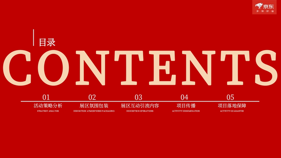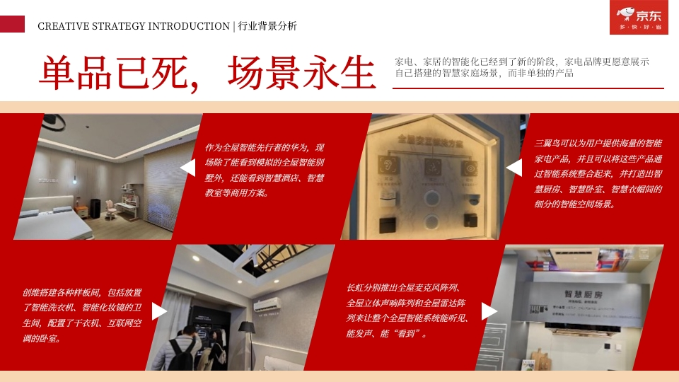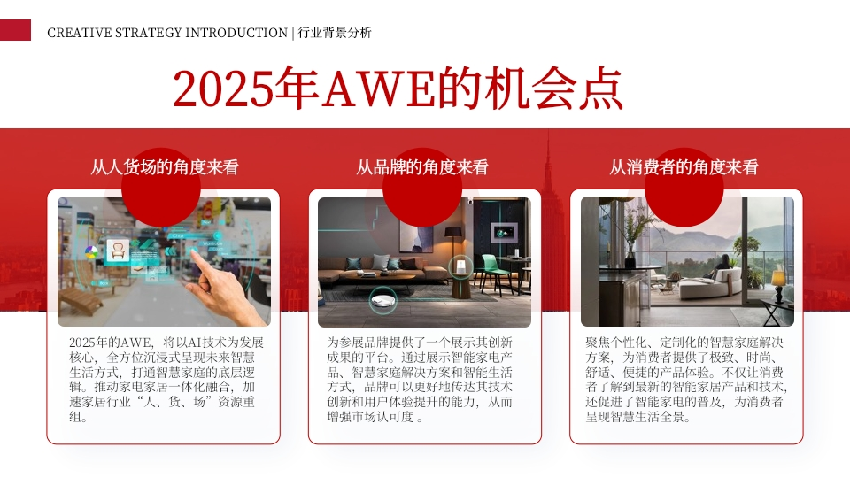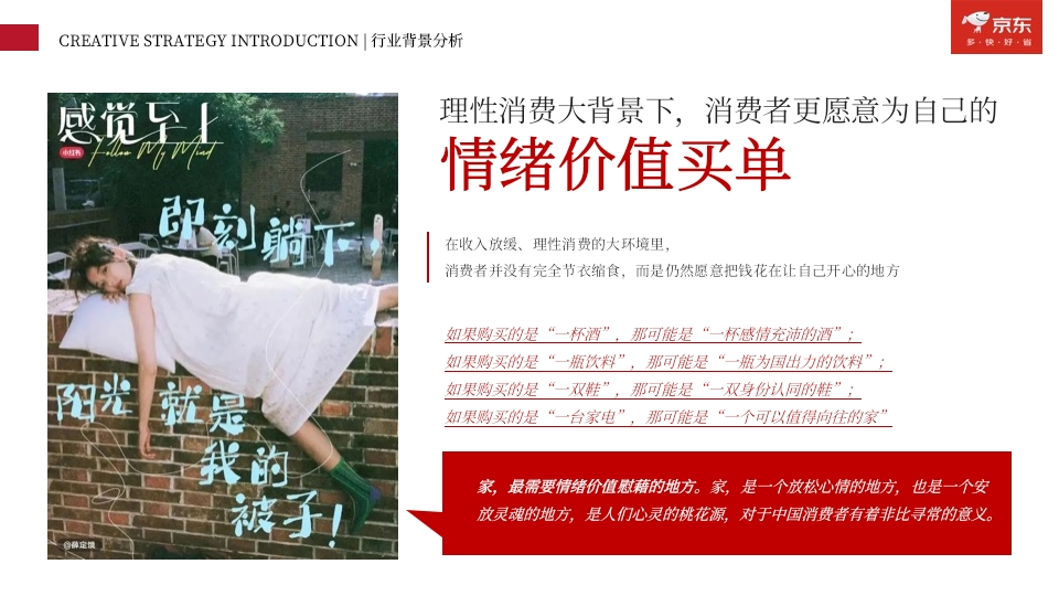 京东多·使·好借京东2025家电家居AWE项目创意策划案京东多使·好·省目录CONTENTS0102030405活动策略分析展区氛围包装展区互动引流内容项目传播项目落地保障STRATEGY ANALYSISEXHIBITION ATMOSPHERE PACKAGINGEXHIBITIO N OP ERATIONSACTIVITY DISSEMINATIONACTIVITY GUARANTE里京东多·使·好借CREATIVE STRATEGYINTRODUCTION01-策略分析严哈的赋予牌灵害白内通见誉著,由表及里侧造无果棉形THE LOGKCAL OO NCEFTION OF RIGOROUS FIT ENDOWS BRAND SOUL AND CONNOTATION.FROM THE OUISIDE TO THE INSIDE CREATE INFINITE SPLENDOR京东CREATIVE STRATEGY INTRODUCTION行业背景分析多·使·好·借感觉号理性消费大背景下,消费者更愿意为自己的情绪价值买单动游平在收入放缓、理性消费的大环境里,消费者并没有完全节衣缩食,而是仍然愿意把钱花在让自己开心的地方如果购买的是“一杯酒”,那可能是“一杯感情充沛的酒”:如果购买的是“一瓶饮料”,那可能是“一瓶为国出力的饮料”;和光就如果购买的是“一双鞋”,那可能是“一双身份认同的鞋”:如果购买的是“一台家电”,那可能是“一个可以值得向往的家”我的家,最需要情绪价值慰藉的地方。家是一个放松心情的地方,也是一个安被放灵魂的地方,是人们心灵的桃花源,对于中国消费者有着非比寻常的意义。京东CREATIVE STRATEGY INTRODUCTION|行业背景分析多·快·好雪单品已死,场景永生家电、家居的智能化已经到了新的阶段,家电品牌更愿意展示自己搭建的智慧家庭场景,而非单独的产品作为全屋智能先行者的华为,现三翼鸟可以为用户提供海量的智能场除了能看到模拟的全屋智能刷家电产品,并且可以将这些产品通墅外,还能看到智慧酒店、智慰过智能系统整合起来,并打造出智救室等商用方案慧厨房智慰卧室、智慰衣间的细分的智能空间场景。创维搭建各种样板间,包括放置长虹分刷推出全星麦克风阵列智慧厨房了智能洗衣机、智能化妆镜的卫全屋立体声啊阵列和全屋雷达阵生间,配置了干衣机、互联网空列来让整个全虽智能系统能所见、调的卧室。能发声、能“看到”。CREATIVE STRATEGY INTRODUCTION行业背景分析2025年AWE的机会点从人货场的角度来看从品牌的角度来看从消费者的角度来看2025年的AWE,将以AI技术为发展为参展品牌提供了一个展示其创新聚焦个性化、定制化的智慧家庭解决核心,全方位沉浸式呈现未来智慧成果的平台。通过展示智能家电产方案,为消费者提供了极致、时尚、生活方式,打通智慧家庭的底层逻品、智慧家庭解决方案和智能生活舒适、便捷的产品体验。不仅让消费辑。推动家电家居一体化融合,加方式,品牌可以更好地传达其技术者了解到最新的智能家居产品和技术速家居行业“人、货、场”资源重创新和用户体验提升的能力,从而还促进了智能家电的普及,为消费者组。增强市场认可度。呈现智慧生活全景。