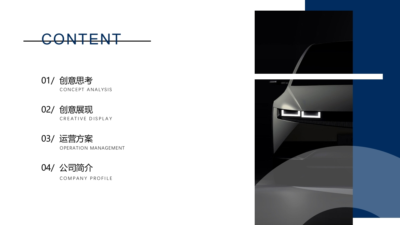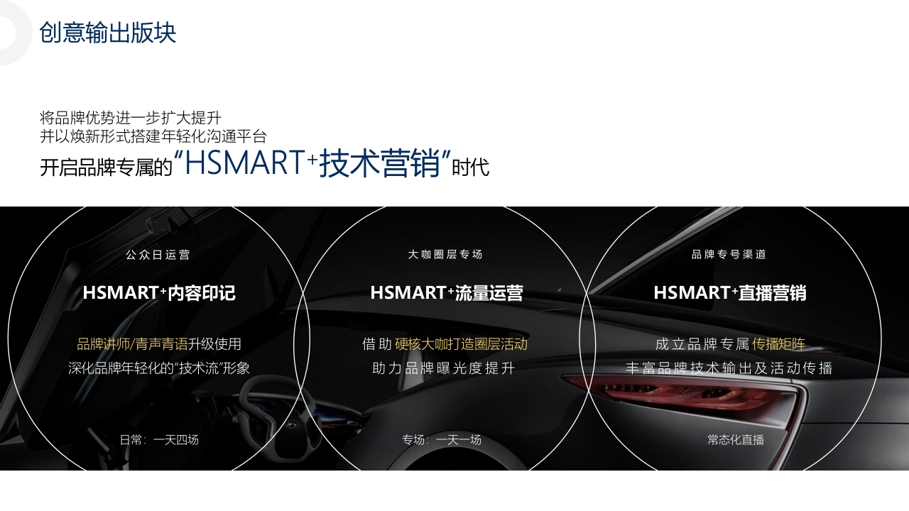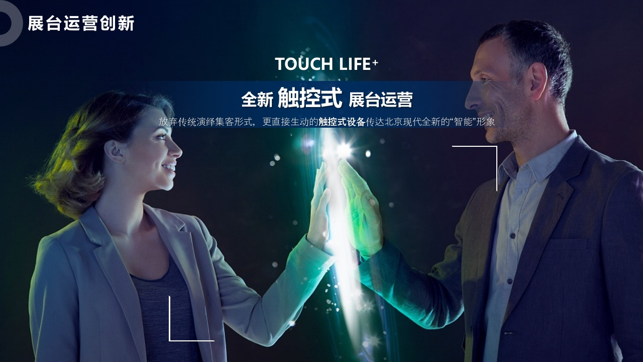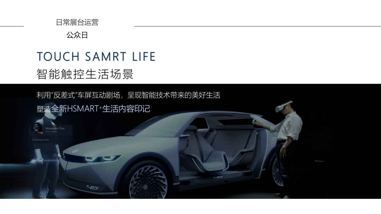 北京现代国际车展运营BEIJING HYUNDAI AUTO SHOW OPERATION OF AB CLASSHYUNDACONTENT01/创意思考CONCEPT ANALYSIS02/创意展现CREATIVE DISPLAY03/运营方案OPERATION MANAGEMENT04/公司简介COMPANY PROFILE01创意思考ONCEPT ANALYSIS展台运营创新TOUCH LIFE*全新触控式展台运营放弃传统演绎集客形式,更直接生动的触控式设备传达北京现代全新的“智能”形象创意输出版块将品牌优势进一步扩大提升并以焕新形式搭建年轻化沟通平台开启品牌专属的”HSMART+技术营销”时代公众日运营大咖圈层专场品牌专号渠道HSMART+内容印记HSMART+流量运营HSMART+直播营销品牌讲师/青声青语升级使用借助硬核大打造圈层活动成立品牌专属传播矩阵深化品牌年轻化的“技术流"形象助力品牌曝光度提升丰富品牌技术输出及活动传播日常:一天四场专场:一天一场常态化直播日常展台运营公众日TOUCH SAMRT LIFE智能触控生活场景利用“反差式”车屏互动剧场,呈现智能技术带来的美好生活塑造全新HSMART+生活内容印记写