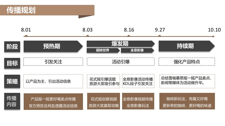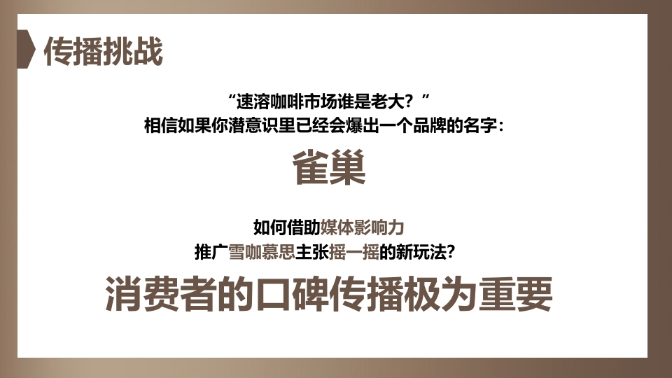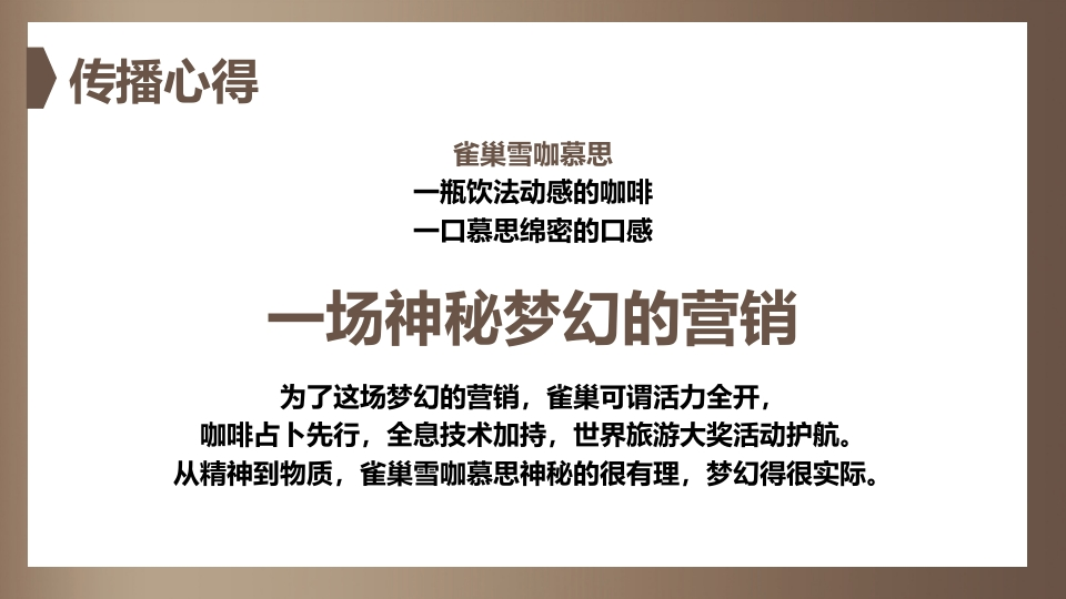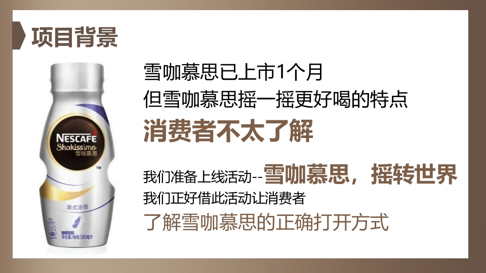 NESCAFE雀巢咖啡摇转世界邂逅梦幻雪咖慕思雪咖慕思新品传播结案报告项目背景雪咖慕思已上市1个月但雪咖慕思摇一摇更好喝的特点NESCAFE消费者不太了解Shakissimo雪随慕思我们准备上线活动-雪咖慕思,摇转世界我们正好借此活动让消费者意式浓香了解雪咖慕思的正确打开方式格180传播挑战“速溶咖啡市场谁是老大?”相信如果你潜意识里已经会爆出一个品牌的名字:雀巢如何借助媒体影响力推广雪咖慕思主张摇一摇的新玩法?消费者的口碑传播极为重要传播心得雀巢雪咖慕思一瓶饮法动感的咖啡一口慕思绵密的口感一场神秘梦幻的营销为了这场梦幻的营销,雀巢可谓活力全开,咖啡占卜先行,全息技术加持,世界旅游大奖活动护航。从精神到物质,雀巢雪咖慕思神秘的很有理,梦幻得很实际。传播策略社交媒体网络口碑口碑传播创作话题内容,KOL,奠定产品口碑,让大V吸引网友认识雪媒体组合网友深入了解产品咖慕思,加深口碑传使用的正确方法。播。知乎Ba总传播规划8.018.038.169.2710.10阶段预热期爆发期持续期摇转世界全息影像目标引发关注活动引爆强化产品特点策略总结雪咖慕思摇一摇产品卖点,以产品为主,引出活动信息花式摇引爆话题全息影像活动传播旅游大奖吸引参与KOL段子引发关注新闻等媒体为活动做升华。传播产品摇一摇更好喝卖点传播花式摇创意视频全息影像视频传播咖啡新玩法,有趣又好喝内容官方预告及网友透露活动信息旅游大奖赢取攻略全息影像玩法更新奇的咖啡,更好喝的味道