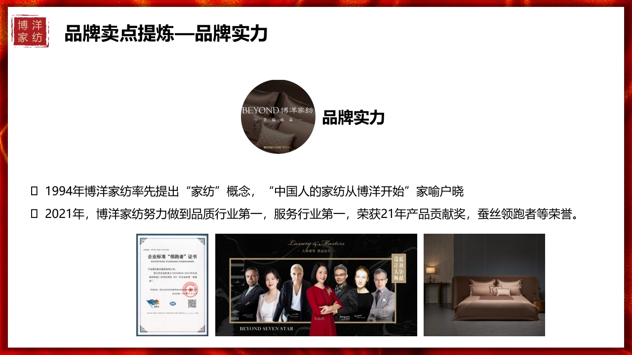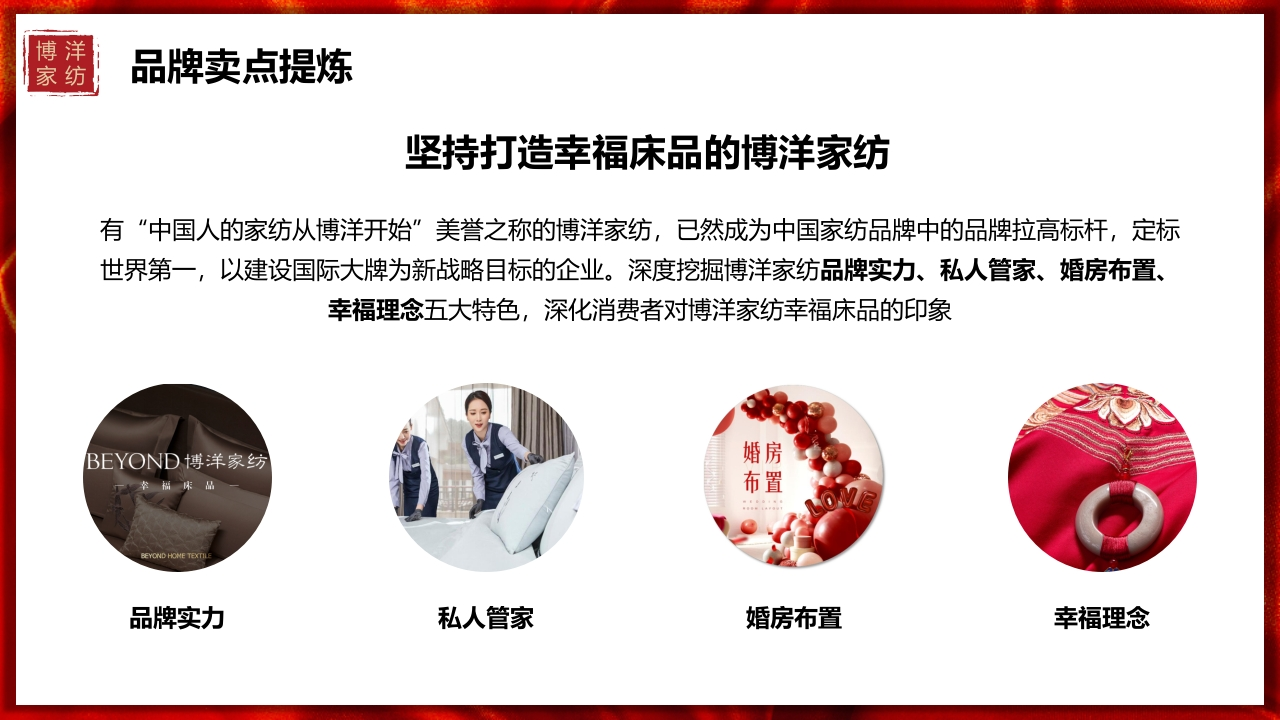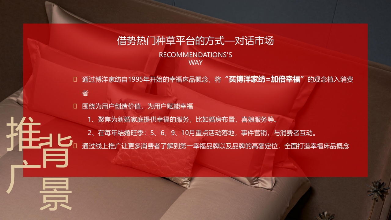 博洋博洋家纺家纺幸福项目全案推广方案项目洞察··营销策略。。…内容规划…目录壹贰参博洋项目洞察第壹章借势热门种草平台的方式一对话市场RECOMMENDATIONS'SWAY口通过博洋家纺自1995年开始的幸福床品概念,将“买博洋家纺=加倍幸福”的观念植入消费者口围绕为用户创造价值,为用户赋能幸福1、聚焦为新婚家庭提供幸福的服务,比如婚房布置,喜娘服务等。2、在每年结婚旺季:5、6、9、10月重点活动落地,事件营销,与消费者互动。背景通过线上推广让更多消费者了解到第一幸福品牌以及品牌的高奢定位,全面打造幸福床品概念博洋家纺品牌卖点提炼坚持打造幸福床品的博洋家纺有“中国人的家纺从博洋开始”美誉之称的博洋家纺,已然成为中国家纺品牌中的品牌拉高标杆,定标世界第一,以建设国际大牌为新战略目标的企业。深度挖掘博洋家纺品牌实力、私人管家、婚房布置、幸福理念五大特色,深化消费者对博洋家纺幸福床品的印象BEYOND博洋家纺婚房布置品牌实力私人管家婚房布置幸福理念博洋家纺品牌卖点提炼一品牌实力BEYOND博详家纺品牌实力·1994年博洋家纺率先提出“家纺”概念,“中国人的家纺从博洋开始”家喻户晓·2021年,博洋家纺努力做到品质行业第一,服务行业第一,荣获21年产品贡献奖,蚕丝领跑者等荣誉。Zuwn hastes一大师视界者品由生企业标准“领跑者”证书BEYOND SEVEN STAR