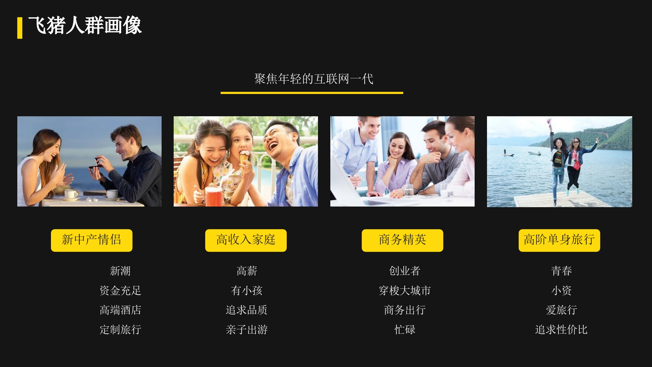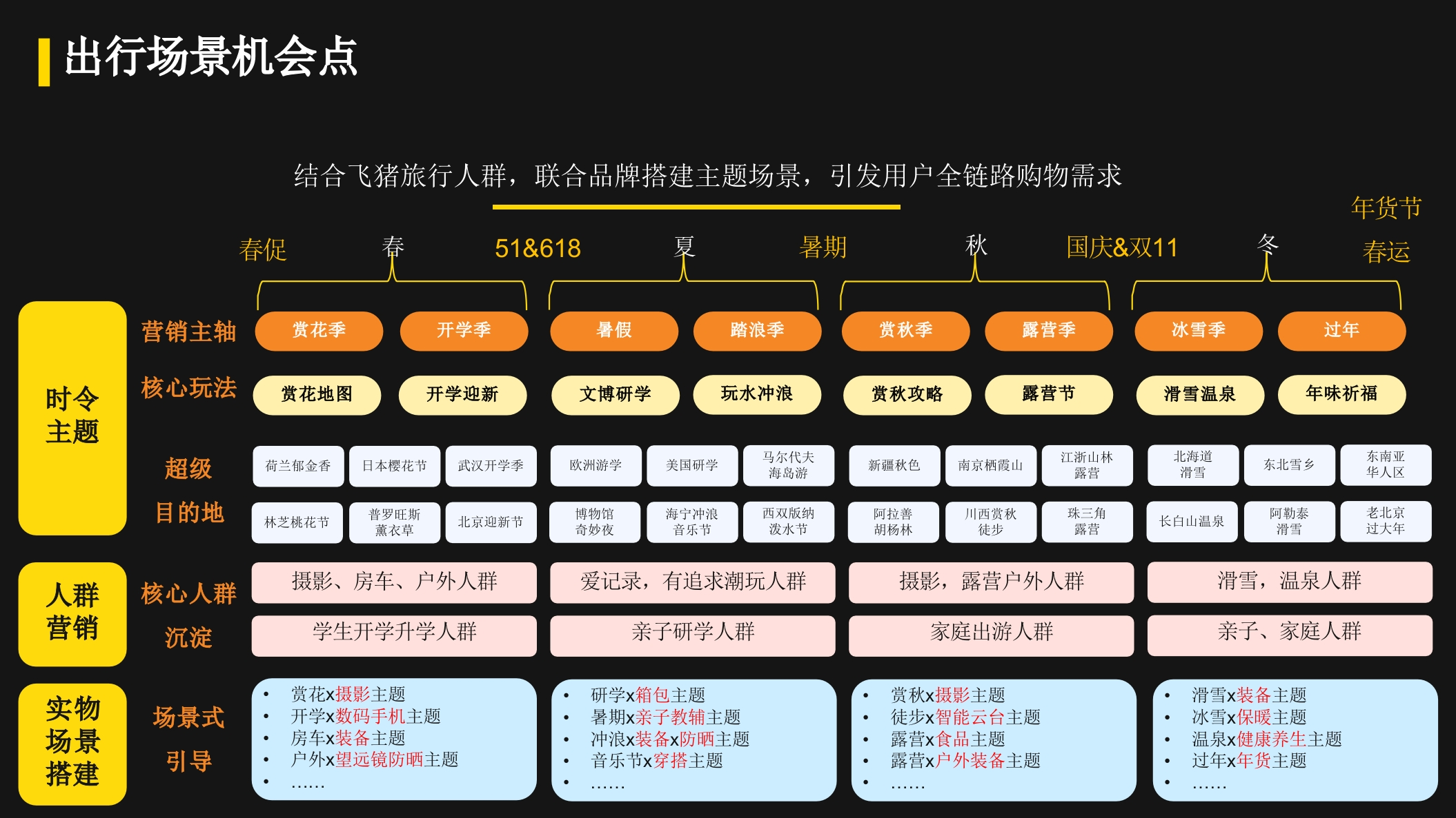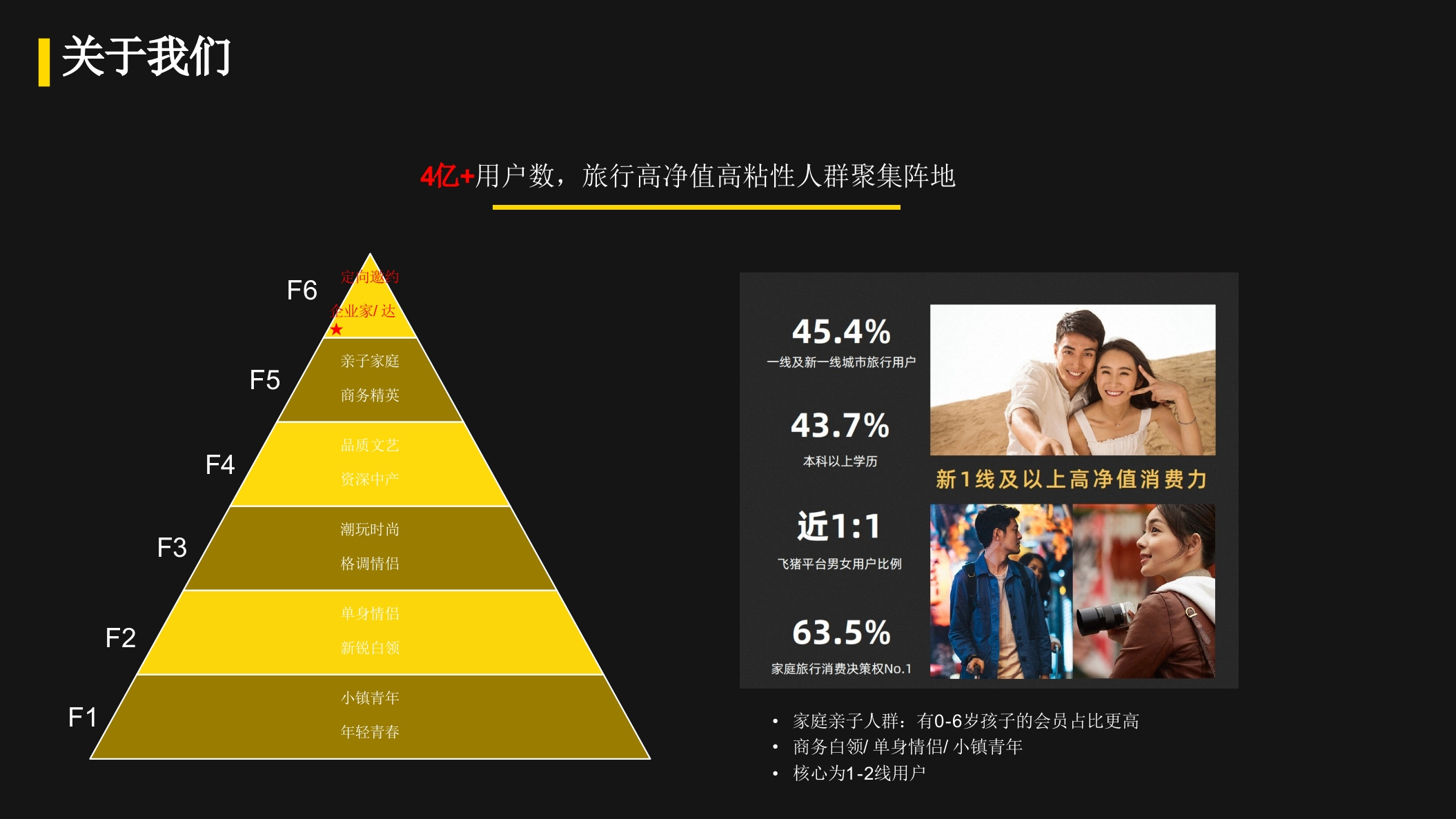 猪旅行飞猪飞天计划招商方案飞猪用户及平台业务中心@Fliggy关于我们4亿+用户数,旅行高净值高粘性人群聚集阵地F6业家/达45.4%亲子家庭一线及新一线城市旅行用户F5商务精英43.7%品质文艺F4本科以上学历资深中产新1线及以上高净值消费力潮玩时尚近1:1F3格调情侣飞猪平台男女用户比例单身情侣F2新锐自领63.5%家庭旅行消费决策权No.1小镇青年F1年轻青春·家庭亲子人群:有0-6岁孩子的会员占比更高·商务白领/单身情侣/小镇青年·核心为1-2线用户【飞猪人群画像聚焦年轻的互联网一代新中产情侣高收入家庭商务精英高阶单身旅行新潮高薪创业者青春资金充足有小孩穿梭大城市小资高端酒店追求品质商务出行爱旅行定制旅行亲子出游忙碌追求性价比出行场景机会点结合飞猪旅行人群,联合品牌搭建主题场景,引发用户全链路购物需求年货节春促51&618暑期国庆&双11春运营销主轴赏花季开学季暑假踏浪季赏秋季露营季冰雪季过年时令核心玩法赏花地图开学迎新文博研学玩水冲浪赏秋攻略露营节滑雪温泉年味祈福主题超级荷兰郁金香日本樱花节武汉开学季欧洲游学美国研学马尔代夫新疆秋色南京栖霞山江浙山林北海道东南亚海岛游露营滑雪东北雪乡华人区目的地林芝桃花节普罗旺斯北京迎新节博物馆海宁冲浪西双版纳阿拉善川西赏秋珠三角薰衣草奇妙夜长白山温泉阿勒泰老北京音乐节泼水节胡杨林徒步露营滑雪过大年人群核心人群摄影、房车、户外人群爱记录,有追求潮玩人群摄影,露营户外人群滑雪,温泉人群营销沉淀学生开学升学人群亲子研学人群家庭出游人群亲子、家庭人群赏花x摄影主题实物研学x箱包主题赏秋x摄影主题滑雪x装备主题场景式开学x数码手机主题暑期x亲子教辅主题徒步x智能云台主题冰雪×保暖主题场景房车x装备主题冲浪x装备x防晒主题露营x食品主题。温泉x健康养生主题搭建引导户外x望远镜防晒主题音乐节x穿搭主题露营x户外装备主题过年x年货主题。猪旅行在出行场禄共创,携手品牌打造跨界营销!跨界营销通过跨界,为品牌解决了什么?品牌★群焕品牌声量打造产品溢价及收益新3人群互导,为实物品牌飞猪平台&飞猪行8实物品牌一起通过品牌双向叠加与互补效应吸引年轻高价值用户群体联合打造声量,提升曝光提升产品溢价能力,给品牌创造额外收益