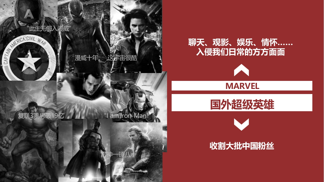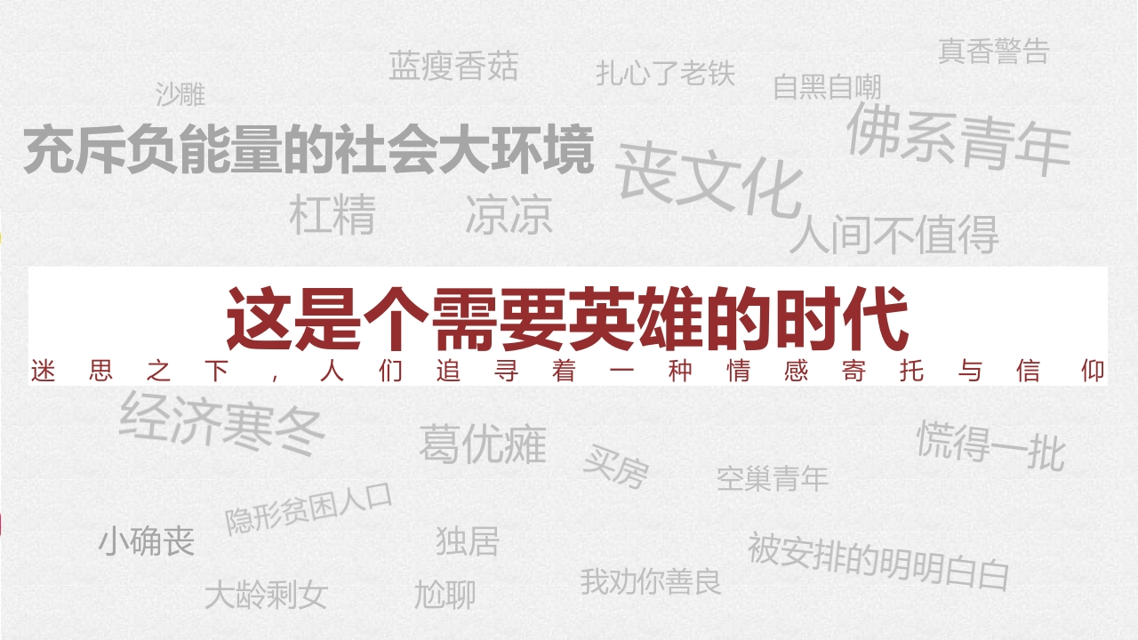 头系今日头条HLA燃吧信息创游价值HLA春夏新品推广方案魂国蓝瘦香菇真香警告扎心了老铁沙雕自黑自嘲充斥负能量的社会大环境丧文佛系青年杠精凉凉人间不值得这是个需要英雄的时代迷思之下,人们追寻着种情感寄托与信仰经济寒冬葛优瘫买房慌得一批空巢青年隐形贫困人口小确丧独居大龄剩女尬聊我劝你善良被安排的明明白白“此生无海入漫威GAPTAIN AMERICA:CINIL WAR聊天、观影、娱乐、情怀…入侵我们日常的方方面面漫威十年这宇宙很酷MARVEL国外超级英雄收割大批中国粉丝一锤渐渐淡忘孙悟空大闹天宫、哪吒闹海、沉香救母.…国民英雄经典重生国民品牌海澜之家将国漫经典重新带入人们的生活中唤醒每个人心里沉睡着的那位属于我们自己的超级英雄齐天大圣孙传空增强品牌美誉度唤起国漫记忆消费者HLA海澜之家重塑骄傲大庆宫国民品牌国漫骄傲当现代化的设计灵感注入经久不衰的文化创意能量,骄傲上身,穿上属于国人的经典文化,尽情地