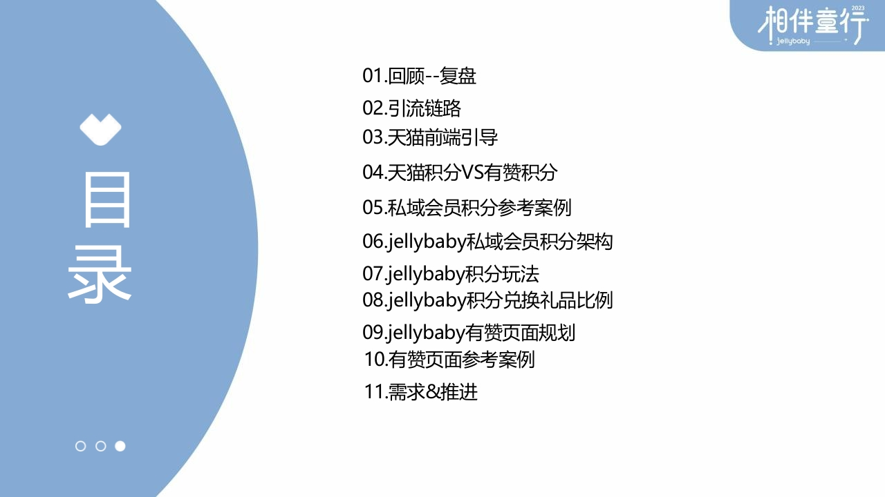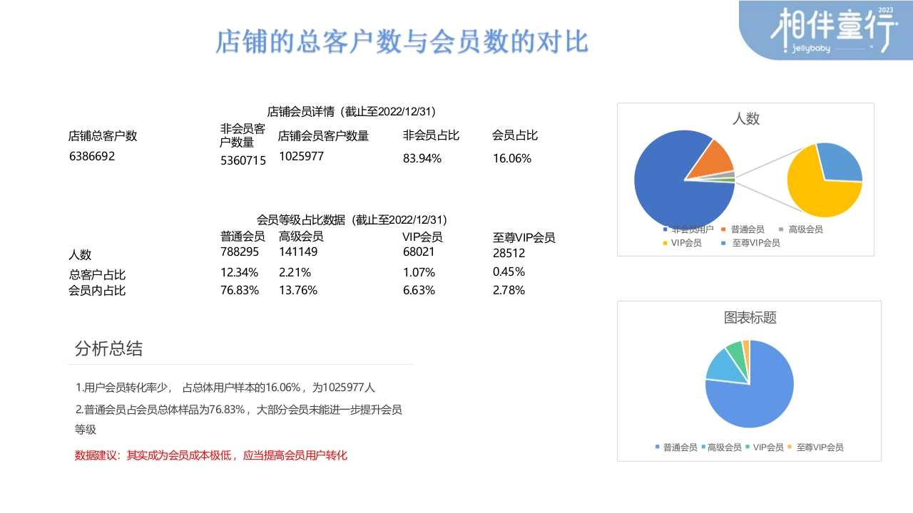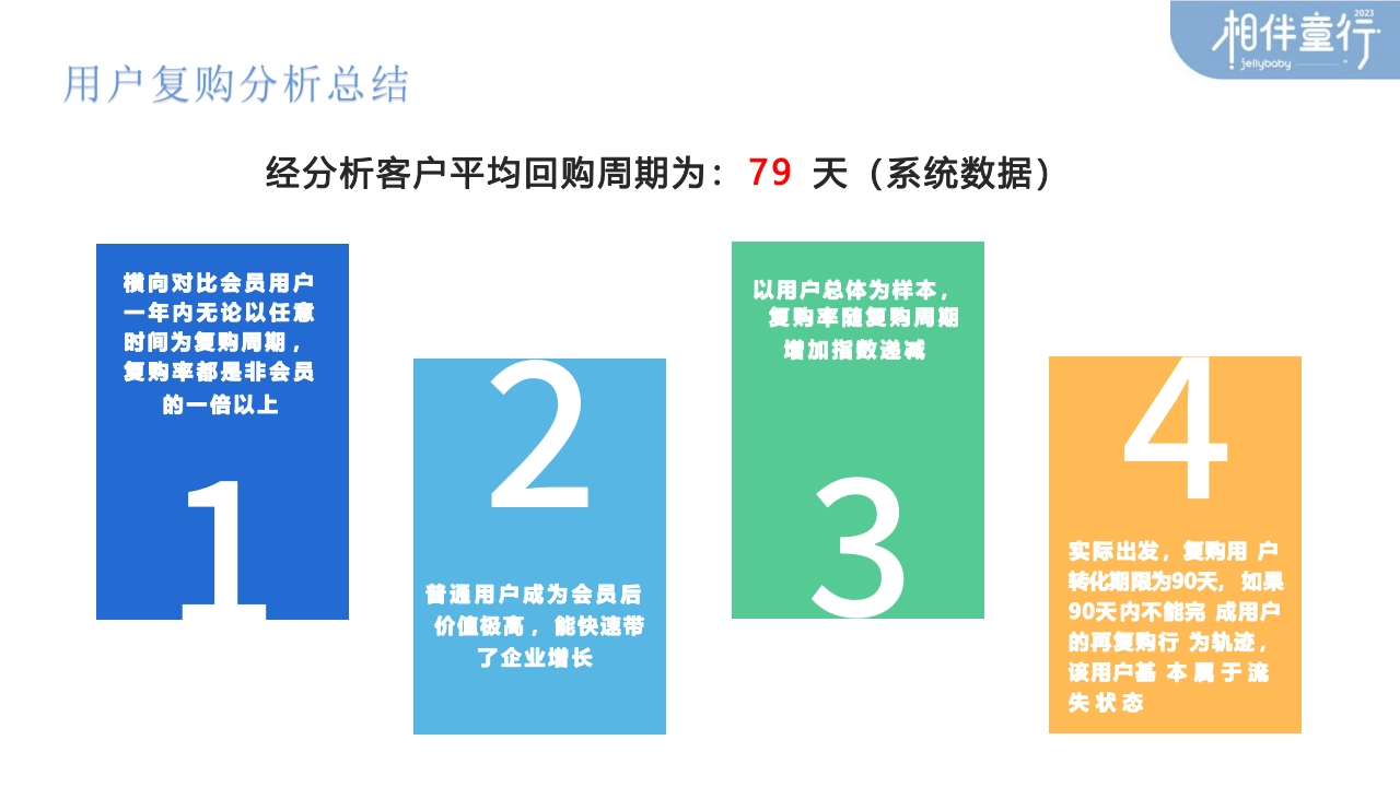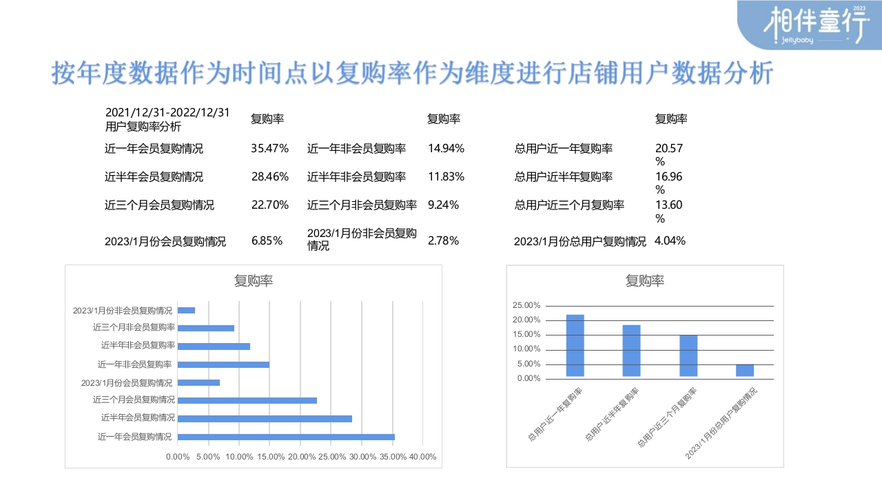 相件童行Jelly baby杰里贝比用爱相伴/织造童年Spend your childhood with love●相件童行01.回顾-复盘02.引流链路03.天猫前端引导04.天猫积分VS有赞积分05.私域会员积分参考案例录06,jellybaby私域会员积分架构07,jellybaby积分玩法08,jellybaby积分兑换礼品比例09,jellybaby7有赞页面规划10.有赞页面参考案例11.需求&推进00●相件童行jellyboby01.回顾-复盘店铺的总客户数与会员数的对比相件童行店铺会员详情(截止至2022/1231)人数店铺总客户数非会员客户数量店铺会员客户数量非会员占比会员占比63866925360715102597783.94%16.06%会员等级占比数据(截止至2022/1231)普通会员高级会员VMP会员至尊VIP会员口公为用户。普通会员·高级会员。VIP会员■至尊VIP会员人数7882951411496802128512总客户占比12.34%2.21%1.07%0.45%会员内占比76.83%13.76%6.63%2.78%图表标题分析总结1用户会员转化率少,占总体用户样本的16.06%,为1025977人2.普通会员占会员总体样品为76.83%,大部分会员未能进一步提升会员等级■普通会员■高级会员。VIP会员·至尊VIP会员数据健议:其实成为会员成本极低,应当提高会员用户转化相件童行按年度数据作为时间点以复购率作为维度进行店铺用户数据分析2021/12/31-2022/12/31用户复购率分析复购率复购率复购率近一年会员复购情况35.47%近一年非会员复购率14.94%总用户近一年复购率20.57%近半年会员复购情况28.46%近半年非会员复购率11.83%总用户近半年复购率16.96%近三个月会员复购情况22.70%近三个月非会员复购率9.24%总用户近三个月复购率13.60%2023/1月份会员复购情况6.85%2023/1月份非会员复购情况2.78%2023/1月份总用户复购情况4.04%复购率复购率2023/1月份非会员复购情况25.00%20.00%近三个月非会员复购率15.00%近半年非会员复购率10.00%近一年非会员复购率5.00%2023/1月份会员复购情况0.00%近三个月会员复购情况近半年会员复购情况总用户近一年复购率总用户近半年复购率近一年会员复购情况总用户近三个月复购率202311月份总用户复购情况0.00%5.00%10.00%15.00%20.00%25.00%30.00%35.00%40.00%相件童行用户复购分析总结经分析客户平均回购周期为:79天(系统数据)横向对比会员用户以用户总体为样本一年内无论以任意复购率随复购周期时间为复购周期,增加指数递减复购率都是非会员的一倍以上23实际出发,复购用户普通用户成为会员后转化期限为90天,如果价值极高,能快速带90天内不能完成用户了企业增长的再复购行为轨迹,该用户盖本调于流失状态