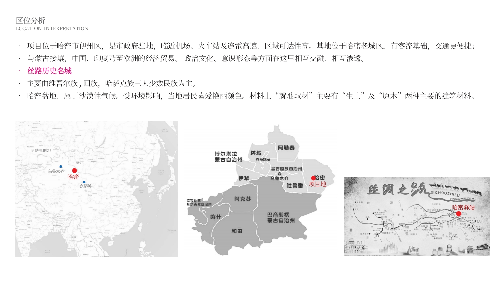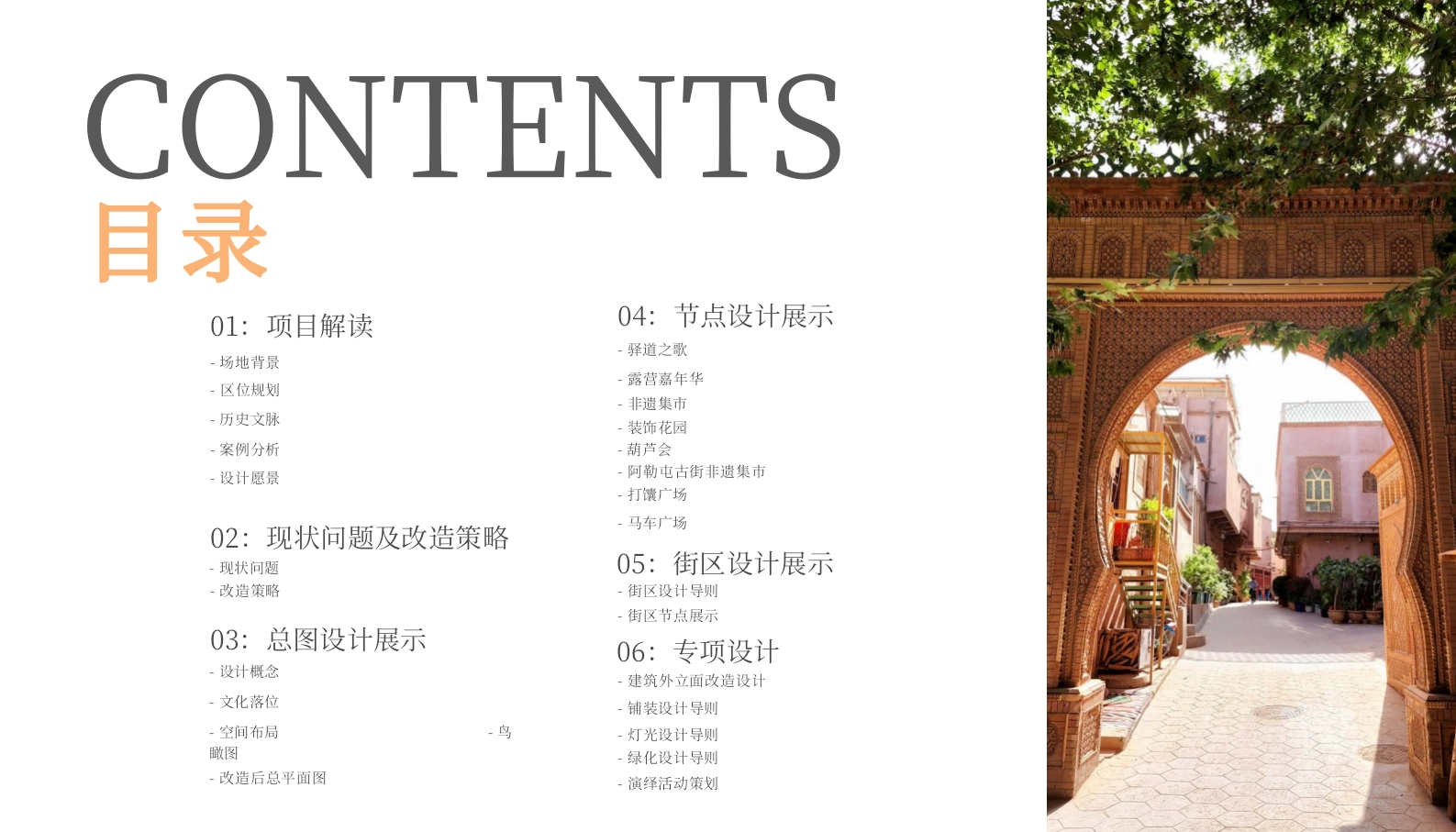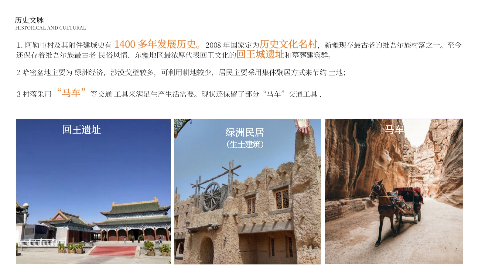 哈密伊州区阿勒屯古街特色文化街区建设项目概念设计方案HAMI YIZHOU DISTRICT ALETUN ANCIENT STREET CHARACTERISTIC CULTURAL BLOCK CONSTRUCTION PROJECTCONCEPT DESIGNCONTENTS目录01:项目解读04:节点设计展示驿道之歌,场地背景区位规划露营嘉年华·非遗集市,历史文脉·装饰花园案例分析葫芦会,设计愿景,阿勒屯古街非遗集市打馕广场马车广场02:现状问题及改造策略,现状问题05:街区设计展示,改造策略街区设计导则街区节点展示03:总图设计展示06:专项设计设计概念建筑外立面改造设计,文化落位铺装设计导则空间布局-鸟·灯光设计导则瞰图绿化设计导则·改造后总平面图演绎活动策划项目解读SITE UNDERSTANDING区位分析LOCATION INTERPRETATION·项目位于哈密市伊州区,是市政府驻地,临近机场、火车站及连霍高速,区域可达性高。基地位于哈密老城区,有客流基础,交通更便捷;与蒙古接壤,中国、印度乃至欧洲的经济贸易、政治文化、意识形态等方面在这里相互交融、相互渗透。丝路历史名城主要由维吾尔族,回族,哈萨克族三大少数民族为主。哈密盆地,属于沙漠性气候。受环境影响,当地居民喜爱艳丽颜色。材料上“就地取材”主要有“生土”及“原木”两种主要的建筑材料。哈萨克斯坦阿勒泰博尔塔拉塔城刀蒙古自治州克拉玛依乌鲁木齐昌吉回族自治州哈密伊犁乌鲁木齐密〈吐鲁番项目地丝绸之妍M水修aSICHOUZHILU高资残致自老州阿克苏哈密驿站喀什巴音郭楞●蒙古自治州和田区位规划LOCATION PLANNING哈密文化窗口丝路历史名城西域襟喉”丝路重镇”之称66丝绸之路经济带核心区新的旅游文化中心旅游兴疆“文化润疆文化复兴,城市振兴工程。0历史文脉HISTORICAL AND CULTURAL1.阿勒屯村及其附件建城史有1400多年发展历史。2008年国家定为历史文化名村,新疆现存最古老的维吾尔族村落之一。至今还保存着维吾尔族最古老民俗风情、东疆地区最浓厚代表回王文化的回王城遗址和墓葬建筑群。2哈密盆地主要为绿洲经济,沙漠戈壁较多,可利用耕地较少,居民主要采用集体聚居方式来节约土地;3村落采用“马车”等交通工具来满足生产生活需要。现状还保留了部分“马车”交通工具·回王遗址绿洲民居(生土建筑)丽丽严流表
