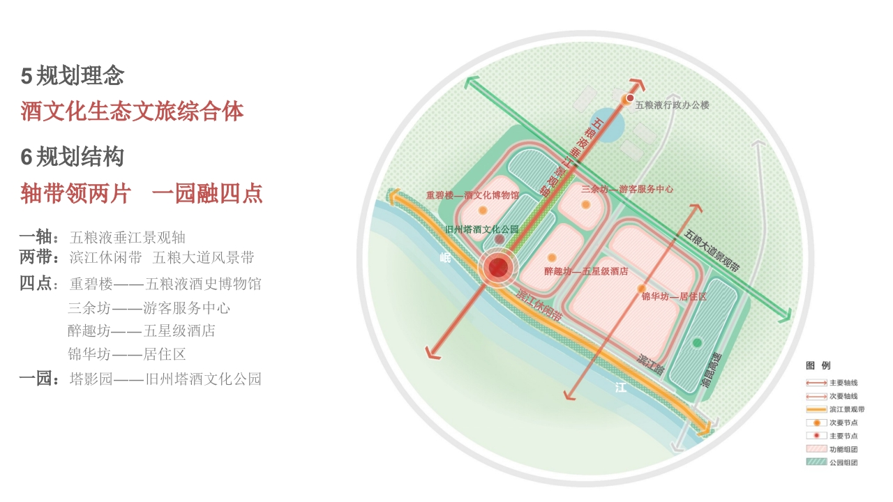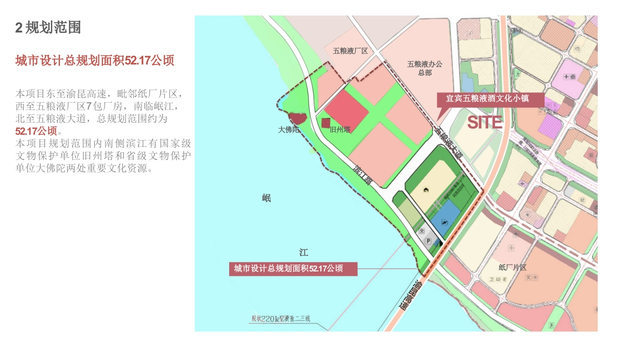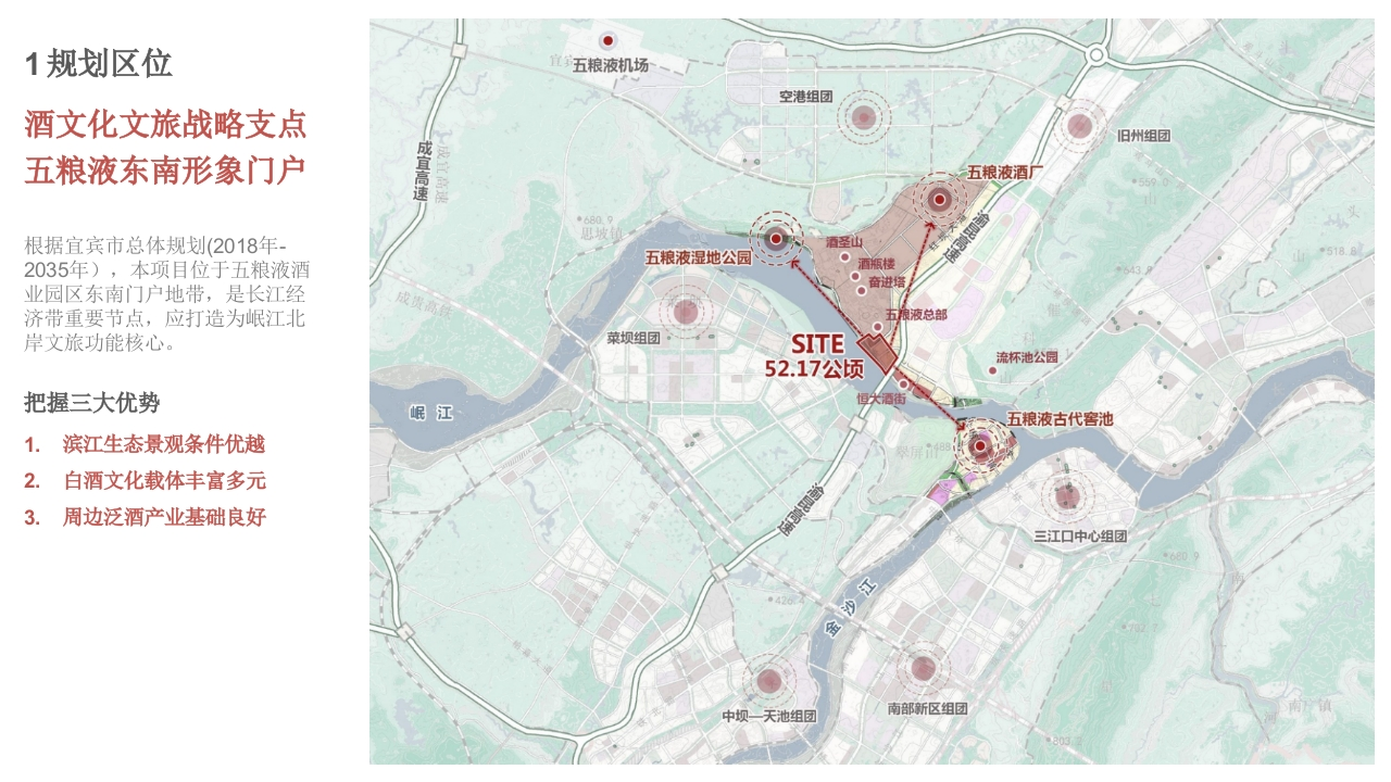 粮液小销054华64有宜宾市五粮液酒文化小镇城市设计●1规划区位五粮液机场、空港组团酒文化文旅战略支点旧州组团五粮液东南形象门户五粮液酒】思坡根据宜宾市总体规划(2018年酒圣山2035年),本项目位于五粮液酒五粮液湿地公园酒瓶楼业园区东南门户地带,是长江经济带重要节点,应打造为岷江北成贵意泉液总部岸文旅功能核心。菜坝组团。SITE52.17公顷流杯池公园把握三大优势岷江一、五粮液古代窖池1.滨江生态景观条件优越2.白酒文化载体丰富多元3.周边泛酒产业基础良好三江口中心组团金沙中坝一天池组团南部新区组团2规划范围五粮液厂区城市设计总规划面积52.17公顷五粮液办公总部本项目东至渝昆高速,毗邻纸厂片区,宜宾五粮液酒文化小镇西至五粮液厂区7包厂房,南临岷江,北至五粮液大道,总规划范围约为大佛底旧州塔SITE52.17公顷。本项目规划范围内南侧滨江有国家级五粮液大文物保护单位旧州塔和省级文物保护单位大佛陀两处重要文化资源。岷江城市设计总规划面积5217公顷纸厂片区卫幼老文现状2201kW承夜二三线3落实三大背景立足宜宾引领中国影响世界背景一背景二背景三内江歌】明代【窖池德房)代出现了“前店后厂工作坊明自声市创家5A级区的手工作37500宾五液白酒金三角大新模式新经济新体验白酒文化旅游5A景区模式宜宾五粮液泛酒产业集群五粮液历史文化展示体验中心景区化协同创新发展六酒十二景缘起重碧拈春蒸馏古法酒+产业集群打造主题沉浸式体验名自姚子雪曲杂粮烝酿4功能定位五粮液酒文化小镇五粮液5A级景区核心区五粮液企业形象展示区五粮液区域交往会客厅5规划理念酒文化生态文旅综合体五粮液行政办公楼6规划结构轴带领两片一园融四点游客服务中心重碧楼一文化博物馆●一轴:旧州塔酒文化公园五粮液垂江景观轴两带:滨江休闲带五粮大道风景带五粮大道景观带醉趣坊一五星级酒店四点:重碧楼一一五粮液酒史博物馆三余坊一一游客服务中心滨江休闲带锦华坊一居住区醉趣坊一一五星级酒店锦华坊一一居住区滨江一园:塔影园一一旧州塔酒文化公园渝昆高速图例一主要轴线✉次要轴线口滨江景观带■口次要节点■。☐主要节点☑功能组团刀公园组团