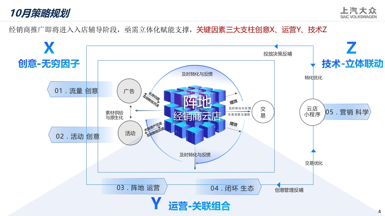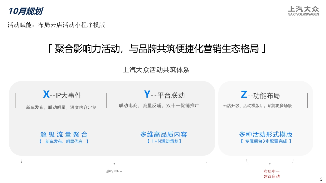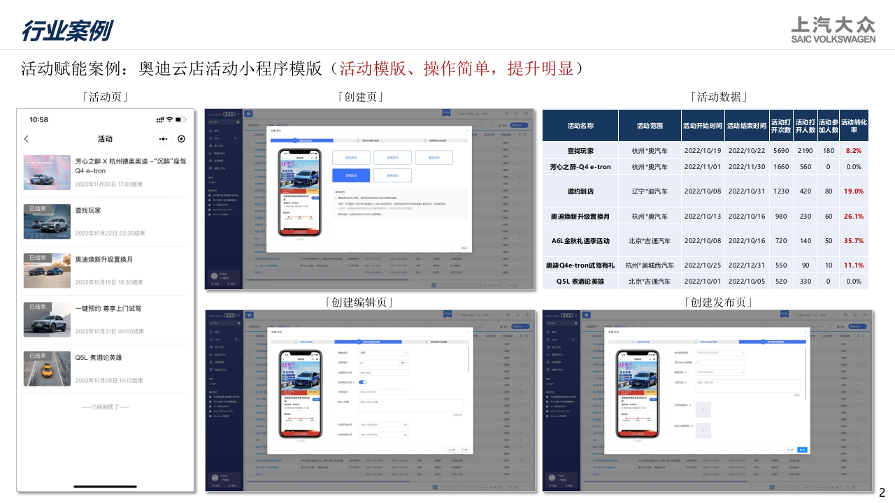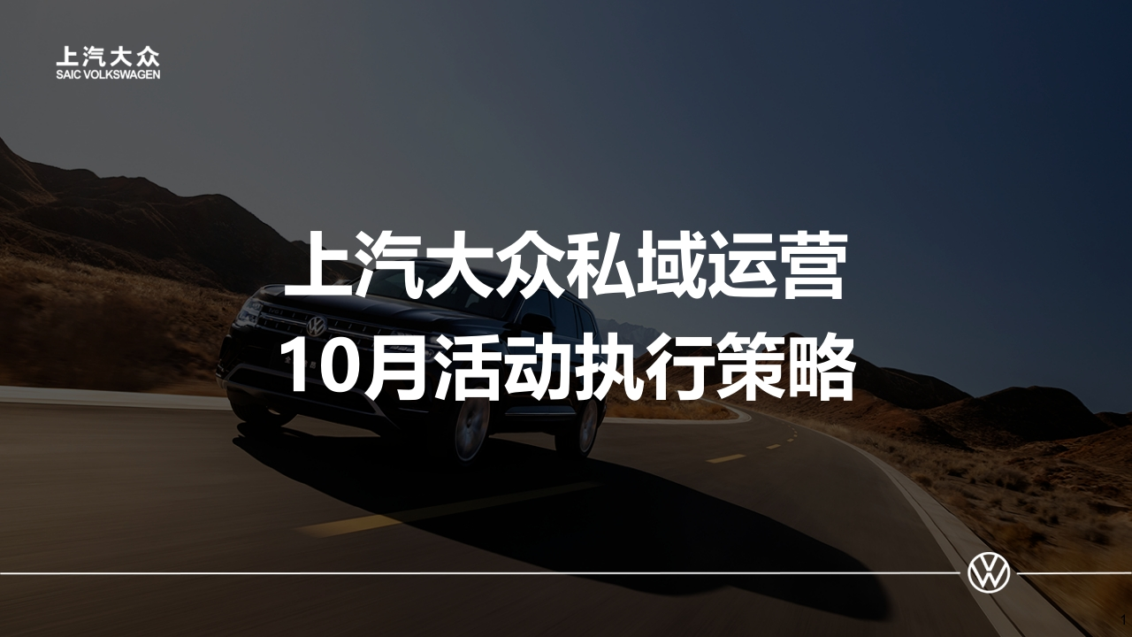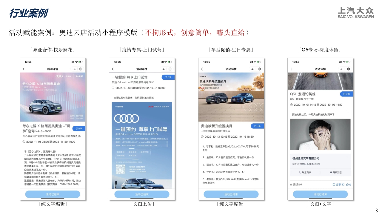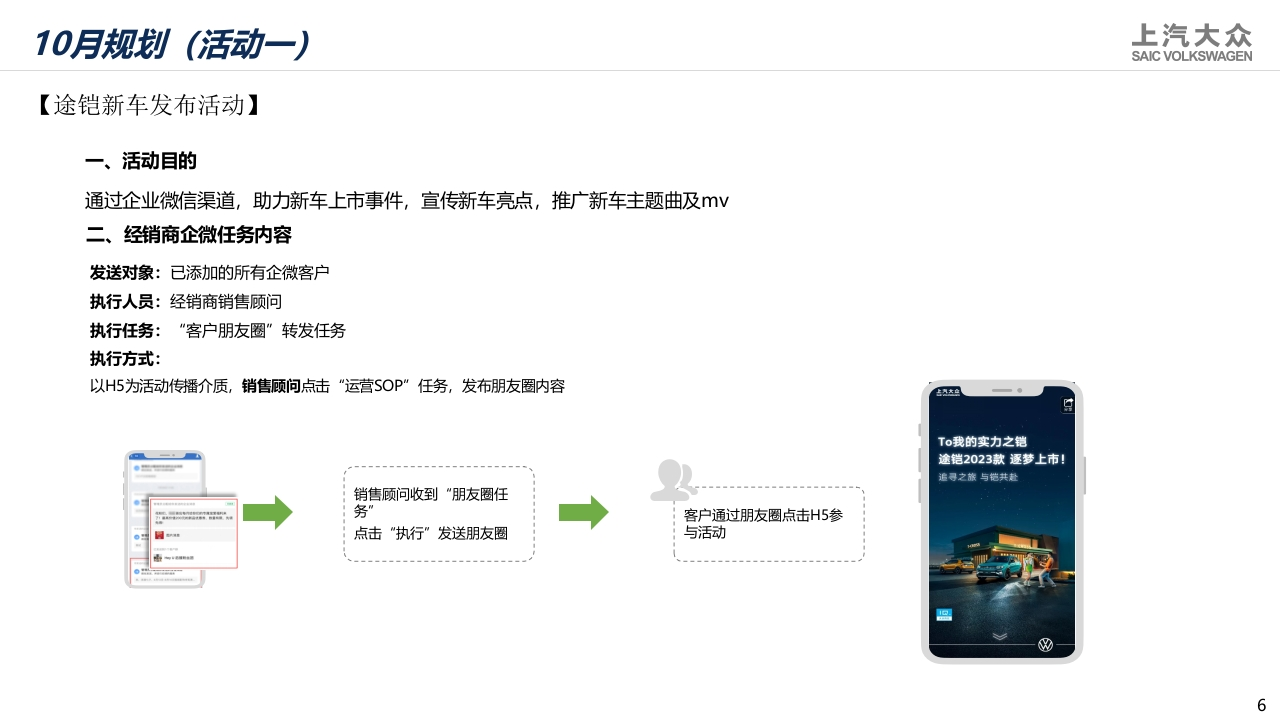 上汽大众SAIC VOLKSWAGEN上汽大众私域运营10月活动执行策略行业案例上汽大众SAIC VOLKSWAGEN活动赋能案例:奥迪云店活动小程序模版(活动模版、操作简单,提升明显)「活动页」「创建页」「活动数据」10:58出令■.CD活动名称活动范围活动开始时间活动结束时▣活动打活动打活动参活动转化开次数开人数加人数率活动查战玩家杭州奥汽车2022/10/192022/10/22569021901808.2%芳心之醉X杭州德奥奥油-“沉醉”座驾Q4 e-tron芳心之醉-Q4e-tron杭州*奥汽车2022/11/012022/11/301660560000%2022年11月30日17:00结束道约到店辽宁*迪汽车2022/10/0E2022/10/3112304208019.0%查找玩家奥迪焕新升级置换月杭州奥汽车2022/10/132022/10/169802306026.1%2022年10月22日22:30结束A6L金秋礼进季活动北京吉通汽车2022/10/082022/10/1672014035.7%已结束奥迪焕新升级置换月奥迪Q4e-tron试驾有礼杭州奥城西汽车2022/10/252022/12/31550901011.1%2022年10月16日18:30结来●Q5L煮酒论英雄北京吉通汽车2022/10/012022/10/0552033000.0%一键预约尊享上门试驾创建编辑页」「创建发布页」.2022年10月31日00:00结QSL煮酒论英雄2022年10月05日14:12结束一已经到底了-●行业案例上汽大众SAIC VOLKSWAGEN活动赋能案例:奥迪云店活动小程序模版(不拘形式,创意简单,噱头直给)「异业合作-快乐麻花」「疫情专属-上门试驾」「车型促销生日专属」「Q5专场-深度体验」13:55出令13:56出令13:55出令13:56出令纪活动详情活动详情.活动详情⊙活动详情⊙-键预约尊享上门试驾心分奥油焕新升级置换月芳心之醉X杭州德奥奥迪奥迪Q4e-tron30万级豪华纯电SUW©2022-10-1300:00至2022-10-3100:00Q5L煮酒论英雄心分享首批试驾车已到店,扫码即刻抢先试其C乱功能操作大比拼©2022-10-0114:12至2022-10-0514:12奥速的粉丝们,体现奥迪科技的时刻来了D芳心之醉X杭州德奥奥迪一“沉奥迪焕新升级置换月心分享心分享醉"座驾Q4e-tron一键预约尊享上门试驾一杭州德奥奥迪秋野游乐因开心麻花用户到杭州德奥奥迪试驾可可获得专属礼遇天速04e.tr0n30W及华比电SUV©2022-10-1313:45至2022-10-1618:30⊙2022-11-0108:30至2022-11-3017:00西被黑0长时镜制。5%的%克电该重41分种1.专享礼:购定车型A3/C2L/Q3/A可享B898元看《芳心之醉,赢奥迪礼品礼包国童华超超套金超离销开心麻花活见主题体验式喜图《芳心之醉》在开心麻花上场运间女化梦求中心1提.11月4日-11月27日国笑上2、生日礼:10月客户进店成交,享生日礼品一份杭州德奥汽车有限公司演,1月4-6日到场前40名现众得由杭州德奥奥迪福3、进店礼:10月15日邀约进店客户,可获进店礼一份杭州市拱墅区石样路59阳号供的精美礼品一份。演出结来后将现场油取2位幸运观众庆得回迪乳品一份,票用户在月份到店《杭州德奥:石样路5号)试4,评估礼:进店评估可得评估礼一份飞联系商家。导航到店露具迪即可餐外获得试露礼一份。温馨提示:周末试驾人数较多。为节约排认时间,建议5、老友礼:奥迪05L/AL/A4L置换Q4e-tron可享B您提前一-天数电约(贵宾专线:0571-280388B年免费保养@阅读107分享100活动已结束活动已结束活动已结束活动已错束「纯文字编辑」长图上传」「纯文字编辑」「长图+文字]310月策略规划上汽大众SAIC VOLKSWAGEN经销商推广即将进入入店辅导阶段,亟需立体化赋能支撑,关键因素三大支柱创意X、运营Y、技术ZXZ投放决策反哺创意-无穷因子技术-立体联动及时转化与反惯转化优化01.流量创意广告金品阵地增效及时转化与反惯云店素材供给经销商云店关系经营与复购与原生化小程序05.营销科学内容资产沉淀增效02.活动创意活动动粉丝沉淀及时转化与反惯交易优化03.阵地运营04.闭环生态创意管理反哺运营关联组合10月规划上汽大众SAIC VOLKSWAGEN活动赋能:布局云店活动小程序模版「聚合影响力活动,与品牌共筑便捷化营销生态格局」上汽大众活动共筑体系X-P大事件Y平台联动Z-功能布局新车发布,联动明星,深度内容定制联动电商,流量反哺,双十一促销推广云店升级、活动模版话,赋能更多场景超级流量聚合多维高品质内容多种活动形式模版【新车发布、明星代言】【1+N活动策划】【专属后台3步配置完成】进行中一布局中建议启动510月规划(活动一》上汽大众SAIC VOLKSWAGEN【途铠新车发布活动】一、活动目的通过企业微信渠道,助力新车上市事件,宣传新车亮点,推广新车主题曲及v二、经销商企微任务内容发送对象:已添加的所有企微客户执行人员:经销商销售顾问执行任务:“客户朋友圈”转发任务执行方式:以H5为活动传播介质,销售顾问点击“运营SOP”任务,发布朋友圈内容To我的实力之铠途铠2023款逐梦上市!追得之旅与铠共起销售顾问收到“朋友圈任客户通过朋友圈点击H5参点击“执行”发送朋友圈与活动6