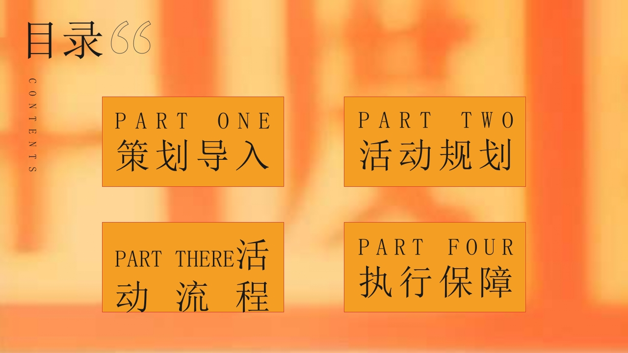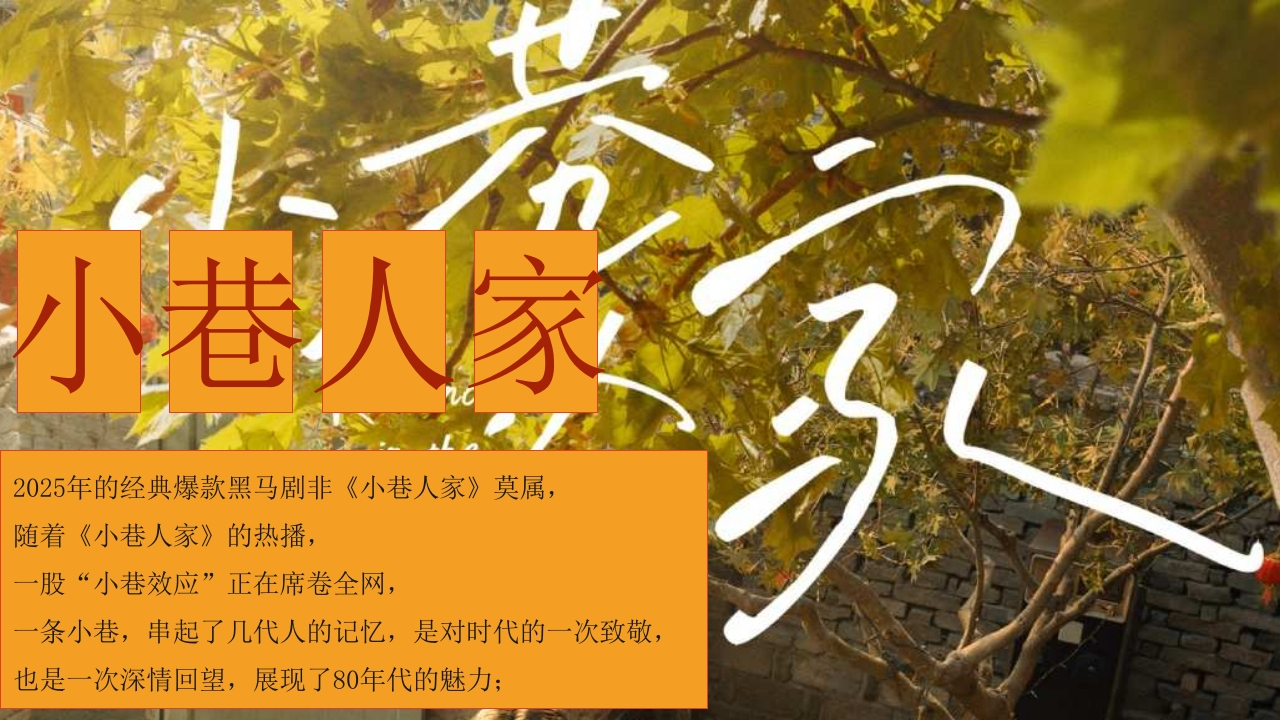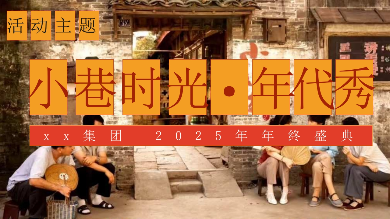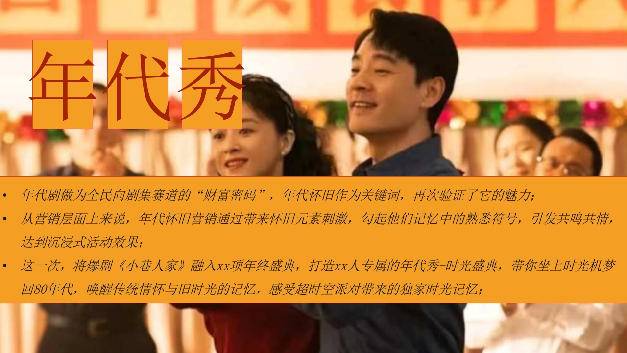 小巷时光·年代秀xx集团2025年年终盛典奖奖奖日录68PARTONEPART TWO策划导入活动规划PART THERE活PART FOUR动流程执行保障策哉划导入PLANINTRODUCTION2025年的经典爆款黑马剧非《小巷人家》莫属,随着《小巷人家》的热播,股“小巷效应”正在席卷全网,条小巷,串起了几代人的记忆,是对时代的一次致敬,也是一次深情回望,展现了80年代的魅力:年代秀●年代剧做为全民向剧集赛道的“财富密码”,年代怀旧作为关键词,再次验证了它的魅力:从营销层面上来说,年代怀旧营销通过带来怀旧元素刺激,勾起他们记忆中的熟悉符号,引发共鸣共情,达到沉浸式活动效果:这一次,将爆剧《小巷人家》融入xx顶年终盛典,打造xx人专属的年代秀时光盛典,带你坐上时光机梦回80年代,唤醒传统情怀与旧时光的记亿,感受超时空派对带来的独家时光记亿:活动主题小卷时必·挥不秀xx集团2025年年终盛典