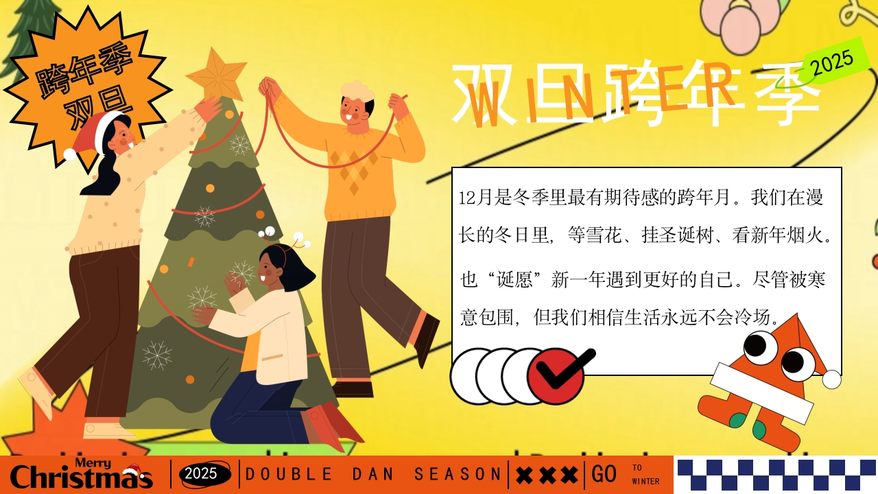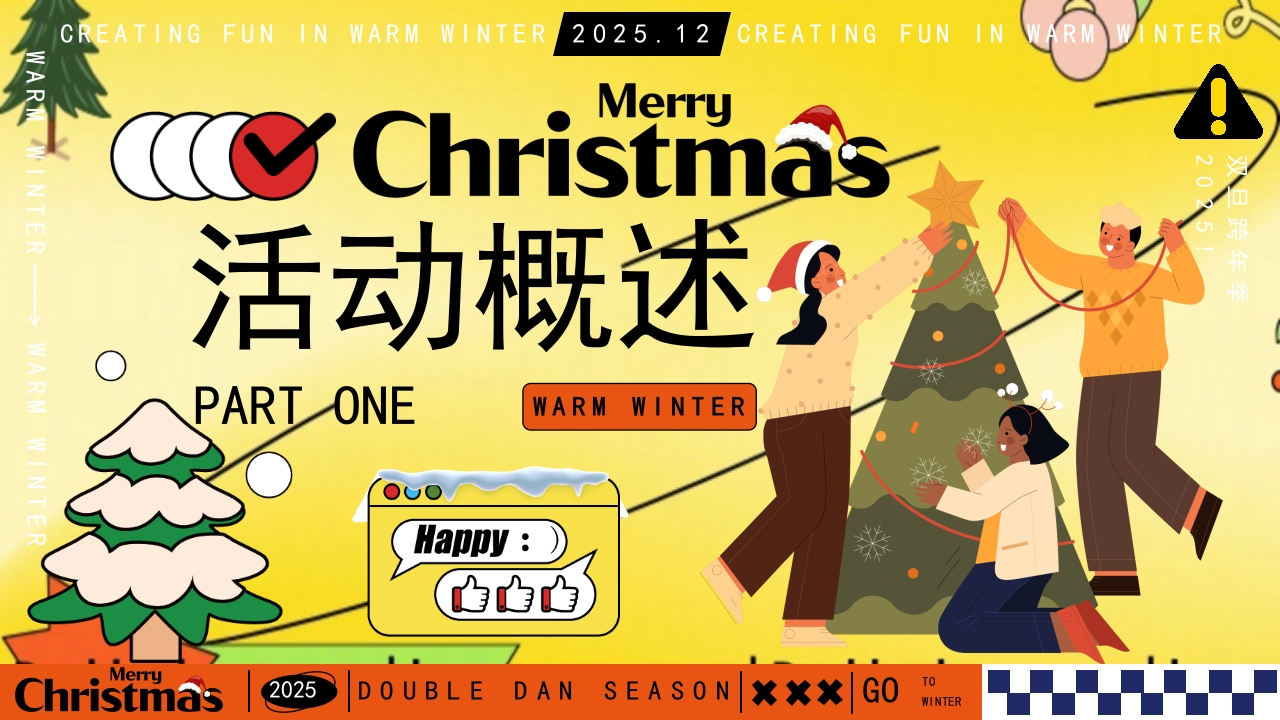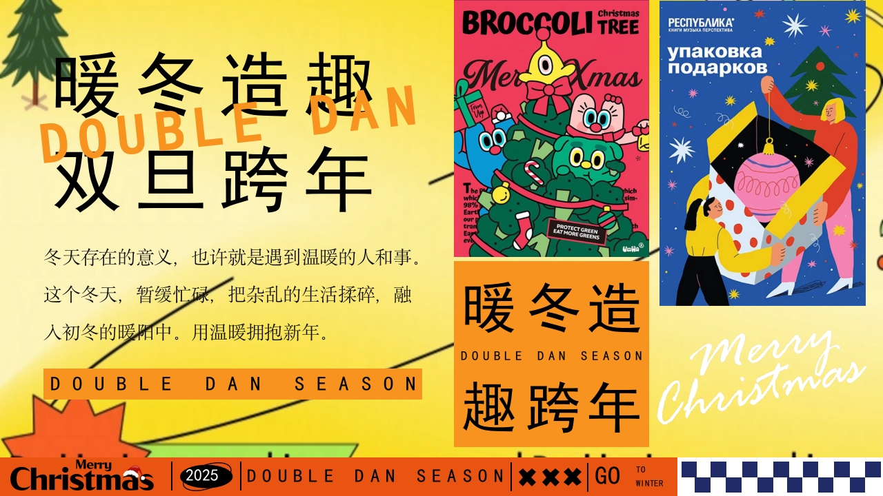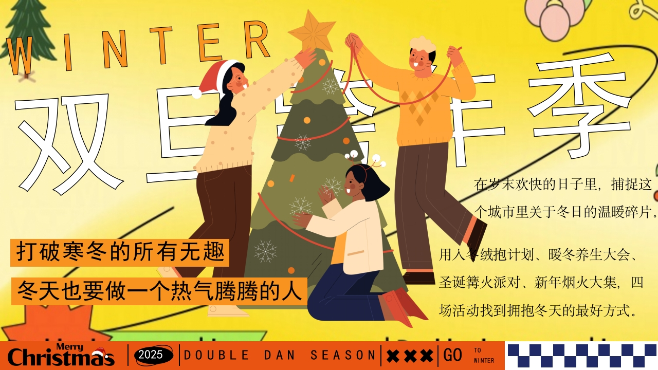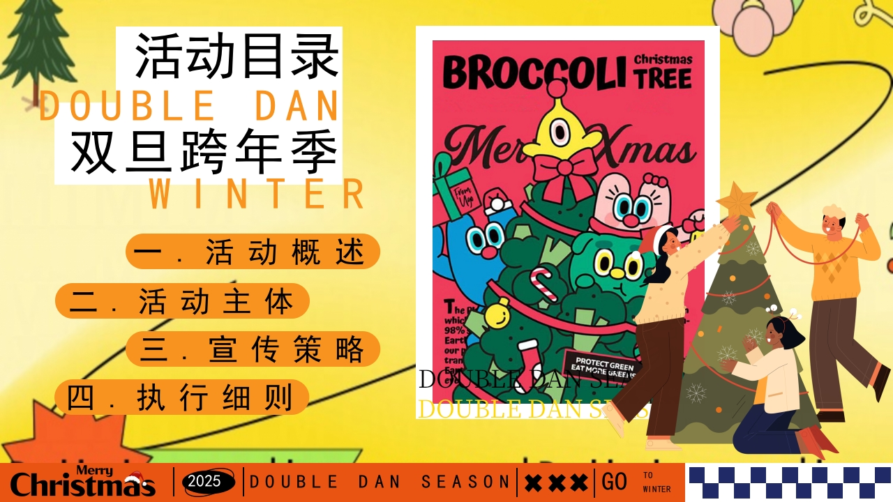 2025年Marryhrismas双旦造趣节跨年活动方案Double danseason happynew years Double dar secon happy跨年季025双具双耳跨银季12月是冬季里最有期待感的跨年月。我们在漫长的冬日里,等雪花、挂圣诞树、看新年烟火。也“诞愿”新一年遇到更好的自己。尽管被寒意包围,但我们相信生活永远不会冷场MerryChristmas2025DOUBLE DAN SEASON关术关GOTOWINTERChristmasBROCGOLI TREEPECnYBAMKA米米暖备造ynakoBkamasnonapKoB6的效旦跨年0冬天存在的意义,也许就是遇到温暖的人和事。这个冬天,暂缓忙碌,把杂乱的生活揉碎,融暖冬造入初冬的暖附中。用温暖拥抱新年。DOUBLEDAN SEASONmenySE A S趣跨年MerryChristmas2025DOUBLE DANGOTOWINTERI NTER源作季在岁禾欢快的日子里,捕捉这个城市里关于冬日的温暖碎片。打破寒冬的所有无趣用入绒抱计划、暖冬养生大会、冬天也要做一个热气腾腾的人圣诞篝火派对、新年烟火大集,四场活动找到拥抱冬天的最好方式。MerryChristmas2025DOUBLE DANSEASON××XG0TOWINTER活动目录BROCCOLIChristmasTREEDOUBLE DAN双旦跨年季WINTER一.活动概述二.活动主体三.宣传策略四.执行细则MerryChristmas2025DOUBLE DAN×G0WINTERCREATING FUN IN WARM WINTER2025.12CREATING FUNARMNTERMerry√Christmas活动既述PART ONEWARMWINTERHappy:)心山凸MerryChristmas2025DOUBLEDANSEASONG0TOWINTER