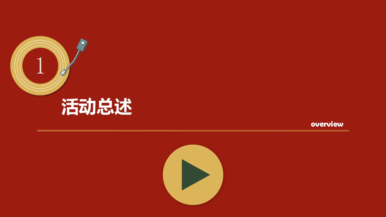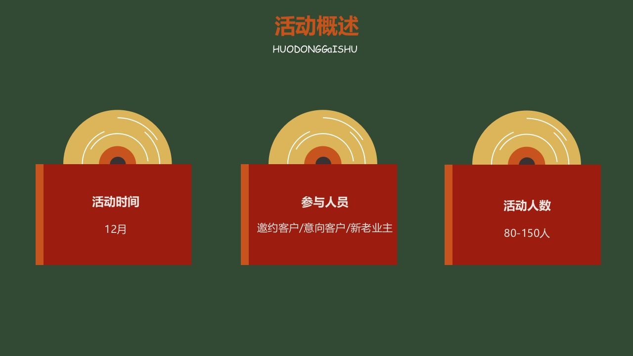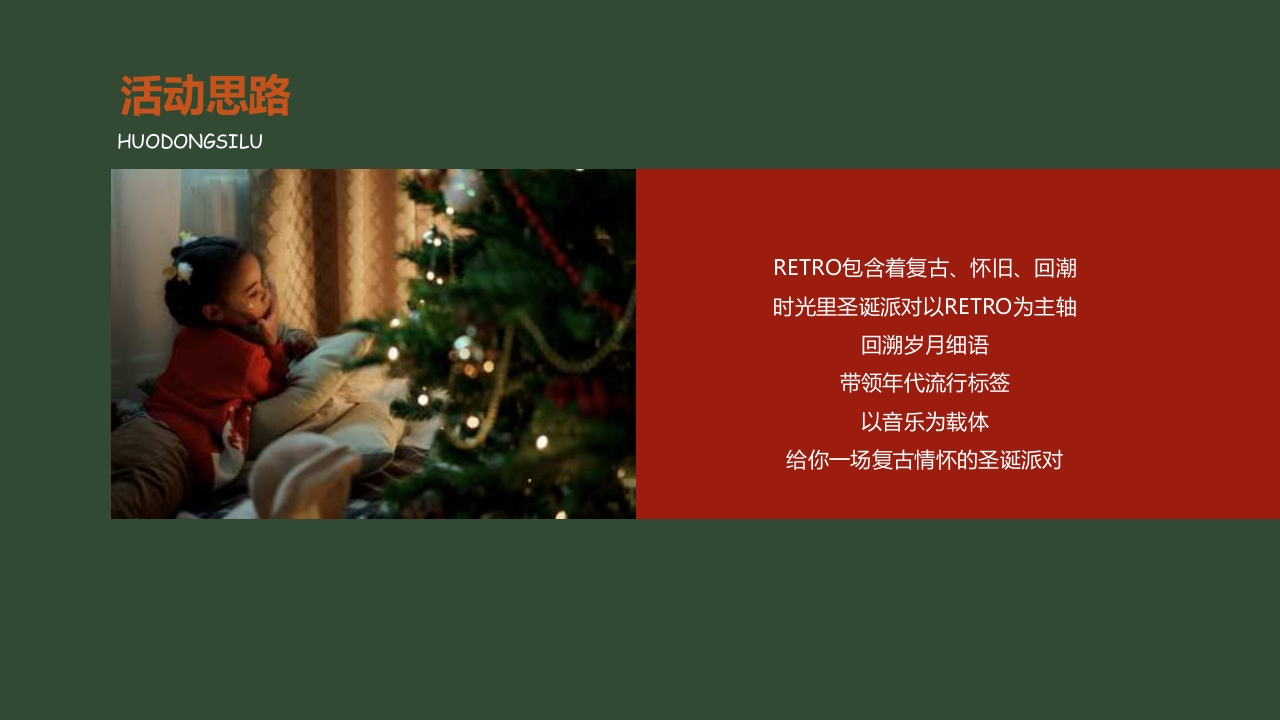 RETRONOW圣诞复古派对重回年代圣诞复古派对圣诞节想玩点特别的仪式感今年,将举行一场派对邀请你穿上复古的衣服,来嗨复刻80、90年代的时髦玩法与氛围1复古弄潮儿,我们派对上见活动总述1D2亮点模块overviewlightspot目录contents氛围布置3)4活动细节arrangementdetail1活动总述overview活动思路HUODONGSILURETRO包含着复古、怀I旧、回潮时光里圣诞派对以RETRO为主轴回溯岁月细语带领年代流行标签以音乐为载体给你一场复古情怀的圣诞派对活动概述HUODONGGaISHU活动时间参与人员活动人数12月邀约客户/意向客户/新老业主80-150人