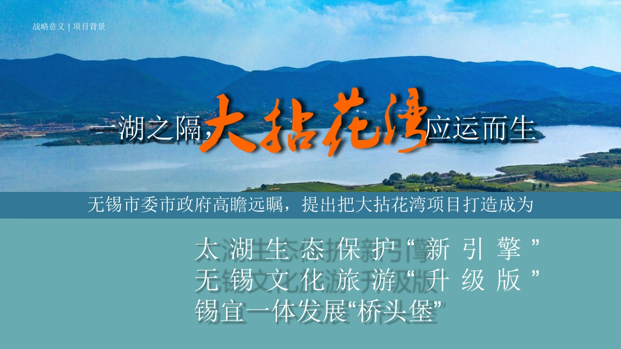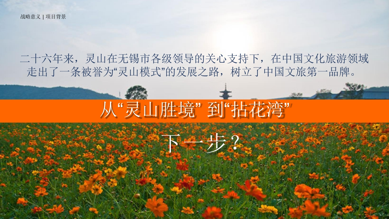 大拈花湾世界级心灵度假目的地战略策刻及概念规划DAHLIA PLOWER BAY WORLD-CLASS HEART MIND RESORT DESTINATION01.战略意义02.总体定位03.发展策略目录04.产品体系CONTENTS05空间规划06.发展愿景0177w7下战略意义战略意义」项目背景二十六年来,灵山在无锡市各级领导的关心支持下,在中国文化旅游领域走出了一条被誉为“灵山模式”的发展之路,树立了中国文旅第一品牌。从“灵山胜境”到“拈花湾”战略意义丨项目背景之大钻花法运丽无锡市委市政府高瞻远瞩,提出把大拈花湾项目打造成为太湖生态保护“新引擎”无锡文化旅游“升级版锡宜一体发展“桥头堡”项自区位S230省道梅梁路宜马公路(规划)宜马公路(规划)周铁镇项目基地4649亩距拈花湾3.5公里山胜X305县道拈花湾S230省道环山路