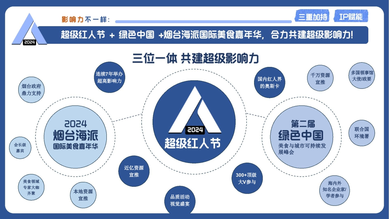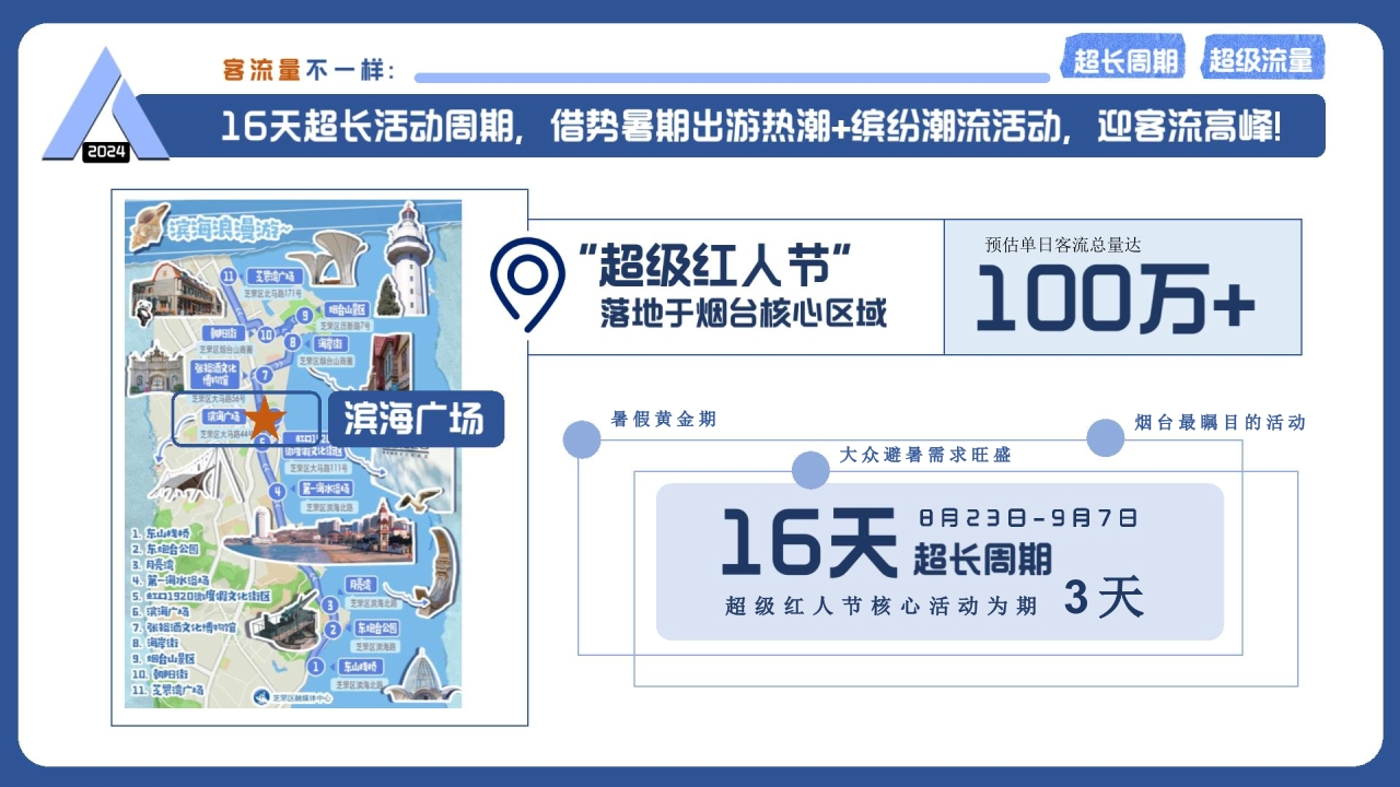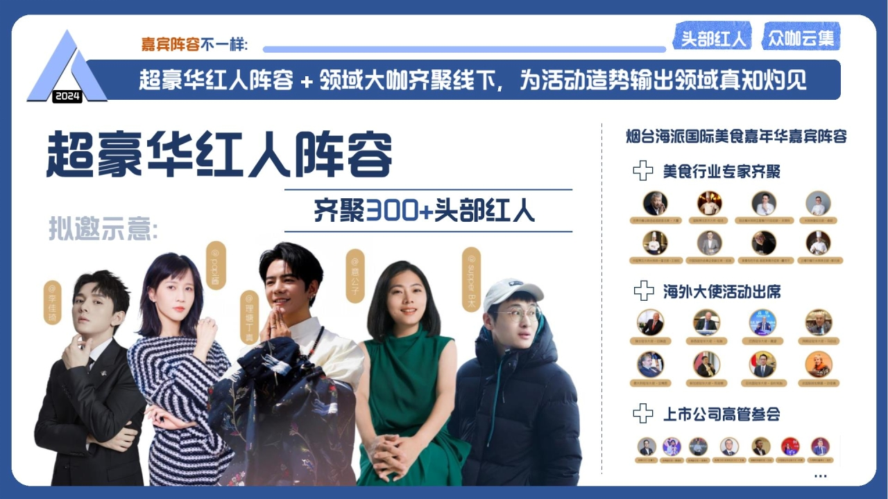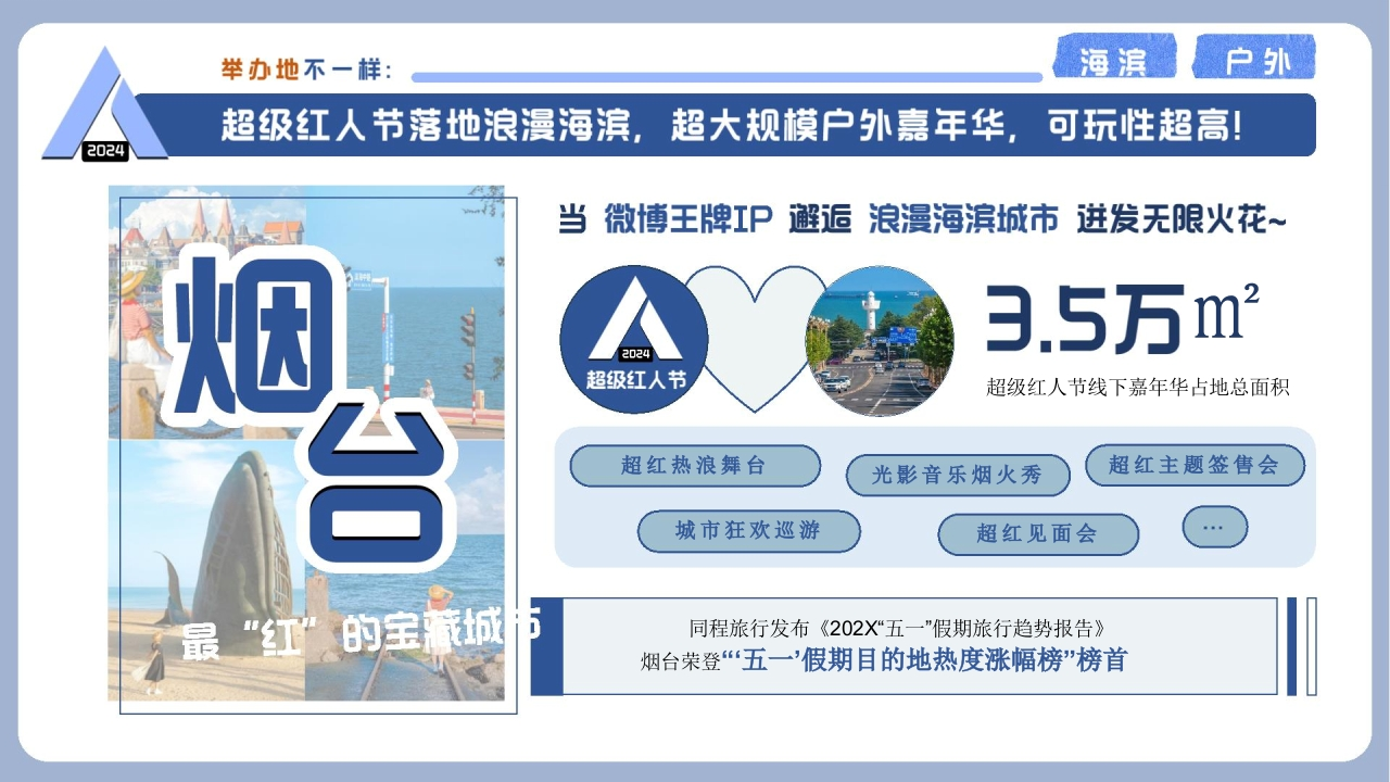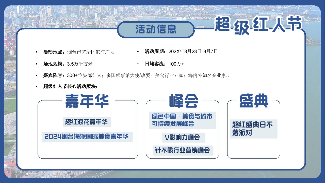 2024超级红人节举力地这届不一样客流量影响力嘉宾阵容举办力地不一样:海滨户外超级红人节落地浪漫海滨,超大规模户外嘉年华,可玩性超高!2024当微博王牌IP邂逅浪漫海滨城市进发无限火花、烟3.5万m22024超级红人节超级红人节线下嘉年华占地总面积超红热浪舞台光影音乐烟火秀超红主题签售会城市狂欢巡游超红见面会最"“红的宝藏城同程旅行发布《202X“五一”假期旅行趋势报告》烟台荣登“五一’假期目的地热度涨幅榜榜首客流量不一样:超长周期超级流量16天超长活动周期。借势暑期出游热潮+缤纷潮流活动,迎客流高峰!2024滨询浪游超级红人节”预估单日客流总量达艺取区新路7用落地于烟台核心区域100万+第海广妈滨海广场暑假黄金期烟台最瞩目的活动区大马4明南又化南电四大众避暑需求旺盛水婚马日月23日-9月7日1.东山线桥2,东始公圆3日亮演16天超长周期4.第-询水路35工▣1920项明文化街店6,广超级红人节核心活动为期3天7,张搭文化博2日,海岸街9,烟台山国车山10阳11三湾广场影响力不一样:三重加持IP赋能超级红人节+绿色中国+烟台海派国际美食嘉年华,合力共建超级影响力!2024三位一体共建超级影响力连续7年举办千万资源多国领事馆超高影响力国内红人界宜推大使政要烟台政府的奥斯卡鼎力支持2024第二届2024联合国烟台海派绿色中国环境署会长级国际美食嘉年华超级红人节美食与城市可持续发嘉宾展峰会近亿资源宜推300+顶级美食领域大V参与海内外专家大咖知名企业家划齐聚本地资源宜推品质活动学者参与视觉盛宴嘉宾阵容不一样:头部红人众咖云集超豪华红人阵容+领域大咖序聚线下,为活动造势输出领域真知灼见2024超豪华红人阵容烟台海派国际美食嘉年华嘉宾阵容十美食行业专家齐聚齐聚300+头部红人拟邀示意:@意公子@佳琦中海外大使活动出席十上市公司高管叁会活动信息超级.红人节活动地点:烟台市芝罘区滨海广场活动周期:202X年8月23日-9月7日场地规模:3.5万平方米·日均客流:100万+嘉宾阵容:300+位头部红人:多国领事馆大使/政要:美食行业专家;海内外知名企业家.…超级红人节核心活动版块:嘉年华峰会盛典绿色中国·美食与城市超红浪花嘉年华可持续发展峰会超红盛典日不2024烟台海派国际美食嘉年华落派对V影0响力峰会计不戳行业营销峰会