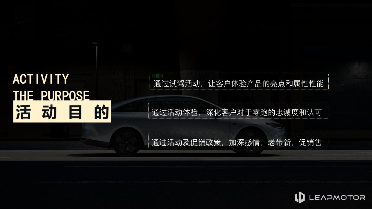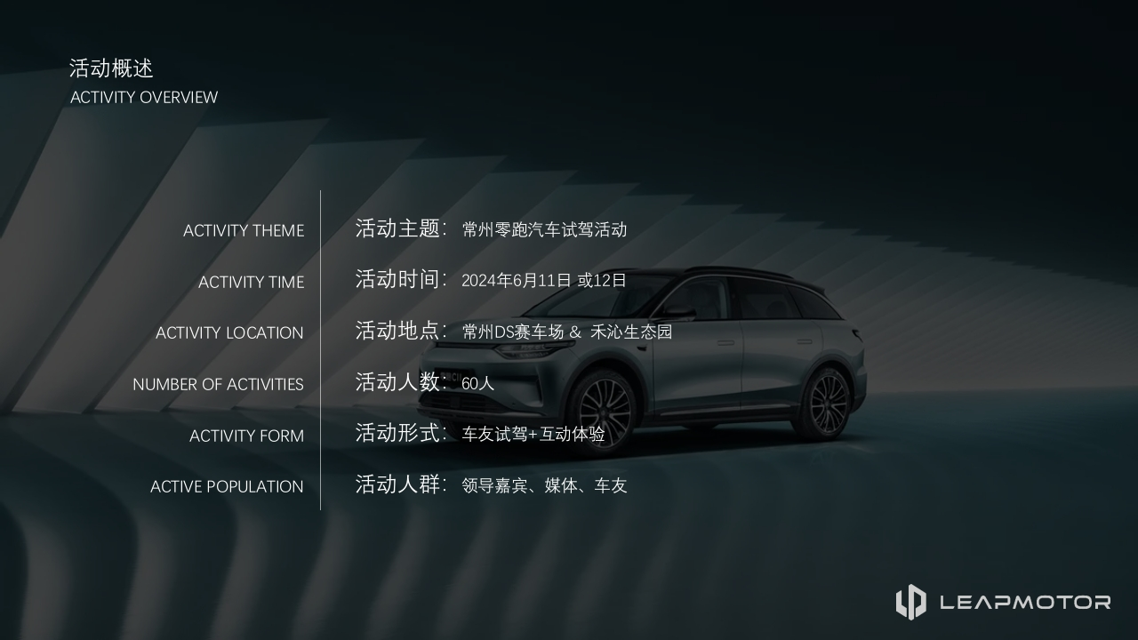 pLEAPMOTOR路这直年HAPPYMID-AUTUMNFESTIVAL马刻阎慈零跑新能源汽车试驾BRAND PUBLIC RELATIONS ACTIVITIES品牌公关活动中国常州LEAPMOTORLE∧PMOTOR出行,将由我们重新定义OPENING NOW零跑C1川LEAPMOTORCOILEAPMOTOR领跑,驾驭未来出行新方式OPENING NOWACTIVITY通过试驾活动,让客户体验产品的亮点和属性性能THE PURPOSE活动目的通过活动体验,深化客户对于零跑的忠诚度和认可通过活动及促销政策,加深感情,老带新,促销售LE∧PMOTORCONTENTS活动目录活动概述现场布置活动流程活动细节ACTIVITY OVERVIEWACTIVITY CONTENTACTIVITY FLOWACTIVITY DETAILS活动概述ACTIVITY OVERVIEWACTIVITY THEME活动主题:常州零跑汽车试驾活动ACTIVITY TIME活动时间:2024年6月11日或12日ACTIVITY LOCATION活动地点:常州D$赛车场&禾沁生态园NUMBER OF ACTIVITIES活动人数:60人ACTIVITY FORM活动形式:车友试驾+互动体验ACTIVE POPULATION活动人群:领导嘉宾、媒体、车友pLEAPMOTOR