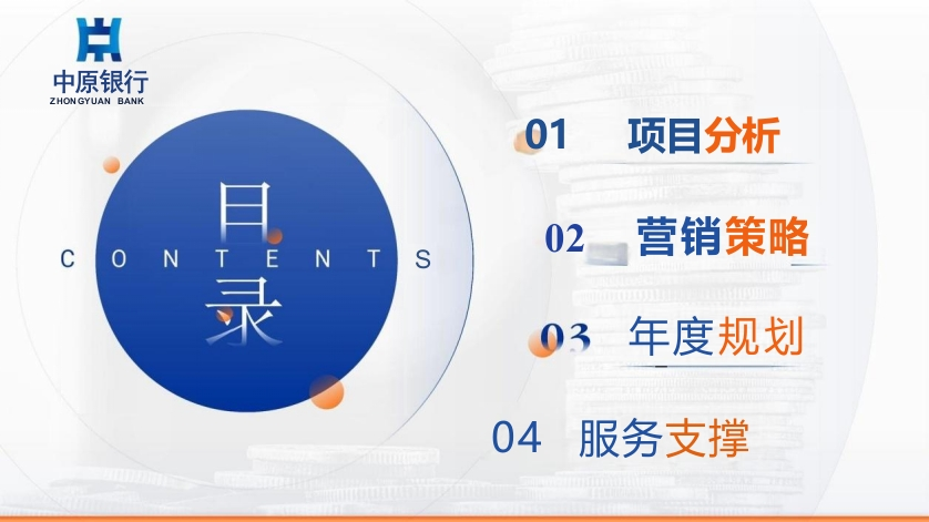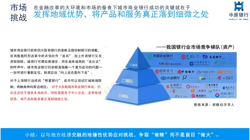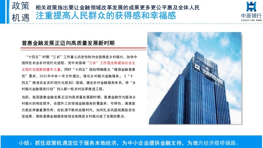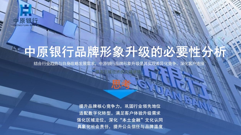 H中原银行ZHONGYUAN BANKONGYU中原银行品牌形象升级中原银行年度品牌服务及形象升级服务中原银行ZHONGYUAN BANK01项目分析02营销策略N最NTS03年度规划04服务支撑中原银行ZHONGYUAN-BA中原银行品牌形象升级的必要性分标结合行业趋势与自身战略发展需求,中原银行品牌形象升级是其实现差异化竞争、深化客户连接“服冬区域经济的关速举思考端提升品牌核心竞争力,巩固行业领先地位适配数字化转型,满足客户体验升级需求强化区域定位,深化“本土金融”文化认同具象化社会责任,提升公众信任与品牌温度H中原银行ZHONGYUAN BANK07项目分析内容力/如何传递中原银行品牌力量E政策相关政策指出要让金融领域改革发展的成果更多更公平惠及全体人民H机遇注重提高人民群众的获得感和幸福感中原银行Z-ONGYUAN BANK普惠金融发展正迈向高质量发展新时期“十四五”时期“三农”工作重心历史性转向全面推进乡村振兴,加快中国特色农业农村现代化进程。党中央强调“三衣”工作是全面建设社会主义现代化国家的重中之重。同时“十四五”规划明确提出“增强金融普惠性”要求,2022年中央一号文件提出,强化乡村振兴金融服务;《“十四五”推进农业农村现代化规划》强调,健全农村金融服务体系,将“乡村振兴金融服务行动”列入新一轮农村改革推进工程。当前,我国普惠金融发展正迈向高质量发展新时期。普惠金融作为服务乡村振兴的有效抓手,在提升三农领域金融服务的覆盖率,可得性、满意度方面发挥着重要作用。在机遇不断的发展时代,如何扎实巩固拓展脱贫攻坚成果、借助普惠金融服务接续全面推进乡村振兴成了发展的要点。小结:抓住政策机遇定位于服务本地经济,为中小企业提供金融支持,为地方经济搭桥铺路。市场在金融改革的大环境和市场的蚕食下城市商业银行成功的关键就在于H挑战发挥地域优势,将产品和服务真正落到细微之处中原银行DICNGYU AN BANK我国银行业市场竞争梯队(资产)城市商业银行前有四大国有银行的垄断及股份制银行的堵载,后有轰轰烈烈改革中的农信社作“追兵”,加上外资银行又在中国农业银行⑤中同认行白妻通银行虎视眈眈,城商行可谓处境堪忧。而在越来越高的“走出去”CEC中围工海量指的呼声中,城市商业银行目前都面临着一个最为迫切的问题一一如何进行重新定位,到底应该“向上走还是向下走”。④招商银行中信银行○中国医生级?。对于上海银行这样的“明星银行”,或许可以尝试打破地域限二梯队⊙兴业银行制,将触角伸向周边地区;对于大多数城市商业银行来说,仍之成都银行☐n阳复行。衣州维得■格义8行应该定位于服务本地经济,特别是服务于中小企业,发挥地域○州银行心苏限行三梯队Q青岛银行桂林银行优势,将产品和服务真正落到细微之处。数据来源:前珀经济学人小结:以与地方经济交融的地缘性优势应对挑战,争取“做精”而不是盲目“做大”。