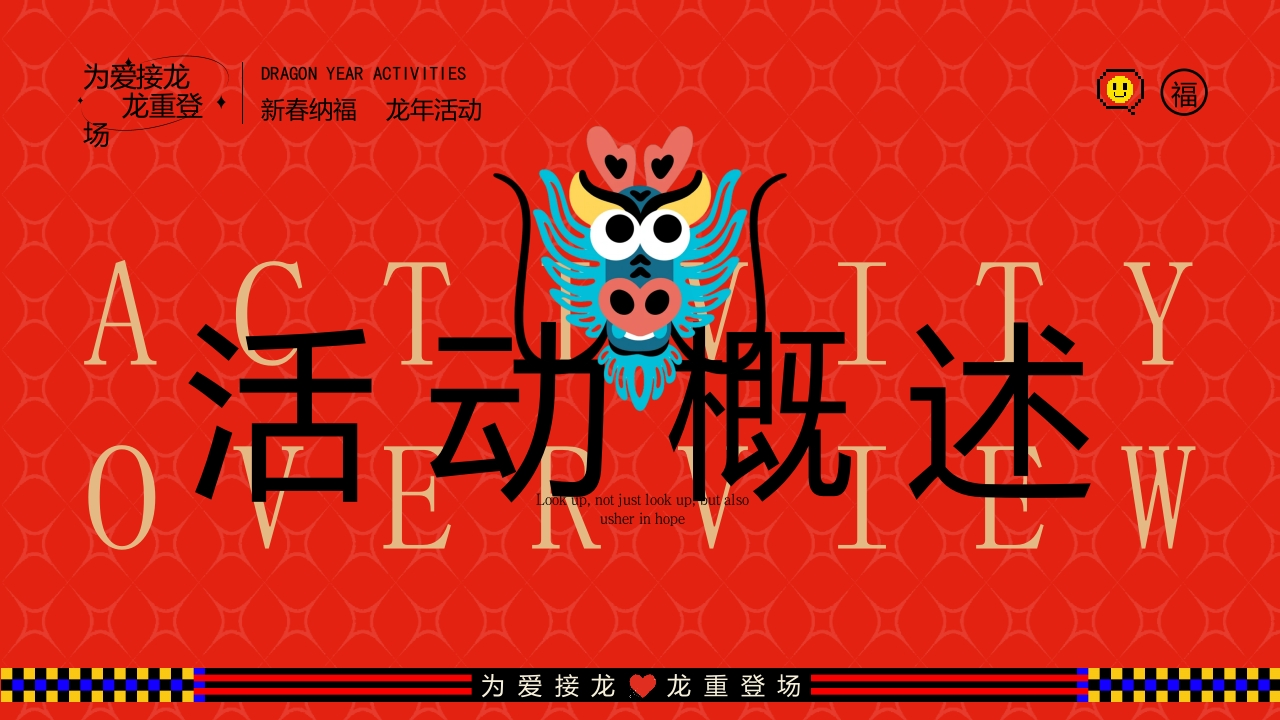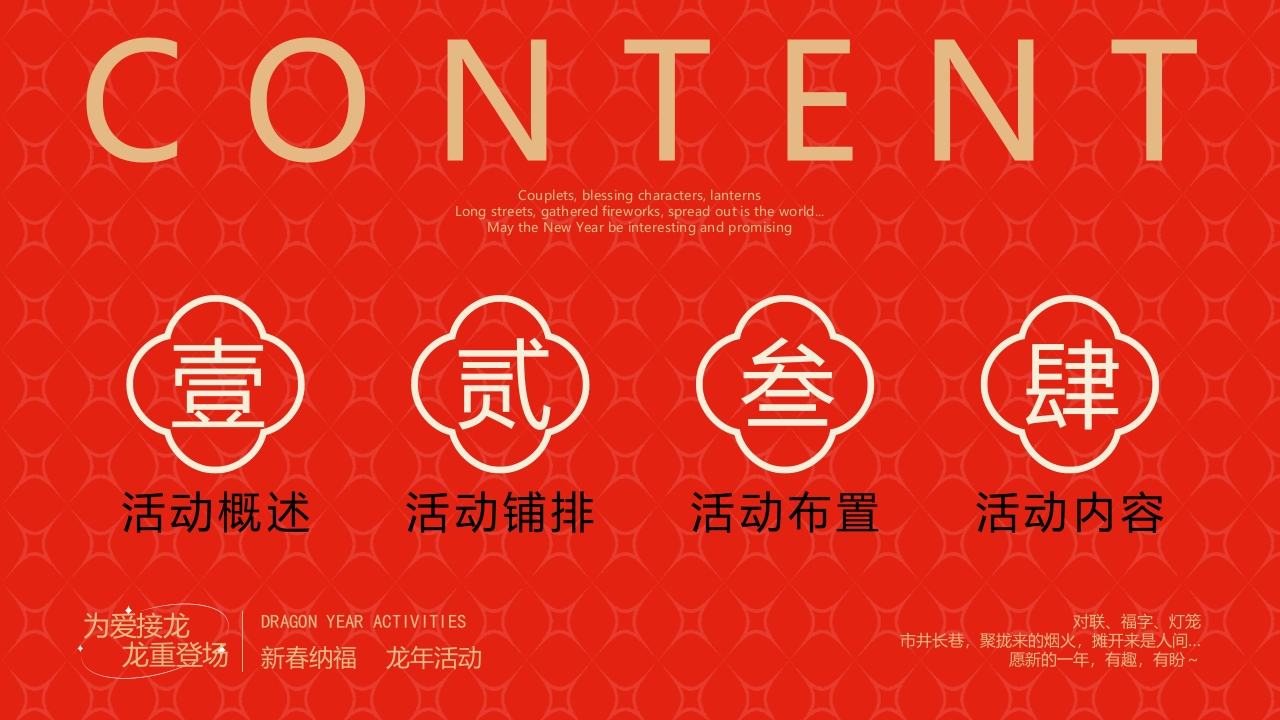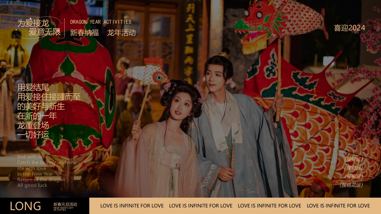 THE YEAR OF LONG(龙年喜乐)超置接N'T CATCH THE PIE IN THE SKY.BUT CAN CATCH GOOD LUCINIVERSE'S STRONGEST GOLD-SUCKING LAW.TEACH ONE OR TWOSANDS OF PEOPLE CAN MEET THE ORIGINAL APPEARANCE OF LOVEEASY TO SEIZE THE DOPAMINE THAT IS ALSO EASY TO LOSE YOUTI龙<接好运>●<接财气><接魅力><接活力>年年末是一个很神奇的时间点,似乎遗憾会就此打住大家向前一步跨入新年就能拥抱新的美好与希望wAIYIWUXIAN为爱声?但-接龙爱意无限新春纳福龙年活动爱是年深月久的纯粹珍贵#新春纳福#也是新岁序开的美好期望Love is pure and precious over timeIt is also a beautiful expectation for the opening of the new year福#长安长乐#龙NEW'EAR WISHES泊归烟火向星辰,所所成为爱接龙DRAGON YEAR ACTIVITIES爱意无限新春纳福龙年活动喜迎2024用爱结尾用爱接住接踵而至的美好与新生在新的一年龙重登场切好运End with loCatch the beauty and newlife with loveIn the New YearReturn of the dragonAll good luck(接桃花运LONG新春元旦活动及DAYLOVE IS INFINITE FOR LOVE LOVE IS INFINITE FOR LOVE LOVE IS INFINITE FOR LOVE LOVE IS INFINITE FOR LOVECONTENTCouplets,blessing characters,lanternsLong streets,gathered fireworks,spread out is the world..May the New Year be interesting and promising壹员肆活动概述活动铺排活动布置活动内容为爱接龙DRAGON YEAR ACTIVITIES对联、福字、灯笼龙重登场市井长巷,聚拢来的烟火,摊开来是人间新春纳福龙年活动愿新的一年,有趣,有盼~为爱接龙DRAGON YEAR ACTIVITIES龙重登新春纳福龙年活动福场0not just look upusher in hope为爱接龙◆龙重登场