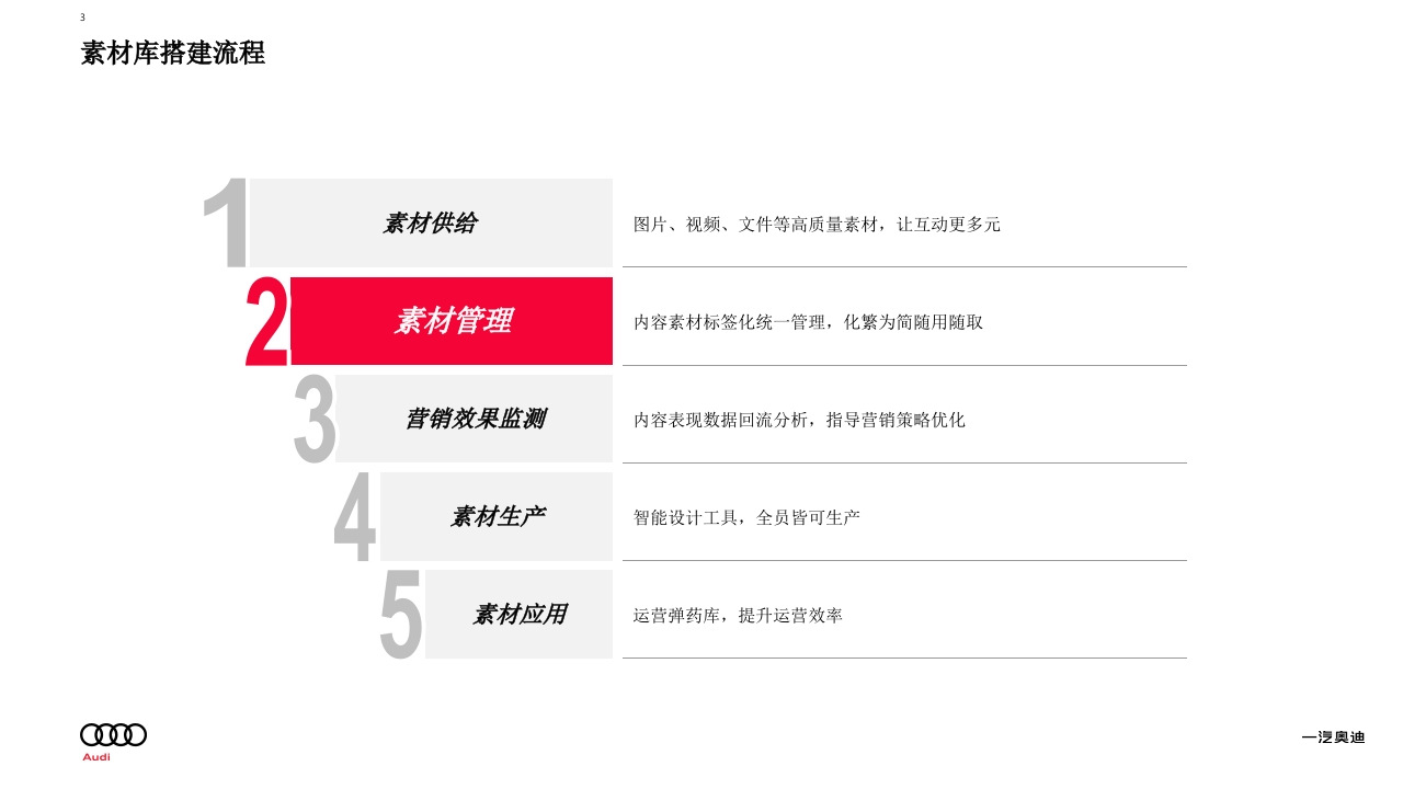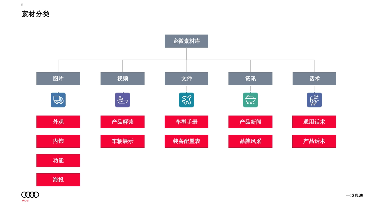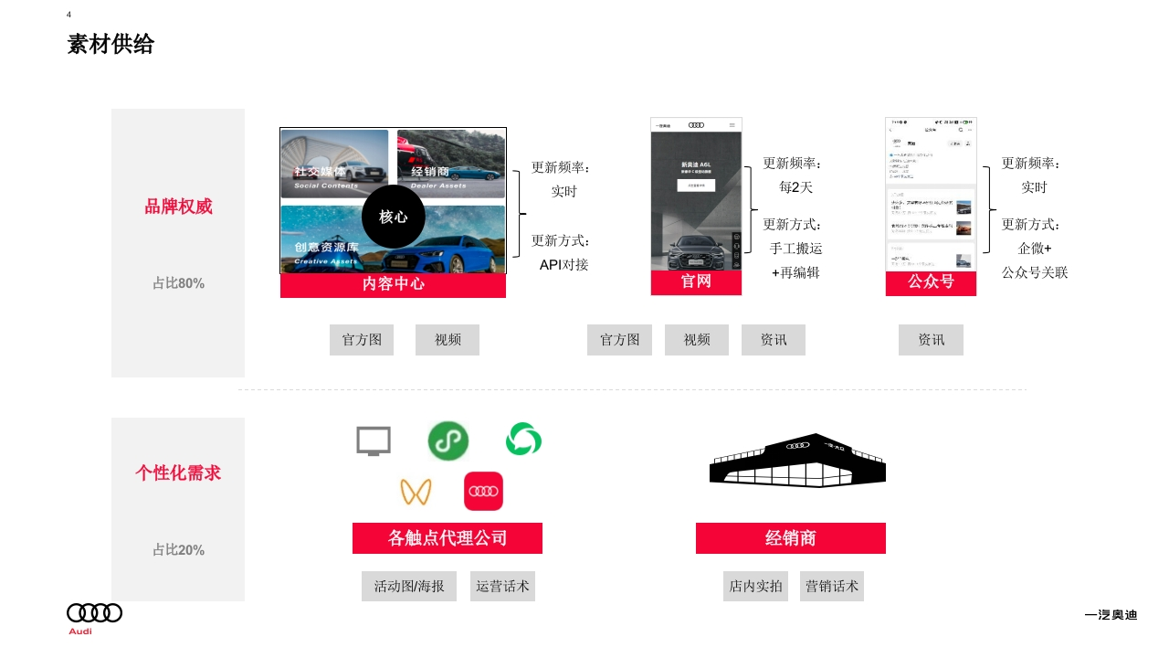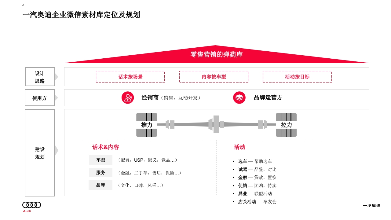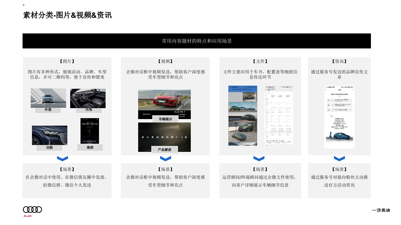 C①一汽奥迪Audi一汽奥迪企业微信内容素材库设计方案奥迪内容中心一汽奥迪企业微信素材库定位及规划零售营销的弹药库设计话术按场景内容按车型活动按目标思路使用方经销商(销售,互动开发)品牌运营方推力拉力建设话术&内容活动规划车型(配置,USP,疑义,竞品)选车一帮助选车服务·试驾一品鉴,对比(金融,二手车,售后,保险.)·金融一贷款,置换品牌(文化,口碑,风采.)·促销一团购,特卖·异业一联盟活动0·店头活动一车友会一浸奥迪Audi素材库搭建流程素材供给图片、视频、文件等高质量素材,让互动更多元2素材管理内容素材标签化统一管理,化繁为简随用随取3营销效果监测内容表现数据回流分析,指导营销策略优化素材生产智能设计工具,全员皆可生产5素材应用运营弹药库,提升运营效率CIID一浸奥迪Audi素材供给C1D社交媒体。重经销商。更新频率:新A更新频率:更新频率:实时每2天实时品牌权威核心更新方式::m西更新方式:创意资源库更新方式:手工搬运企微+Creative AgsersAPI对接占比80%内容中心官网+再编辑公众号公众号关联官方图视频官方图视频资讯资讯个性化需求0W各触点代理公司占比20%经销商活动图/海报运营话术店内实拍营销话术CIID一浸奥迪Audi素材分类企微素材库图片视频文件资讯话术外观产品解读车型手册产品新闻通用话术内饰车辆展示装备配置表品牌风采产品话术功能海报C①一浸奥迪Audi素材分类-图片&视频&资讯常用内容题材的特点和应用场景【图片】【视频】【文件】【资讯】图片有多种形式,展现活动、品牌、车型企微对话框中视频发送,帮助客户深度感文件主要应用于车书、配置表等细致信通过服务号发送的品牌宣传文信息,并可二维码等,便于宣传和裂变受车型细节和亮点息传达环节章mM写46Dt#473、外观内饰车辆展示三功能海报产品解读【场景】【场景】【场景】【场景】在企微对话中使用、在微信明友圈中发放、企微对话框中视频发送,帮助客户深度感运营顾问/终端顾问通过企微文件使用,通过服务号对接向粉丝主动推给微信群、微信个人发送受车型细节和亮,点向客户详细展示车辆细节信息送官方活动资讯0一浸奥迪Audi