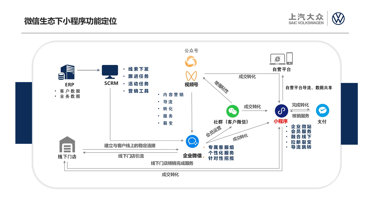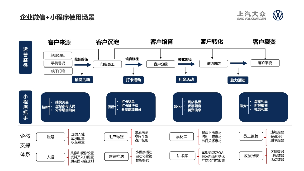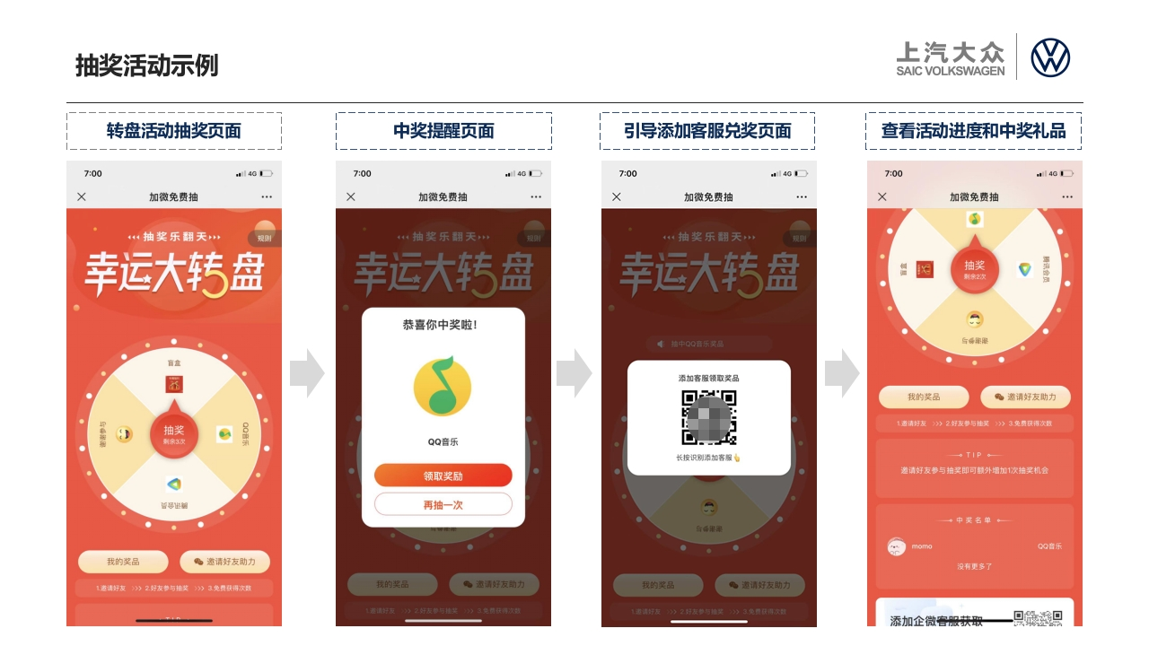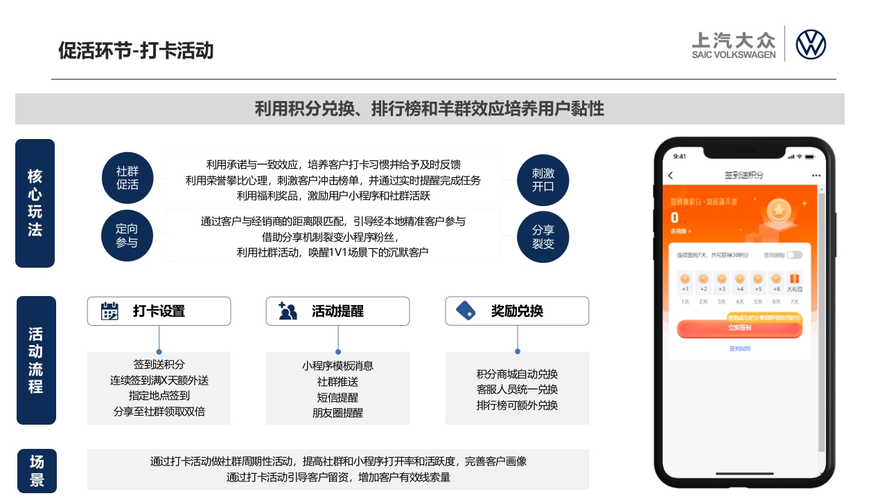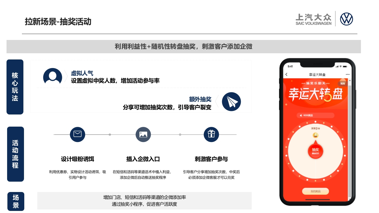2024年上汽大众经销商小程序增长工具方案上汽大众SAIC VOLKSWAGEN微信生态下小程序功能定位上汽大众SAIC VOLKSWAGEN公众号e线索下发自营平台跟进任务成交转化ERPSCRM·活动任务视频号·客户数据营销工具增强粘性自营平台导流、数据共享·业务数据·内容营销·导流·转化成交转化完成转化c·服务核销服务·裂变群(客户微信)小程序支付会员运营企业微站会员服务成交转化融合线下拉新裂变建立与客户线上的稳定连接专属客服组导流跳转线下门店引流企业微信。个性化服务线下门店针对性招揽线下门店核销完成服务成交转化企业微信+小程序使用场景上汽大众SAIC VOLKSWAGEN客户来源客户沉淀客户培育客户转化客户裂变运营路径总部分配拉新路径培育路径转化路径手机号码门店员工客户分级邀约进店客户裂变线下门店抽奖活动打卡活动礼金活动助力活动小程序抓手抽奖奖品打卡奖品到店礼品裂变礼品拉新虚拟参与人员促活打卡排行榜转化优惠额度裂变阶梯福利分享增加抽奖分享增加积分留资信息社交利益渠道来源新车上市素材违规提醒企微企微入驻账号应用配置用户标签意向车型素材库和不刺员工监管会话分析权益设置客户级别删除提醒支撑体系头像和昵称设置小程序活动车型知识及QA区域数据人设资料页入口配置营销推送自动化营销话术库破冰和邀约话术数据报表门店数据朋友圈内容规划智能群发商和门店政策活动数据拉新场景-抽奖活动上汽大众SAIC VOLKSWAGEN利用利益性+随机性转盘抽奖,刺激客户添加企微虚拟人气幸运大转雪核心玩法设置虚拟中奖人数,增加活动参与率44轴笑乐翻天:额外抽奖幸运大转盘分享可增加抽奖次数,引导客户裂变活动流程设计吸粉诱饵插入企微入口刺激客户参与利用优惠券、实物设计活动诱饵,吸在短信和活码等渠道话术中植入利益引导客户分享增加抽奖次数,中奖后引用户参与添加企微后自动推送抽奖程序必须添加企微客服才可以兑奖的奖品增勖加门店、短信和活码等渠道的企微添加率景通过抽奖小程序,促进客户活跃度抽奖活动示例上汽大众SAIC VOLKSWAGEN转盘活动抽奖页面中奖提醒页面引导添加客服兑奖页面查看活动进度和中奖礼品7:007:007:007:00加微免费抽加微免费抽加徽免费抽加微免费抽444抽奖乐翻天44抽奖乐用天4抽奖乐翻天幸运大转盘幸运大转盘幸运大转盘抽奖条2次e恭喜你中奖啦!9◆抽中00音乐买岛添加客服领取笑品回回我的奖品邀请好友助力E■1透请好友>》2好友参与抽奖>》3免册获得次数抽奖QQ音乐长按识别添加客服小领取奖励差请好友参与拾奖即可额外增加次抢奖机金再抽一次中奖名单◆C9音乐我的奖品%邀请好友助力没有更多了速请好友)》2好友物与奖)》3免得次数我的奖品角邀请好友助力我的奖品角递请好友助力请好友2好友静与奖》3免得次添加企微容服获职只最只促活环节-打卡活动上汽大众SAIC VOLKSWAGEN利用积分兑换、排行榜和羊群效应培养用户黏性941社群利用承诺与一致效应,培养客户打卡习惯并给予及时反馈利用荣誉攀比心理,刺激客户冲击榜单,并通过实时提醒完成任务刺激签到送积份核心玩法促活开口利用福利奖品,激励用户小程序和社群活跃普到睡星分·要品清流后通过客户与经销商的距离限匹配,引导经本地精准客户参与0定向分享去党输参与借助分享机制裂变小程序粉丝裂变利用社群活动,唤醒1V1场景下的沉默客户连安选到7天。共可玩3碧税●ooooOO II+1+2+3+445+6大礼包1天2天34妖5天67天膨打卡设置活动提醒奖励兑换立塔到活动流●签到送积分小程序模板消息连续签到满天额外送社群推送积分商城自动兑换指定地点签到短信提醒客服人员统一兑换分享至社群领取双倍排行榜可额外兑换朋友圈提醒通过打卡活动做社群周期性活动,提高社群和小程序打开率和活跃度,完善客户画像景通过打卡活动引导客户留资,增加客户有效线索量