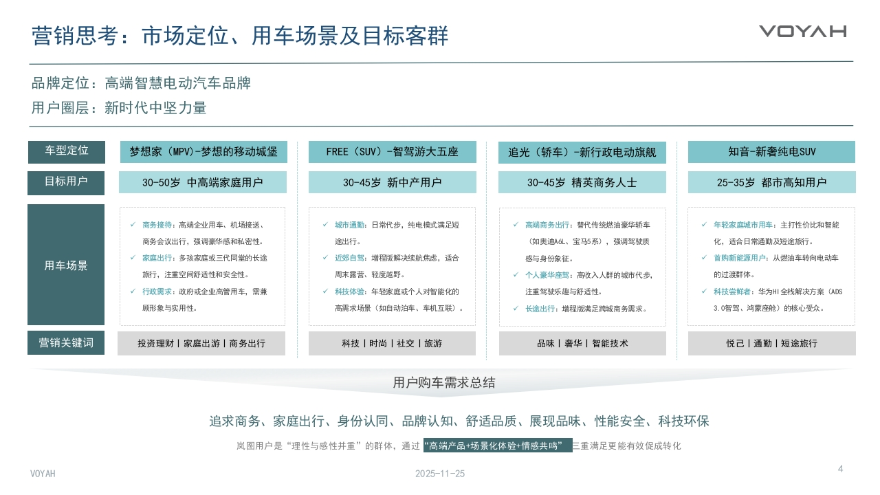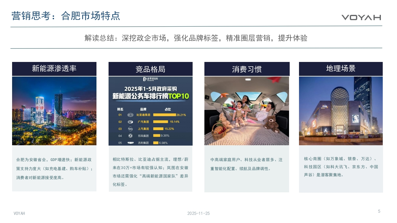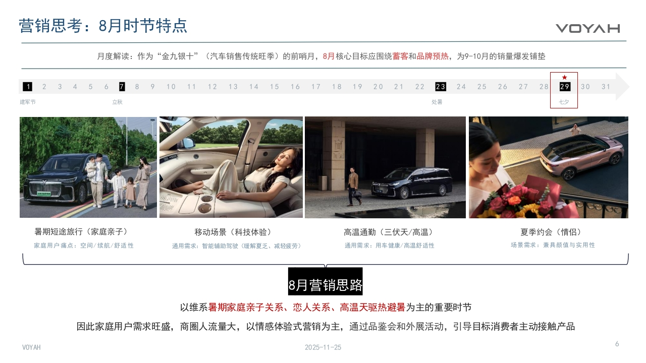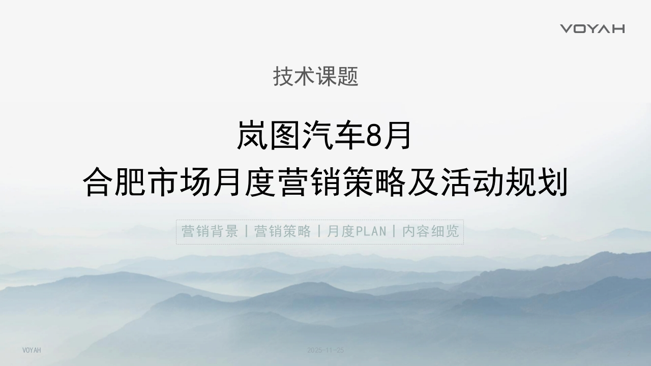 2025年岚图区域营销代理项目投标技术方案2025-11-25心有成竹行有岚图V▣YH技术课题岚图汽车8月合肥市场月度营销策略及活动规划营销背景丨营销策略丨月度PLAN丨内容细览VOYAH2025-11-25背景解读2025年8月在即将迎来“金九银十”的行业旺季市场环境下如何精准触达用户提升转化率?完成品牌声量提升、收集潜客线索、强化产品体验,促进销量转化等目标营销思考:市场定位、用车场景及目标客群V▣Y人H品牌定位:高端智慧电动汽车品牌用户圈层:新时代中坚力量车型定位梦想家(MPV)-梦想的移动城堡FREE(SUV)-智驾游大五座追光(轿车)一新行政电动旗舰知音-新奢纯电SUV目标用户30-50岁中高端家庭用户30-45岁新中产用户30-45岁精英商务人士25-35岁都市高知用户商务接待:高端企业用车、机场接送、城市通勤:日常代步,纯电模式满足短高端商务出行:替代传统燃油豪华轿车√年轻家庭城市用车:主打性价比和智能商务会议出行,强调豪华感和私密性。途出行。(如奥迪A6L、宝马5系),强调驾驶质化,适合日常通勒及短途旅行。家庭出行:多孩家庭或三代同堂的长途√近郊自驾:增程版解决续航焦虑,适合感与身份象征。√首购新能源用户:从燃油车转向电动车用车场景旅行,注重空间舒适性和安全性。周末露营、轻度越野。√个人豪华座驾:高收入人群的城市代步的过渡群体。√行政需求:政府或企业高管用车,需兼√科技体验:年轻家庭或个人对智能化的注重驾驶乐趣与舒适性。√科技尝鲜者:华为Hl全栈解决方案(ADS顾形象与实用性。高需求场景(如自动泊车、车机互联)。长途出行:增程版满足跨城商务需求。3.0智驾、鸿蒙座舱)的核心受众。营销关键词投资理财丨家庭出游丨商务出行科技|时尚|社交|旅游品味丨奢华丨智能技术悦己|通勤|短途旅行用户购车需求总结追求商务、家庭出行、身份认同、品牌认知、舒适品质、展现品味、性能安全、科技环保岚图用户是“理性与感性并重”的群体,通过“高端产品+场景化体验+情感共鸣”三重满足更能有效促成转化VOYAH2025-11-254营销思考:合肥市场特点V▣Y∧H解读总结:深挖政企市场,强化品牌标签,精准圈层营销,提升体验新能源渗透率竞品格局消费习惯地理场景D态年2025年1-5月改府采购新能源公务车排行榜TOP10排名品牌占世01©比亚迪集团■28.21%02G广汽集团■19.14%039上汽集团■15.22%04①东风集团■9.36%05=吉利团■6.98%合肥为安徽省会,GDP增速快;新能源政相比特斯拉、比亚迪占据主流,理想/蔚中高端家庭用户、科技从业者居多、注核心商圈(如万象城、银泰、万达)、策支持力度大(如充电基建、购车补贴);来在30万+市场有较强认知;岚图在安徽重智能化配置、续航及品牌调性。科技园区(如科大讯飞、京东方、中国消费者对新能源接受度高。市场还需强化“高端新能源国家队”差异声谷)是潜客聚集地。化标签VOYAH2025-11-25营销思考:8月时节特点V▣YAH月度解读:作为“金九银十”(汽车销售传统旺季)的前哨月,8月核心目标应围绕蓄客和品牌预热,为9-10月的销量爆发铺垫12345678910111213141516171819202122232425262728293031建军节立秋处暑七夕暑期短途旅行(家庭亲子)移动场景(科技体验)高温通勤(三伏天/高温)夏季约会(情侣)家庭用户痛点:空间/续航/舒适性通用需求:智能辅助驾驶(缓解夏乏、减轻疲劳)通用需求:用车健康/高温舒适性场景需求:兼具颜值与实用性8月营销思路以维系暑期家庭亲子关系、恋人关系、高温天驱热避暑为主的重要时节因此家庭用户需求旺盛,商圈人流量大,以情感体验式营销为主,通过品鉴会和外展活动,引导目标消费者主动接触产品VOYAH2025-11-256