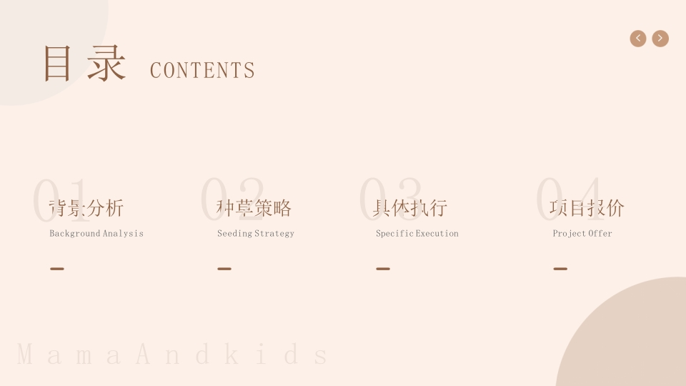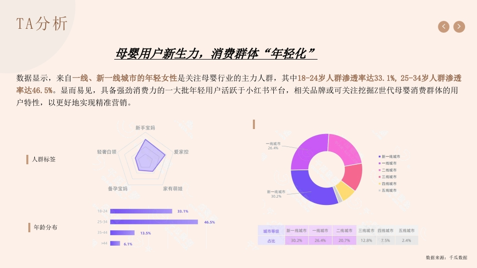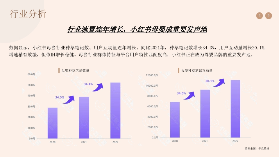 MamaAndkids小红书种草方案M a m aA n d ki3⊙目录CONTENTS背:分析种草策略具休执行项目报价Background AnalysisSeeding StrategySpecific ExecutionProject OfferM a m aA n d k i d sM a m aA n d k i d s01背景分析Background Analysis3行业分析行业流置连年增长,小红书母婴成重要发声地数据显示,小红书母婴行业种草笔记数、用户互动量连年增长。同比2021年,种草笔记数增长34.3%,用户互动量增长20.1%,增速稍有放缓,但依旧增长稳健。母婴行业群体特征与平台用户特性匹配度高,小红书正在成为母婴品牌的重要发声地。母婴种草笔记数量母婴种草笔记互动量60.0万12000.0万20.1%50.0万34.4%10000.0万34.0%40.0万34.5%8000.0万30.0万6000.0万20.0万4000.0万10.0万2000.0万0.0万0.0万202020212022202020212022数据来源:千瓜数据TA分析3⊙母婴用户新生力,消费群体“年轻化”数据显示,来自一线、新一线城市的年轻女性是关注母婴行业的主力人群,其中18-24岁人群渗透率达33.1%,25-34岁人群渗透率达46.5%。显而易见,具备强劲消费力的一大批年轻用户活跃于小红书平台,相关品牌或可关注挖掘Z世代母婴消费群体的用户特性,以更好地实现精准营销。新手宝妈26.4%轻奢白领爱家控|人群标签■斯一线城市■一线城市■二线城市。三线城市■四线城市各孕宝妈家有萌娃新一线城市■五线城市302%18-2433.1%25-3446.5%年龄分布35-4413.5%城市等级新一线城市一线城市二线城市三线城市四线城市五找城市344■6,1%占比30.2%26.4%20,7%12.8%7.5%24%数据来源:千瓜数据市场机遇g⊙三胎时代和法规整改的双重背景下母婴洗护市场将迎来新的机遇和发展颜值经济母婴经济消费力升级多元化市场消费者变化