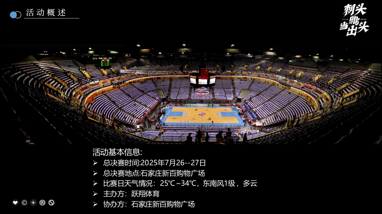 跃翔体育yUEXIANGLI-NING刺头当2025李宁·李宁反伍街球联赛《河北赛区总决赛)活动流程方案背景及概况比赛场地、推广布置赛事招募目录明星计划(粉丝见面会)开幕式流程野球联宽●应急保障PART 1赛事背景及活动概况翔头赛事背景&历史8::刺头李宁头1李行反個项提倡的日个体验覆盖城市60+(含2019年海外)城市,产品体验运动体验、购买体验共为消费者组织近百万场3+比赛过往传播营销累计超百亿达。D活动概述刺头活动基本信息:>总决赛时间:2025年7月26-27日>总决赛地点石家庄新百购物广场比赛日天气情况:25°℃~34℃,东南风1级,多云>主办方:跃翔体育©⊕®>协办方:石家庄新百购物广场PART 2场地布展多的同侧低你的谱能