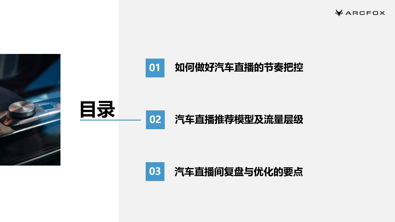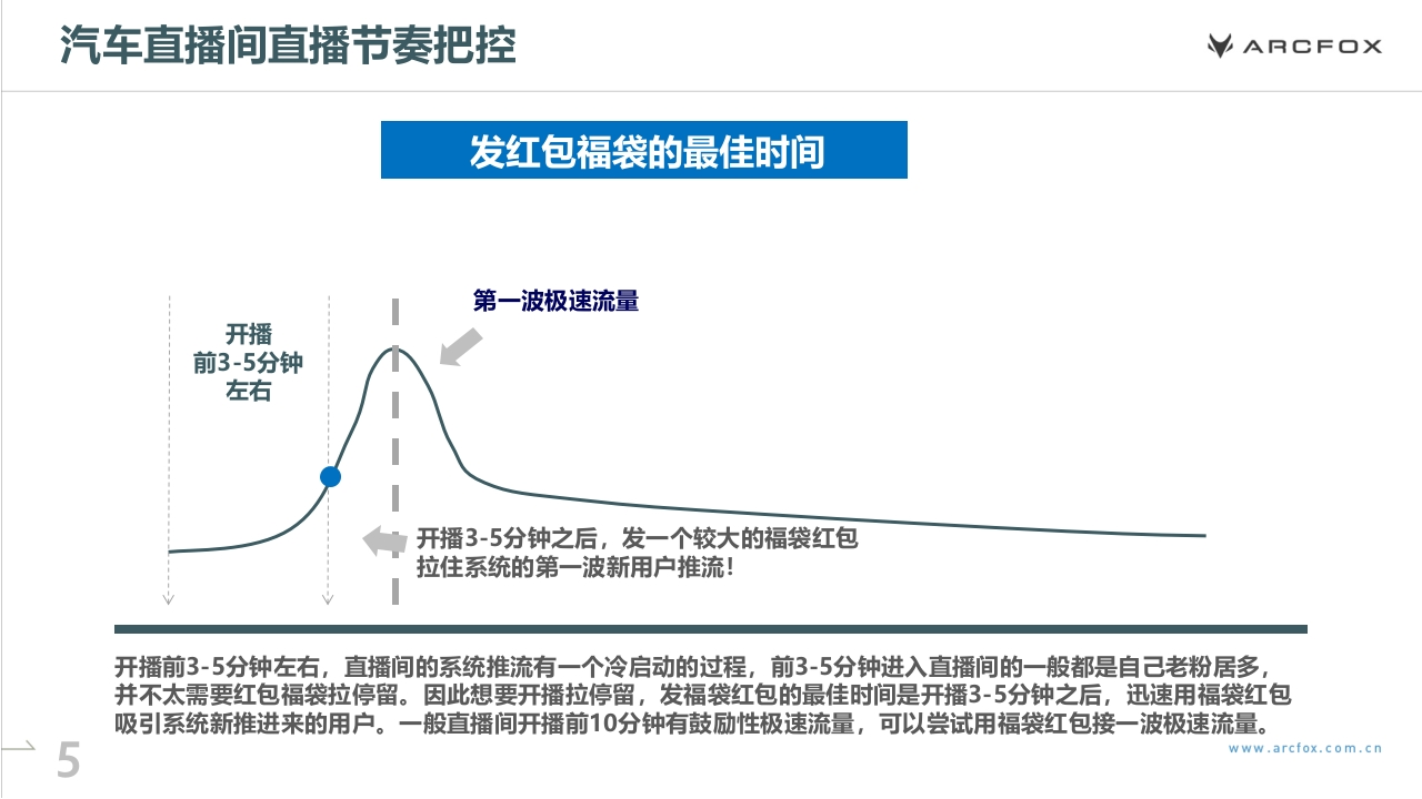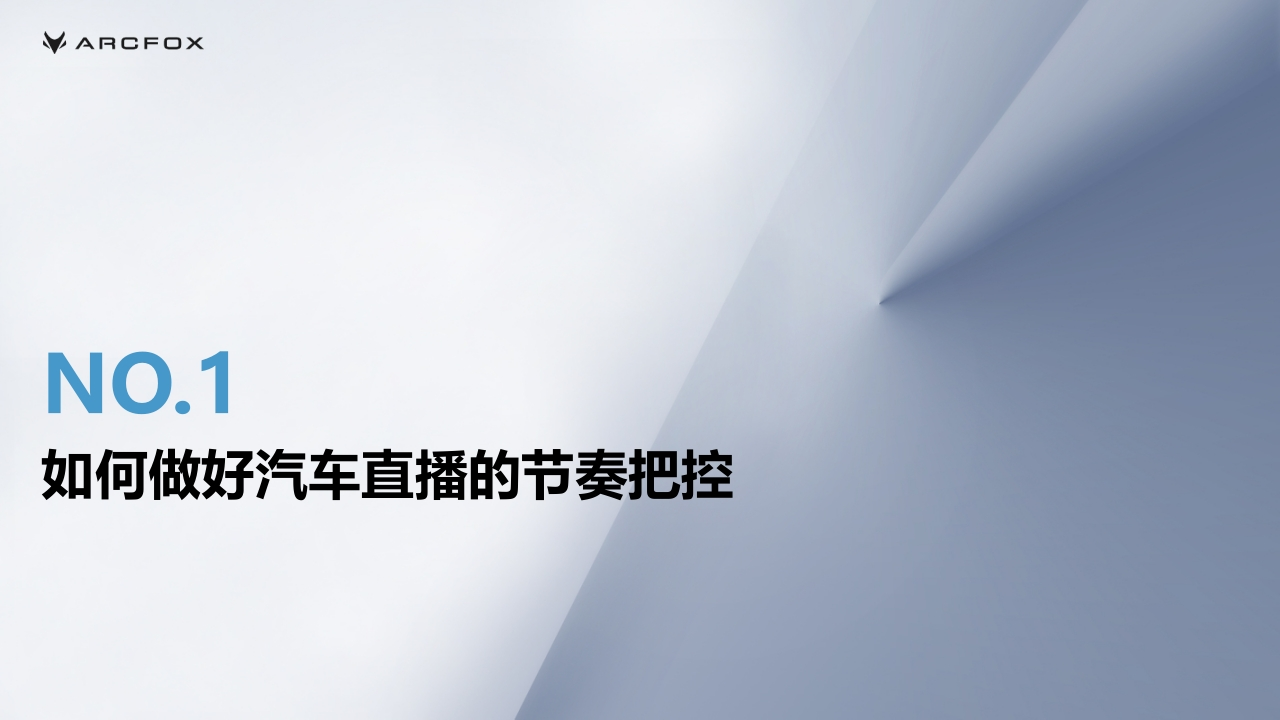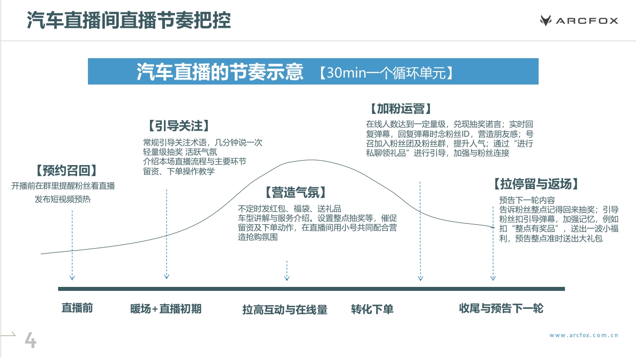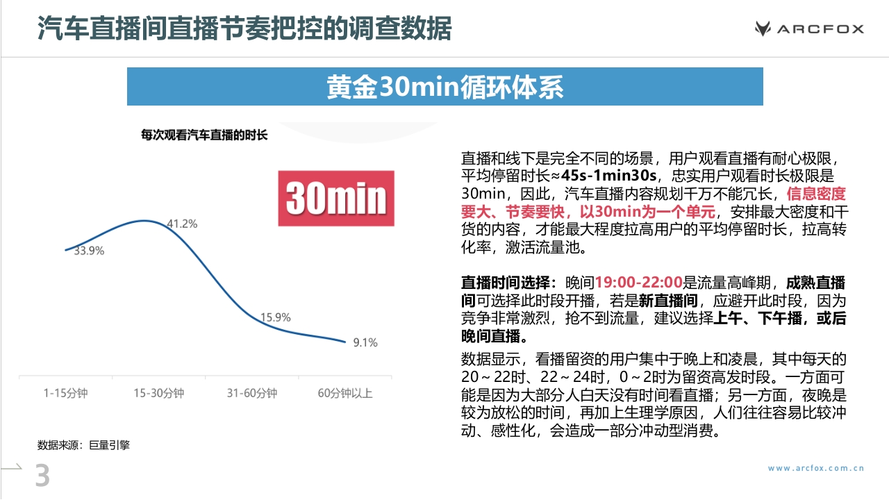VARCFOX极狐汽车经销商直播运营方案VARCE口X01如何做好汽车直播的节奏把控目录02汽车直播推荐模型及流量层级03汽车直播间复盘与优化的要点ARCF口XNO.1如何做好汽车直播的节奏把控汽车直播间直播节奏把控的调查数据ARCF口X黄金30min循环体系每次观看汽车直播的时长直播和线下是完全不同的场景,用户观看直播有耐心极限,平均停留时长≈45s-1min30s,忠实用户观看时长极限是30min30min,因此,汽车直播内容规划千万不能冗长,信息密度要大、节奏要快,以30min为一个单元,安排最大密度和干41.2%货的内容,才能最大程度拉高用户的平均停留时长,拉高转33.9%化率,激活流量池。直播时间选择:晚间19:00-22:00是流量高峰期,成熟直播间可选择此时段开播,若是新直播间,应避开此时段,因为15.9%竞争非常激烈,抢不到流量,建议选择上午、下午播,或后9.1%晚间直播。数据显示,看播留资的用户集中于晚上和凌晨,其中每天的20~22时、22~24时,0~2时为留资高发时段。一方面可1-15分钟15-30分钟31-60分钟60分钟以上能是因为大部分人白天没有时间看直播;另一方面,夜晚是较为放松的时间,再加上生理学原因,人们往往容易比较冲动、感性化,会造成一部分冲动型消费。数据来源:巨量引擎www arcfox.com.cn汽车直播间直播节奏把控ARCF口X汽车直播的节奏示意【30min一个循环单元】【加粉运营】【引导关注】在线人数达到一定量级,兑现抽奖诺言;实时回复弹幕,回复弹幕时念粉丝D,营造朋友感;号常规引导关注术语,几分钟说一次召加入粉丝团及粉丝群,提升人气;通过“进行轻量级抽奖活跃气氛私聊领礼品”进行引导,加强与粉丝连接介绍本场直播流程与主要环节【预约召回】留资、下单操作教学开播前在群里提醒粉丝看直播【拉停留与返场】发布短视频预热【营造气氛】预告下一轮内容不定时发红包、福袋、送礼品告诉粉丝整点记得回来抽奖;引导车型讲解与服务介绍。设置整点抽奖等,催促粉丝扣引导弹幕,加强记忆,例如留资及下单动作,在直播间用小号共同配合营扣“整点有奖品”,送出一波小福造抢购氛围利,预告整点准时送出大礼包直播前暖场+直播初期拉高互动与在线量转化下单收尾与预告下一轮www.arcfox.com.cn汽车直播间直播节奏把控ARCF口X发红包福袋的最佳时间第一波极速流量开播前3-5分钟左右开播3-5分钟之后,发一个较大的福袋红包拉住系统的第一波新用户推流!开播前3-5分钟左右,直播间的系统推流有一个冷启动的过程,前3-5分钟进入直播间的一般都是自己老粉居多并不太需要红包福袋拉停留。因此想要开播拉停留,发福袋红包的最佳时间是开播3-5分钟之后,迅速用福袋红包吸引系统新推进来的用户。一般直播间开播前10分钟有鼓励性极速流量,可以尝试用福袋红包接一波极速流量。www.arcfox.com.cn