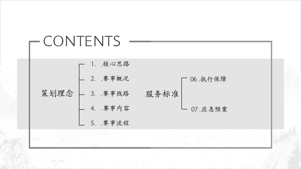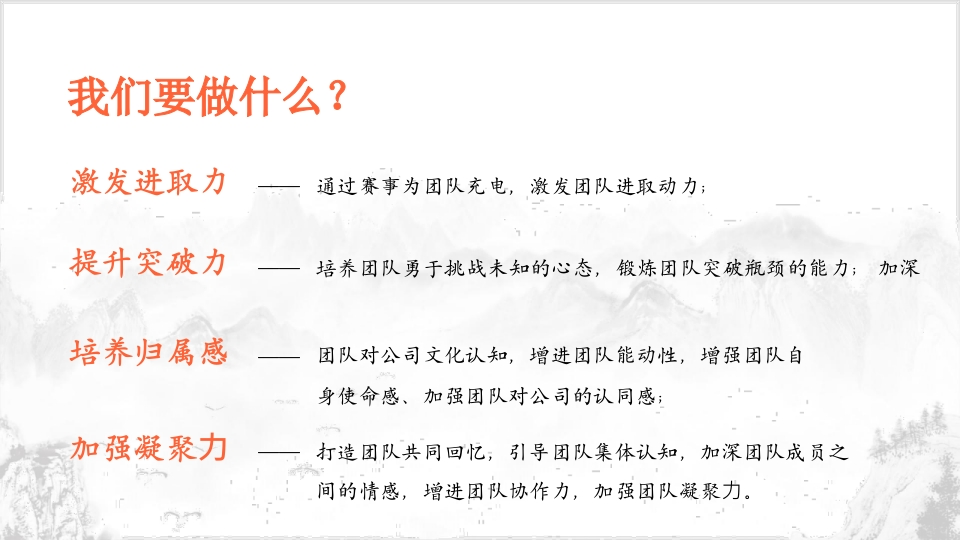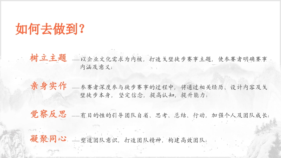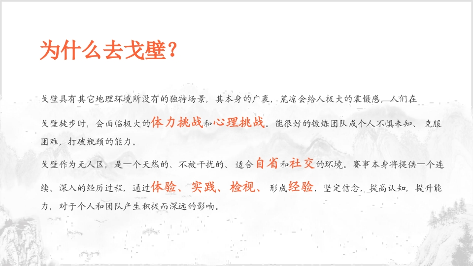 重走古商路·戈壁徒步挑战赛活动策划方案2025年中国·敦煌CONTENTS1.核心思路2..赛事概况06.执行保障策划理念3..赛事线路服务标准4..赛事内容07.应急预案5..赛事流程CONTENTS01核心思路为什么去戈壁?戈壁具有其它地理环境所没有的独特场景,其本身的广袤,荒凉会给人极大的震慑感,人们在戈壁徒步时,会面临极大的体力挑战和心理挑战。能很好的锻炼团队或个人不惧未知、克服困难,打破瓶颈的能力。戈壁作为无人区,是一个天然的、不被千扰的、适合自省和社交的环境。赛事本身将提供一个连续、深入的经历过程,通过体验、实践、检视、形成经验,坚定信念,提高认知,提升能力,对于个人和团队产生积极而深远的影响。我们要做什么?激发进取力通过赛事为团队充电,激发团队进取动力:提升突破力培养团队勇于挑战未知的心态,锻炼团队突破瓶颈的能力;加深培养归属感团队对公司文化认知,增进团队能动性,增强团队自身使命感、加强团队对公司的认同感;加强凝聚力打造团队共同回忆,引导团队集体认知,加深团队成员之间的情感,增进团队协作力,加强团队凝聚力。如何去做到?树立主题以企业文化需求为内核,打造戈壁徒步赛事主题,使参赛者明确赛事内涵及意义;亲身实作一参赛者深度参与徒步赛事的过程中,将通过相关经历、设计内容及戈壁徒步本身,坚定信念,提高认知,提升能力;觉察反思一一有目的性的引导团队自省、思考、总结、行动,加强个人及团队成长:凝聚同心,二塑造团队意识,打造团队精神,构建高效团队: