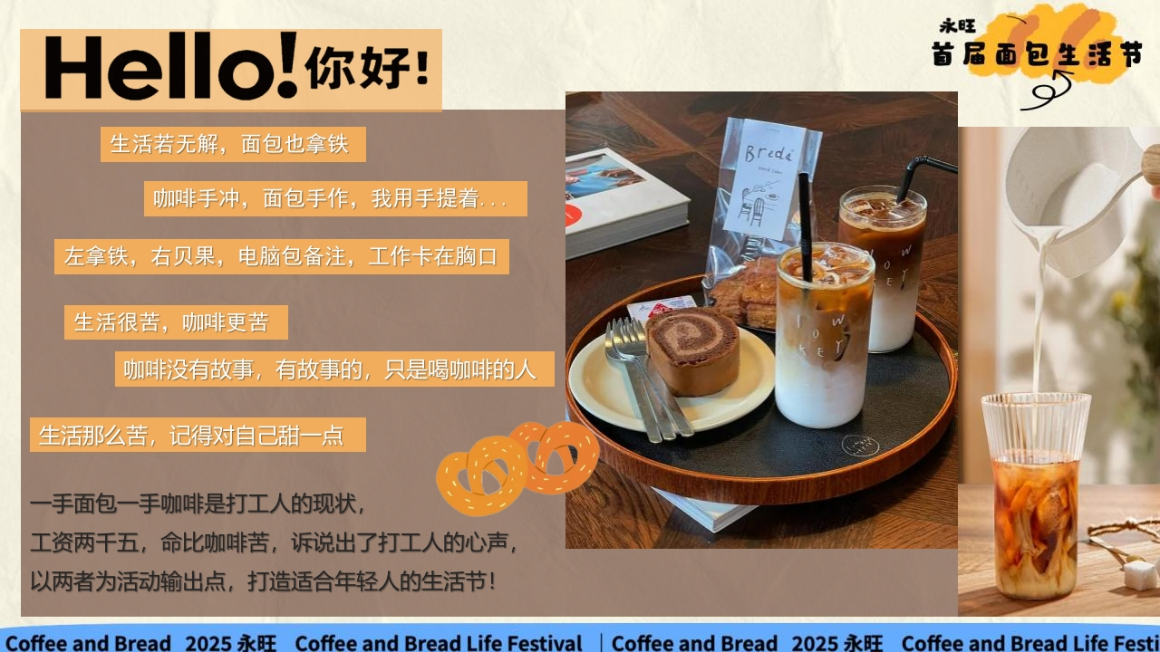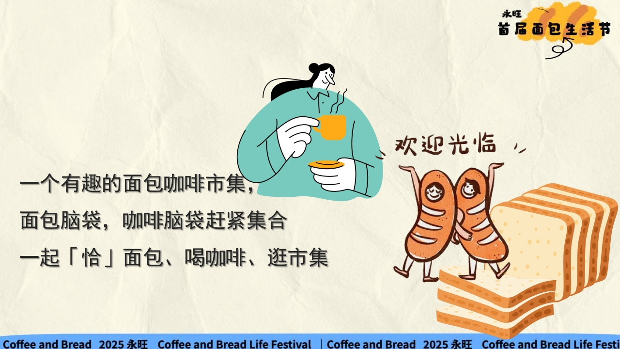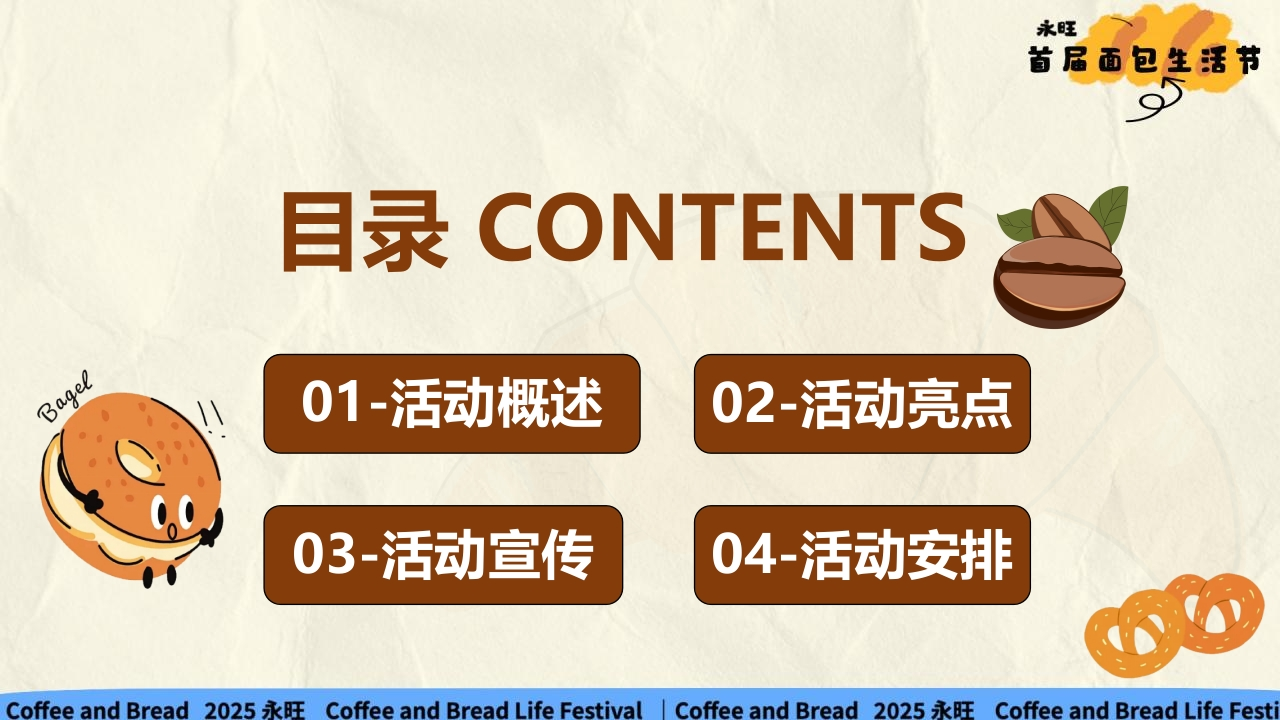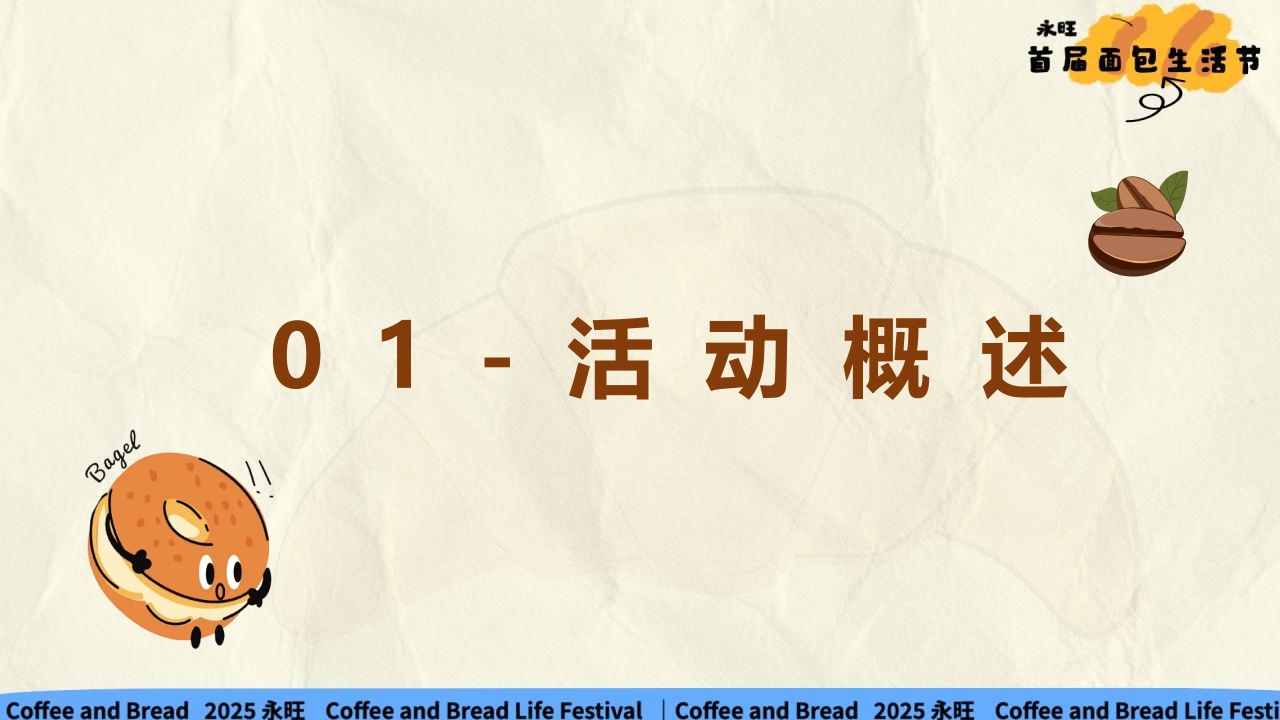 TOBAKE永王首届面臭生活节碳水漫游计到Go!每一▣部是与众不同永旺Heo!你好:首届面包生活节生活若无解,面包也拿铁Brede咖啡手冲,面包手作,我用手提着,左拿铁,右贝果,电脑包备注,工作卡在胸口生活很苦,咖啡更苦咖啡没有故事,有故事的,只是喝咖啡的人ALL0生活那么苦,记得对自己甜一点手面包一手咖啡是打工人的现状工资两干五,命比咖啡苦,诉说出了打工人的心声,以两者为活动输出点,打造适合年轻人的生活节!Coffee and Bread 2025 Coffee and Bread Life Festival Coffee and Bread 2025 Coffee and Bread Life Festi永旺首届面包生活节咖啡x面包x碰撞一个可以用来续命的面包咖啡生活节,让打工生活变得十分膨胀UUDre:烘焙COFFEEREPUBLICCoffee and Bread 2025 Coffee and Bread Life Festival Coffee and Bread 2025 Coffee and Bread Life Festi永旺首届面包生活节欢迎光临一个有趣的面包咖啡市集,©面包脑袋,咖啡脑袋赶紧集合一起「恰」面包、喝咖啡、逛市集Coffee and Bread 2025 Coffee and Bread Life Festival Coffee and Bread 2025 Coffee and Bread Life Festi永旺首届面包生活节目录CONTENTSBagee01-活动概述02-活动亮点03-活动宣传04-活动安排Coffee and Bread 2025 Coffee and Bread Life Festival Coffee and Bread 2025 Coffee and Bread Life Festi永旺首届面包生活节01-氵活动概述BagelCoffee and Bread 2025 Coffee and Bread Life Festival Coffee and Bread 2025 Coffee and Bread Life Festi