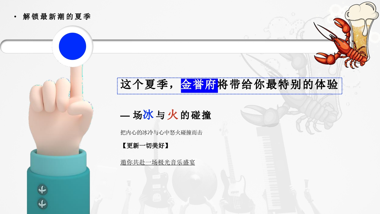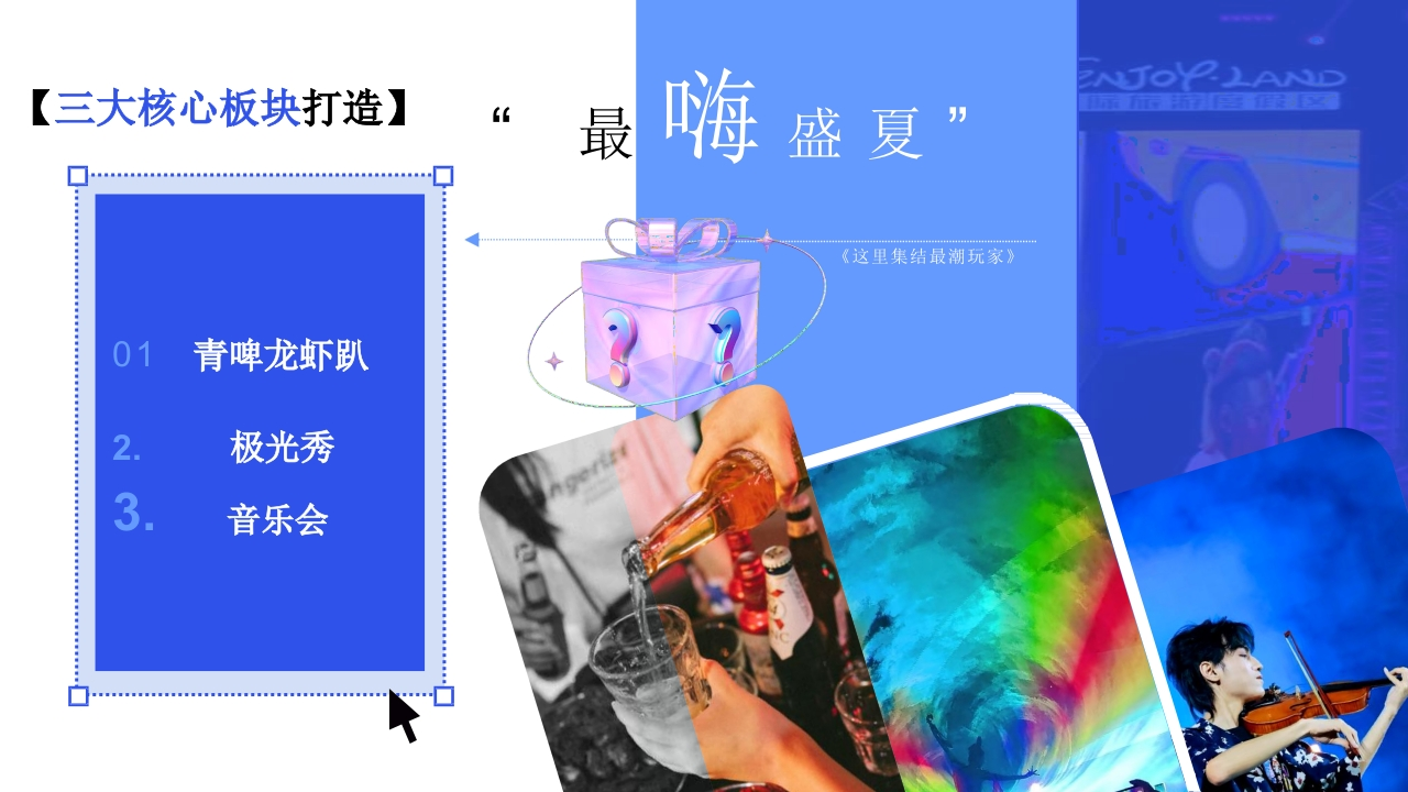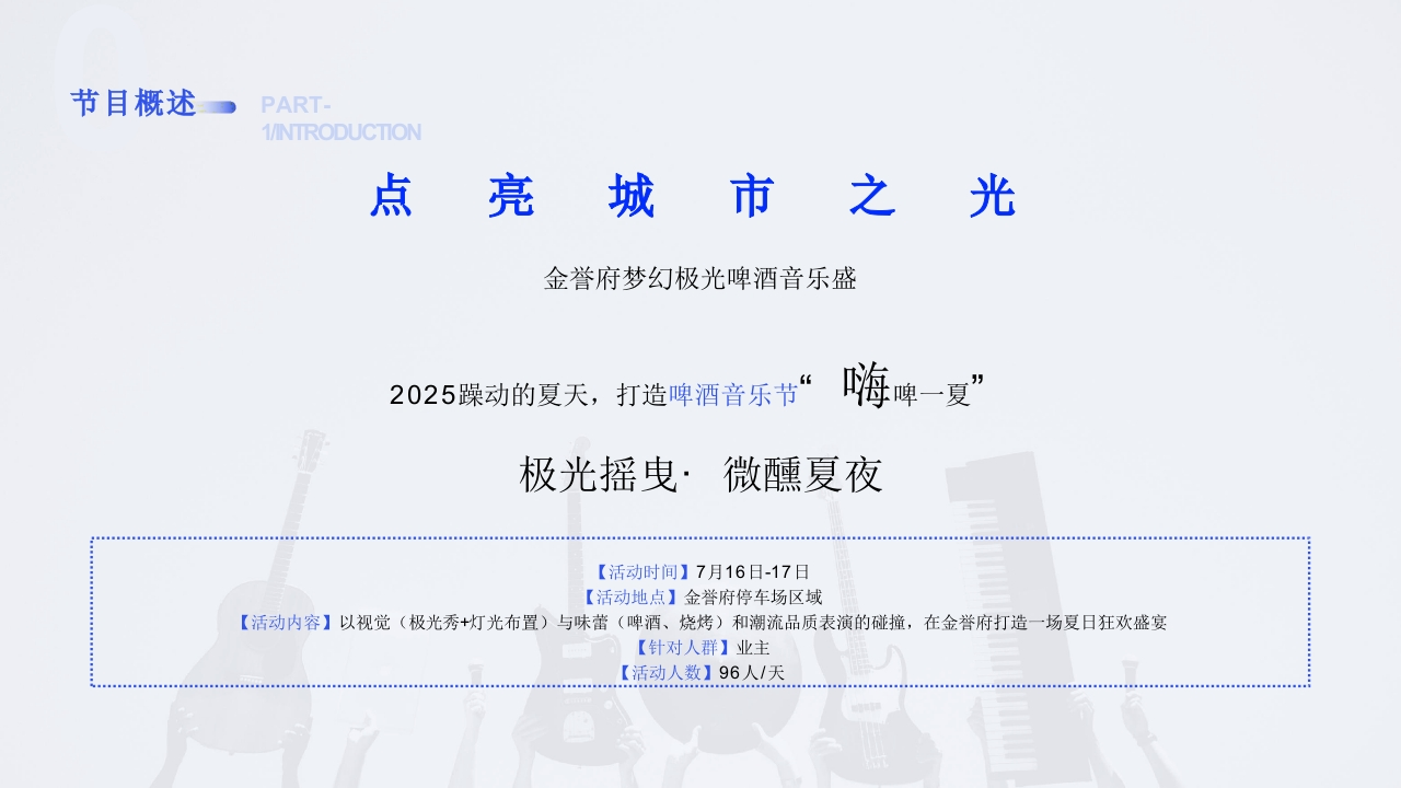 Jinyufu Aurora Bees Music east追芝金誉府极光脾盛多极光追梦。来金誉府嗨啤一夏·极光追梦来金誉府嗨啤一夏·来金誉府嗨啤一夏·极光追梦来金誉府嗨啤·解锁最新潮的夏季这个夏季,金誉府将带给你最特别的体验一场冰与火的碰撞把内心的冰冷与心中怒火碰撞而击【更新一切美好】邀你共赴一场极光音乐盛宴PART-4Event dissemination【活动传播】DRO活动目录PART-3Activity contentPART-1Program Overview【节目概述】(活动内容】。PART-5Activity SupportPART-2Site layout【活动保障】【现场布置】:活动概述▣P a r t6节目概述。PART-1/INTRODUCTION点亮城市之光金誉府梦幻极光啤酒音乐盛2025躁动的夏天,打造啤酒音乐节“海啤一夏”极光摇曳·微醺夏夜【活动时间】7月16日-17日【活动地点】金誉府停车场区域【活动内容】以视觉(极光秀+灯光布置)与味蕾(啤酒、烧烤)和潮流品质表演的碰撞,在金誉府打造一场夏日狂欢盛宴【针对人群】业主【活动人数】96人/天【三大核心板块打造】“最嗨盛夏”☐小《这里集结最潮玩家》01青啤龙虾趴2极光秀3.音乐会