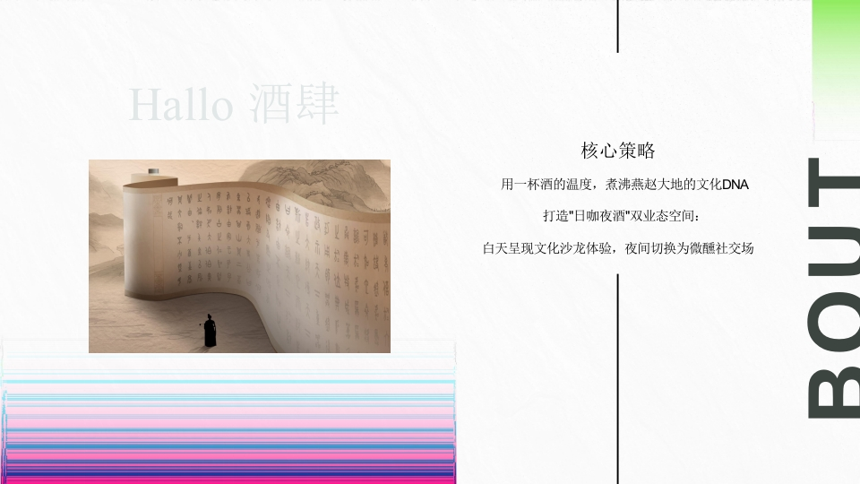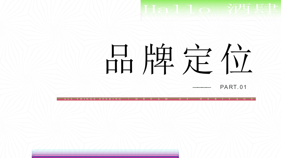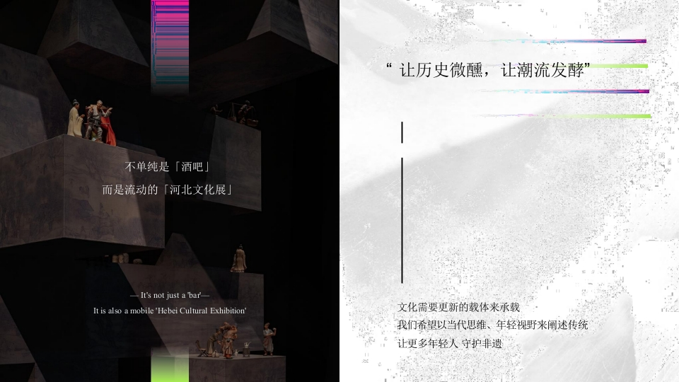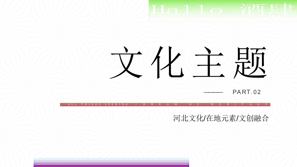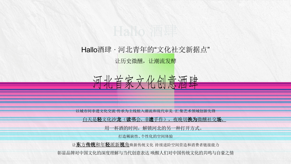 Hallo,酒肆2025.6品牌营销推广方案上@。西丰品牌定位PART.01日allo酒建核心策略用一杯酒的温度,煮沸燕赵大地的文化DNA豆1月1生61年3901g可1发个白共名用封3装1打造"日咖夜酒"双业态空间:车数又占电y青每又于大大里8山大为119h无义1白天呈现文化沙龙体验,夜间切换为微醺社交场113g下月=小1线1B月来的号入h18号11LO8让历史微醺,让潮流发酵”不单纯是「酒吧」而是流动的「河北文化展」It's not just a bar-It is also a mobile 'Hebei Cultural Exhibition文化需要更新的载体来承载我们希望以当代思维、年轻视野来阐述传统让更多年轻人守护非遗Ha1o酒建Hallo酒肆·河北青年的“文化社交新据点”让历史微醺,让潮流发酵河北首家文化创意酒肆以城市间非遗文化交流传承为主线植入潮流和现代审美汇集艺术领域创新先锋白天是轻文化沙龙(读书会、非遗于作),夜晚切换为微睡社交场,用一杯酒的时间,解锁河北的另一种打开方式。打造稀缺性、个性化的空间体验让东方传统和年轻派新视角焕新传统文化持续进阶空间营造和消费者链接能力彰显品牌对中国文化的深度理解与当代创意表达唤醒人们对中国传统文化的共鸣与自豪之情文化主题PART.02河北文化/在地元素/文创融合