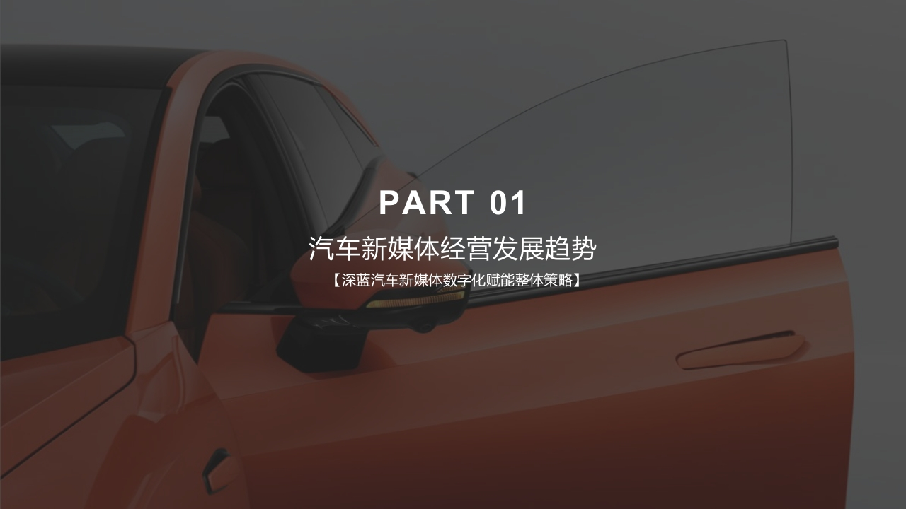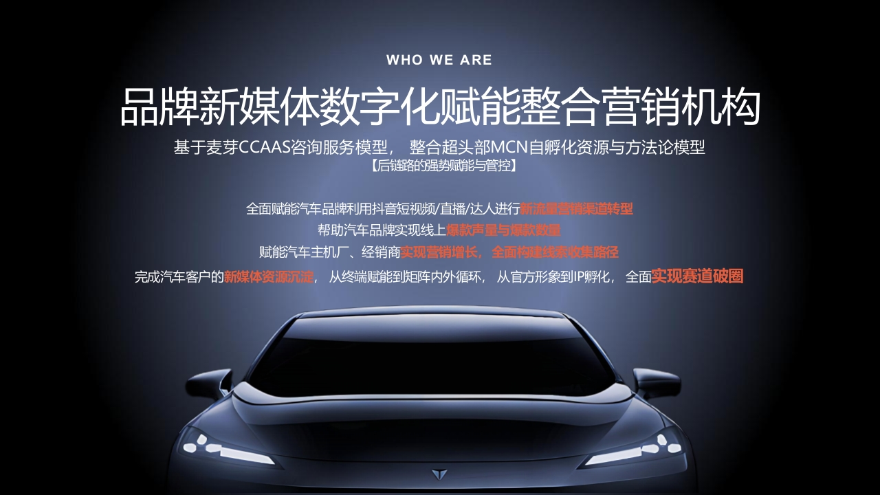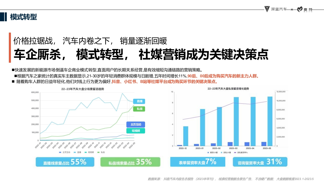 麦月深蓝汽车2024年抖音数字化营销全案WHO WE ARE品牌新媒体数字化赋能整合营销机构基于麦芽CCAAS咨询服务模型,整合超头部MCN自孵化资源与方法论模型【后链路的强势崩能与管控】全面赋崩能汽车品牌利用抖音短视频/直播/达人进行新流量营销渠道转型帮助汽车品牌实现线上爆款声量与款数量赋能汽车主机厂、经销商实现营销增长,全面构建线索收嫌路径完成汽车客户的新媒体资源沉淀,从终端赋能到矩阵内外循环,从官方形象到P孵化,全面实现赛道破圈中国新媒体整合营销MCN机构全国第一内容孵化平台西南第一传播资源整合平台汽车营销内容孵化/线索增长2013-202411年新媒体领域探索出真知平台内容风向标创意内容孵化场数据增长方法论第一手平台玩法最顶尖的内容团队多年一线实战经验最新鲜政策风向最精尖的制作团队方法路赋能正增长PART 01汽车新媒体经营发展趋势【深蓝汽车新媒体数字化赋能整体策略】了深蓝汽车×一妻荐模式转型价格拉锯战,汽车内卷之下,1销量逐渐回暖车企厮杀,模式转型,社媒营销成为关键决策点■快速发展的新能源市场倒逼车企商业模式转型,直面用户的长期关系经营,是有效缩短沟通链路的营销策略■根据汽车之家统计的真实车主数据显示,21-30岁的年轻消费群体规模与日剧增,五年时间增长11%,90后、00后成为购买汽车的新主力人群。■随着购车人群的日益年轻化,他们对线上行为更为偏好,抖音、小红书、B站等社媒平台成为购买环节的关键决策点。22-23年汽车大盘分场景留咨趋势22-23年汽车大壁私信留咨增长趋势600,00012.030,000500,000直播0.000.000400,00c私信4,000,0300,000200,000主页互动100,000短视频2,00c,002023-052022-152023022023-032023-042023-0■主页互动直■短视频私信■雷W理重法起V理■运私留面率%直播线索量古此55%私信线素量占比35%表单留资率太盘7%咨询留资率大盘31%数据来源:料音汽车内容生态报告(2023半年刊功,线燕经营数据含原生广告,不含硬广数据·大盘数据维度2023.12023.5