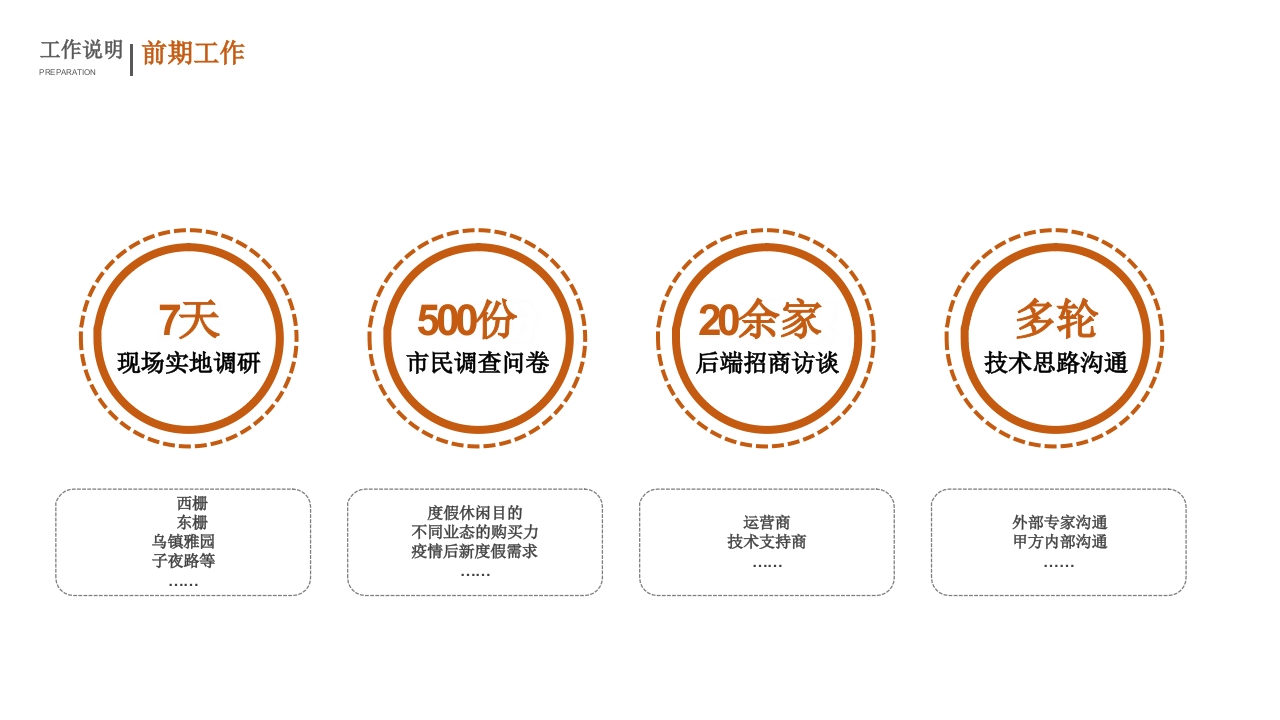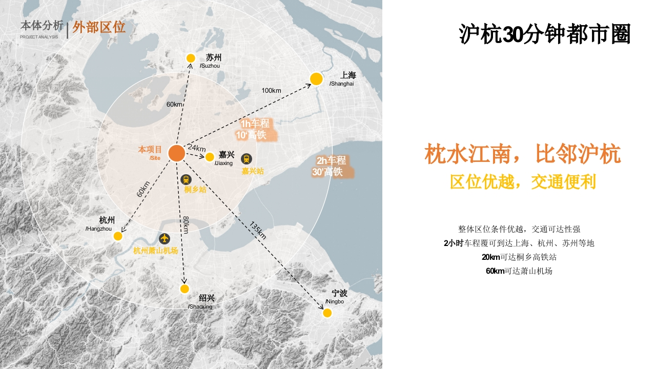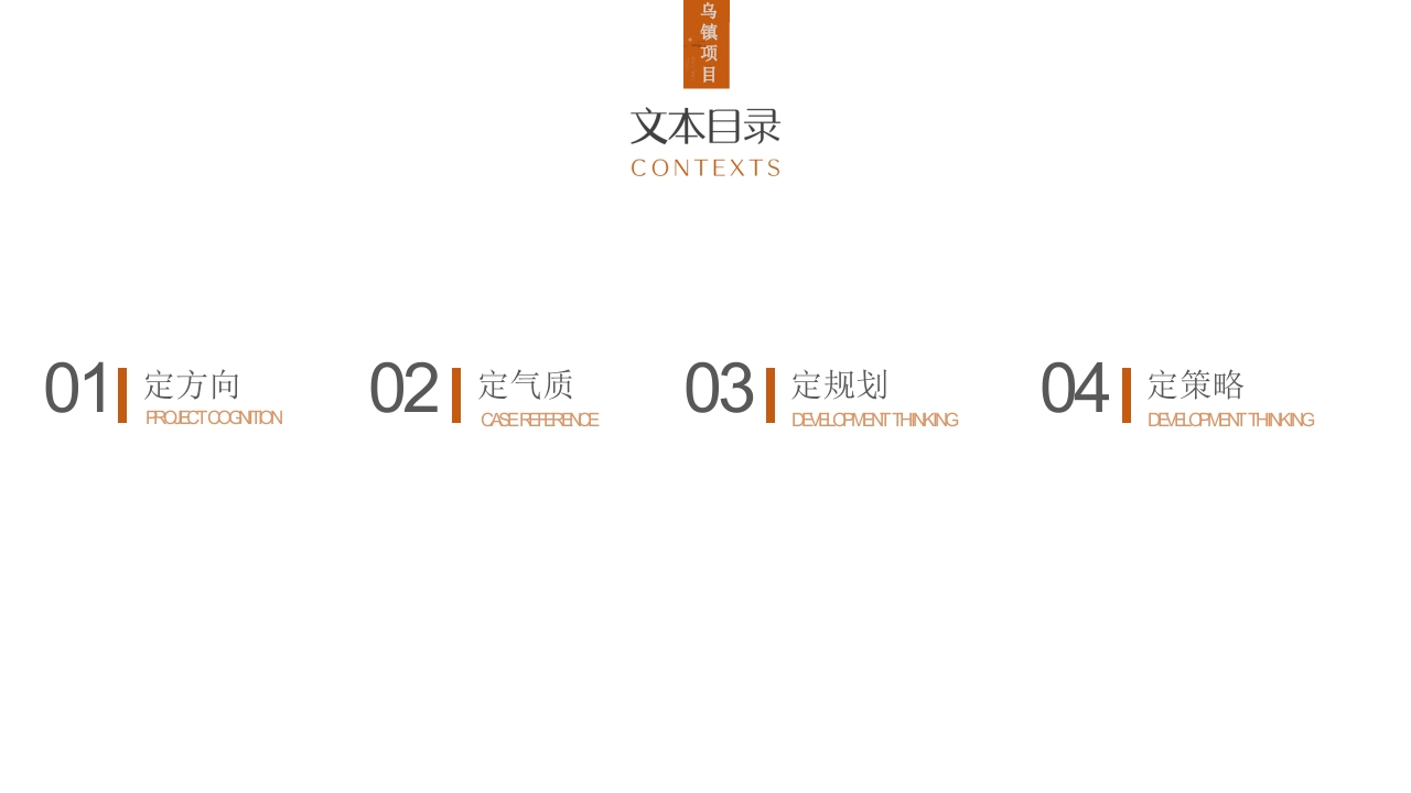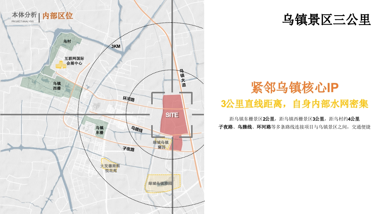 文旅地产江南乌镇概念规划方案项文本目录CONTEXTS011定方向021定气质031定规划041定策略FROECT COGNTIONCASEREFER阳NOEDEVELCFMENT THNKKNGDEVELOPMENT THNKKNG工作说明1前期工作PREPARATION7天500份20余家多轮现场实地调研市民调查问卷后端招商访谈技术思路沟通西栅东栅度假休闲目的不同业态的购买力运营商外部专家沟通乌镇雅园子夜路等疫情后新度假需求技术支持商甲方内部沟通…PART 01定方向Determine the position背景·对标·客群Background Cases.Customer本体分析外部区位PROJECT ANALYSIS沪杭30分钟都市圈苏州A/Suzhou上海/Shanghai100km60kmi1h车程10°高铁本项目24km/Site>●嘉兴Jiaxing2h车程枕水江南,比邻沪杭嘉兴站30高铁60km桐乡站、区位优越,交通便利杭州/Hangzhou135km整体区位条件优越,交通可达性强2小时车程覆可到达上海、杭州、苏州等地杭州萧山机场!20km可达桐乡高铁站60km可达萧山机场宁波纽兴/Ningbo本体分析」内部区位乌镇景区三公里乌村3KM互联网国际会展中心乌镇镇大道西栅紧邻乌镇核心P环湔路3公里直线距离,自身内部水网密集SITE距乌镇东栅景区2公里,距乌镇西栅景区3公里,距乌村约4公里鸟镇乌塍线子夜路、乌塍线、环河路等多条路线连接项目与乌镇景区之间,交通便捷东栅绿城乌镇子夜路蘭园大发德商熙悦花苑绿城乌镇雅园