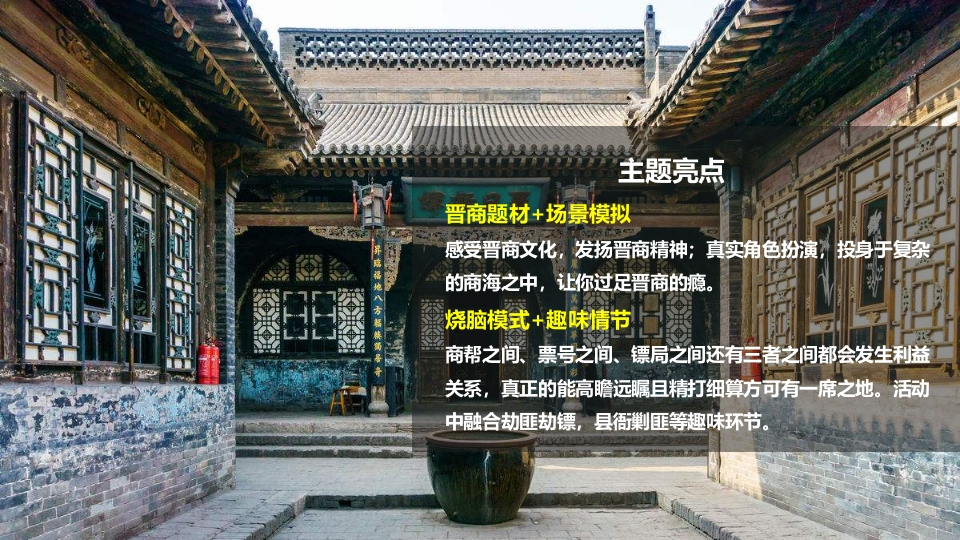 大型云商文化主题谐腔足佛银帝國无有目录CONTENTS01异020304活动设地推家活动内容置活动设计01主题创意·活动亮点活动价值情景导入线好公主题创意《白银帝国》主题活动舱创意来源于长篇小说《白银谷》,活动模拟清代时期震惊中外的晋商经商的场景,重现山西票号、镖局、商帮在清代时期的鼎盛情景。你们将穿越回清代的山西平遥,开启一段传奇的晋商之旅。主题亮点晋商题材+场景模拟家感授晋商文化,发扬晋商精神;真实角色扮演,投身于复杂的商海之中,让你过足晋商的瘾。烧脑模式+趣味情节铁商帮之间、票号之间、镖局之间还有三者之间都会发生利谥关系,真正的能高瞻远瞩且精制打细算方可有一席之地。活动中融合劫匪劫镖,县剿匪等趣味环节。田公八公烟t八0公公公公福0四0活动价值感受晋商文化,发扬晋商精神;有效提升团队沟通力、执行力;◆个人领导力和团那队智慧的高度考验敏锐的洞察力和决策能力: