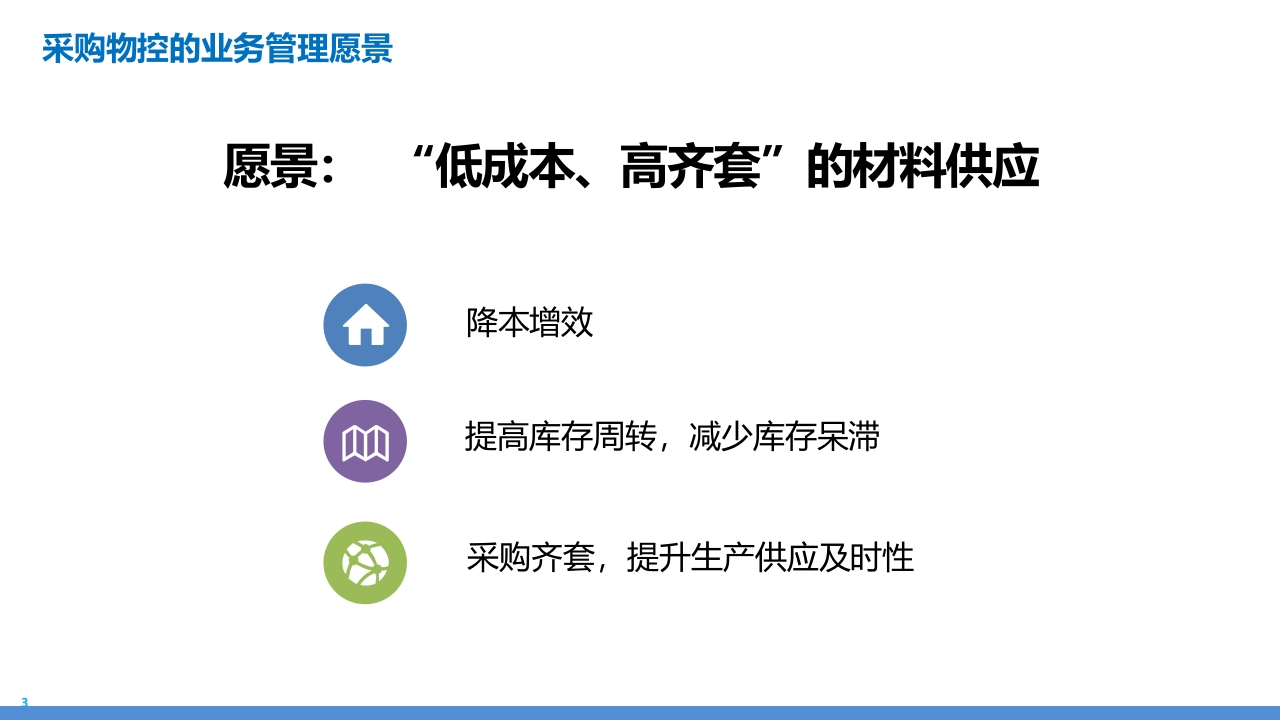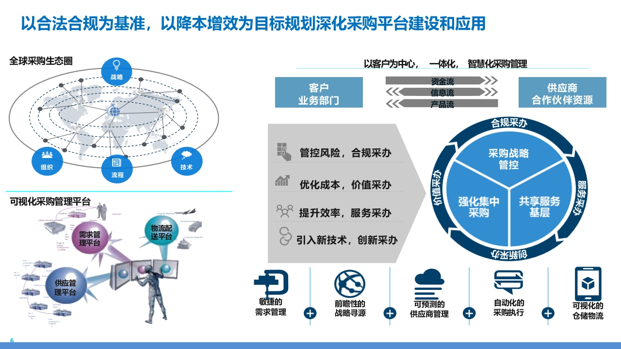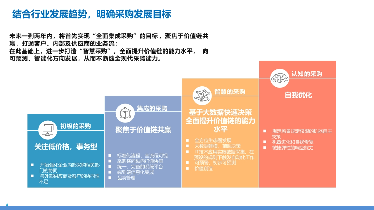 国制造业采购供应链业务流程蓝图规划目录业务流程体系设计聚焦用户体验的全面需求调研三业务能力提升机会整体识别四总结与后续计划采购物控的业务管理愿景愿景:“低成本、高齐套”的材料供应降本增效提高库存周转,减少库存呆滞分采购齐套,提升生产供应及时性结合行业发展趋势,明确采购发展目标未来一到两年内,将首先实现“全面集成采购”的目标,聚焦于价值链共赢,打通客户、内部及供应商的业务流:在此基础上,进一步打造“智慧采购”,全面提升价值链的能力水平,向可预测、智能化方向发展,从而不断健全现代采购能力。认知的采购智慧的采购自我优化集成的采购基于大数据快速决策全面提升价值链的能力初级的采购聚焦于价值链共赢水平规定场景规定权限的机器自主决策全方位生态圈发展机器进化和自我修复关注低价格,事务型大数据建模,辅助决策■敏捷弹性的响应能力■T技术应用实施数据采集,在■标准化流程、全流程可视预设的规则下触发自动化工作■采购横向纵向打通协同■开始强化企业内部采购相关部可预警,初步可预测■统一、完备的系统平台门的协同■价值创造■端到端信息化集成■与外部供应商及客户的协同性◆品类管理不足以目标导向,向战略采购智慧采购管理升级·通过对标,明确战略发展目标及路径客户认如的采测供应合作饮件查酒明确向战略采购智产品电的自我优化分果于大快速决慧采购管理转型:初的深购聚焦于价值甚共富水平采办职能向供需两关注低价格,事务型端延展:。通过从至上而下的管理体系梳理(从战略定位,业务模式到信息系统),识别提升方向1个战略采购管理体系架构果办反责采办战略.定位战略定位果执行管理供应同职责梳理打造以品类管理为业烤需求组织架构与管控横式运作机制核心的一体化运作机制:醛实现总成本最低a6大业务模块绩效与合规管理供应商前理供应链数字化系统1个数字化平台以合法合规为基准,以降本增效为目标规划深化采购平台建设和应用全球采购生态圈以客户为中心,一体化,智慧化采购管理战略资金流客户信息流供应商业务部门产品流合作伙伴资源合规采办管控风险,合规采办采购战略组织国技术管控流程优化成本,价值采办可视化采购管理平台强化集中共享服务8o8提升效率,服务采办采购基层物流配需求管送平台理平台8引入新技术,创新采办迷嘿的供应管理平台敏捷的前瞻性的可预测的自动化的可视化的需求管理战略寻源供应商管理采购执行仓储物流